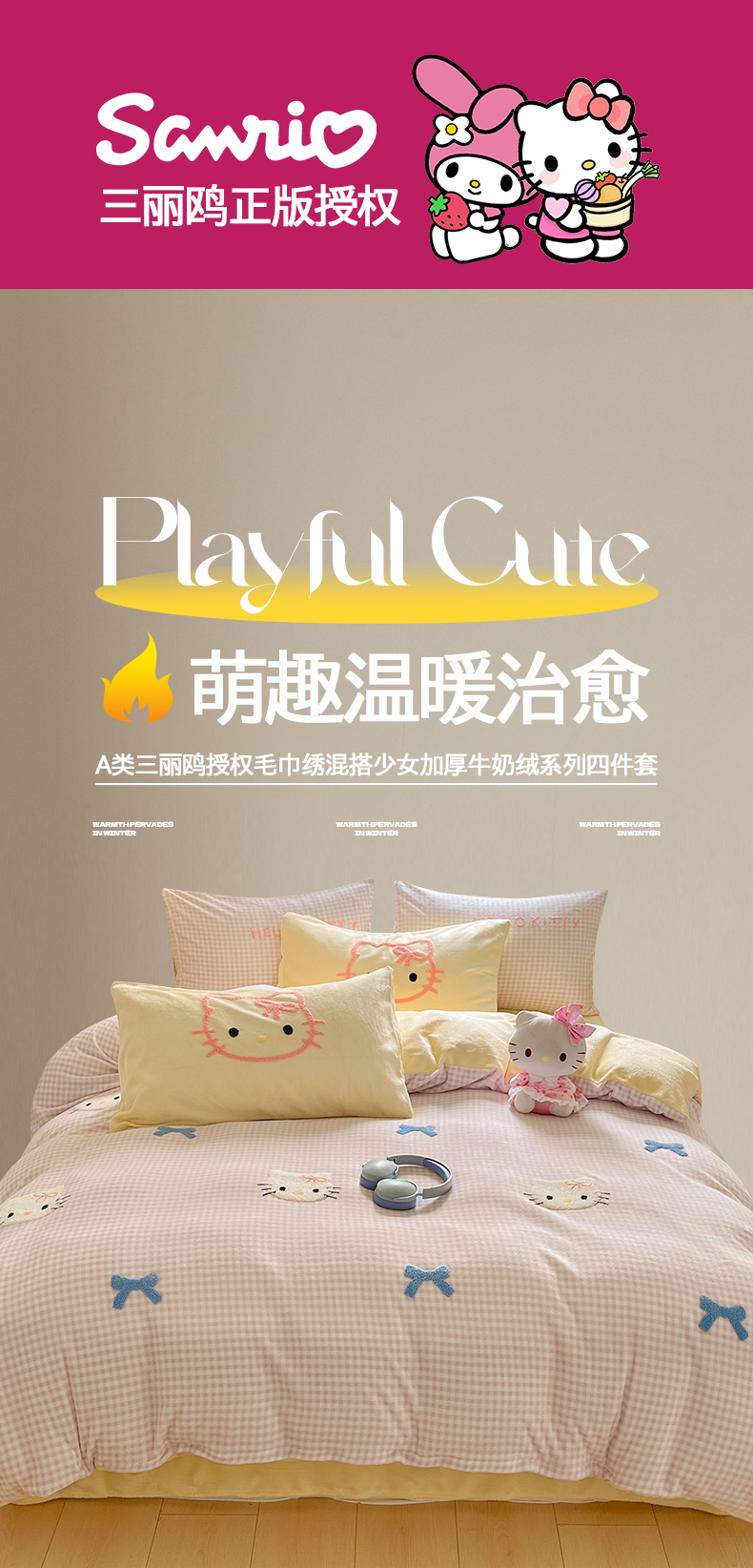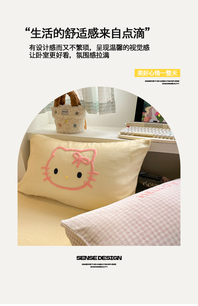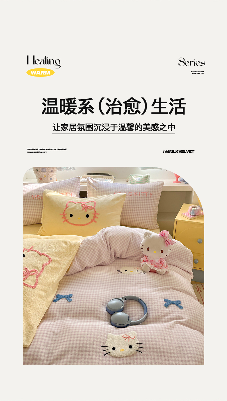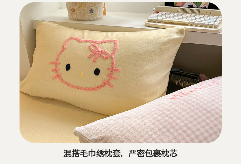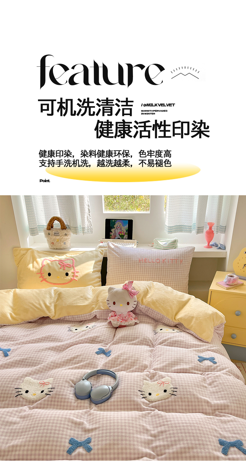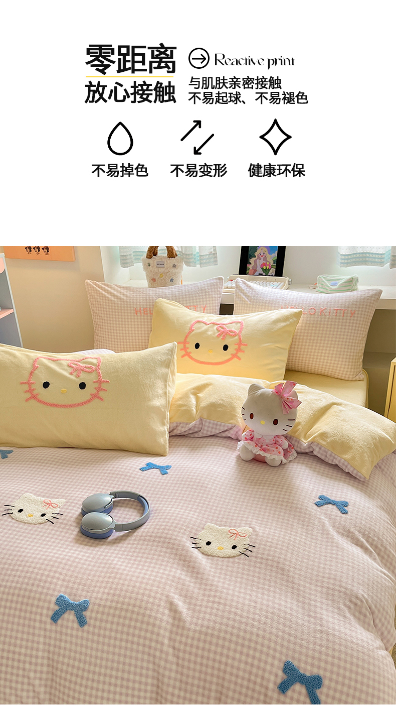 当前位置: 91家纺网 > 商品网购 > 床品套件 > 四件套 > 牛奶绒四件套 > 金爱家 2025新款A类三丽鸥授权毛巾绣混搭少女加厚牛奶绒系列四件套 绒毛巾绣-蝴蝶结KT紫黄