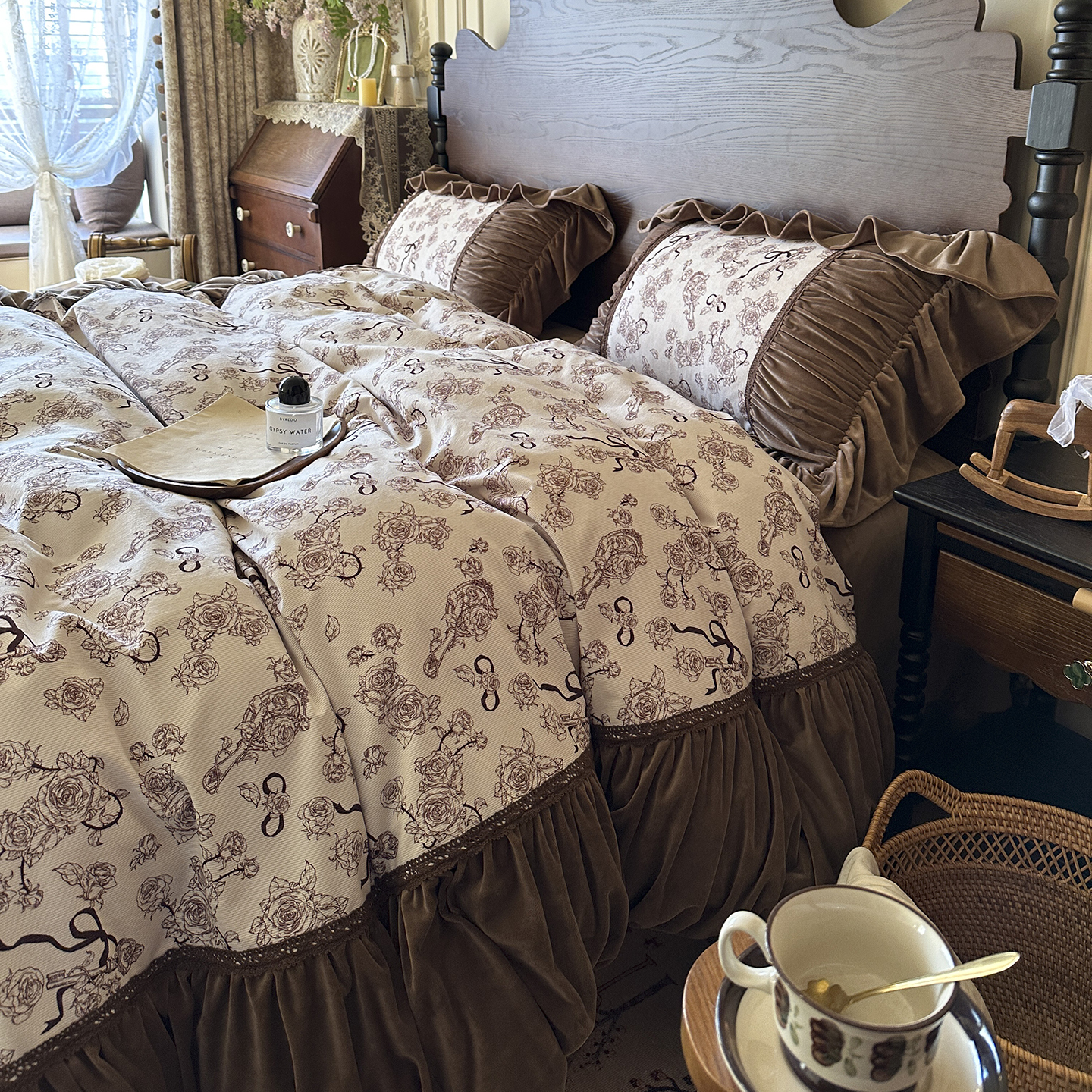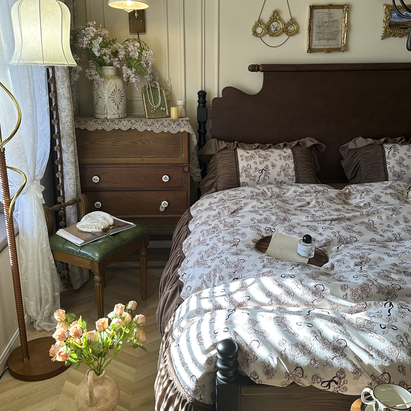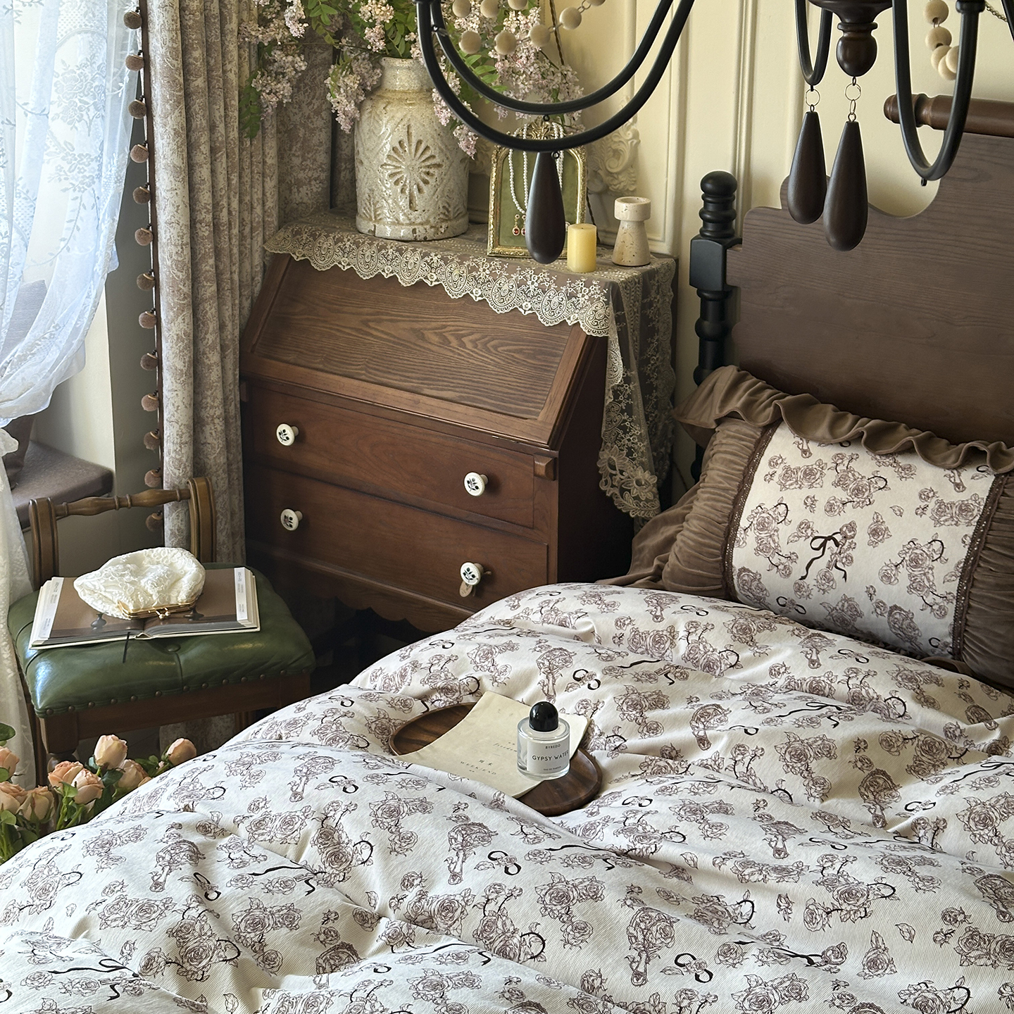 (总)多乐娜 2025年新款轻法式复古风纯棉色织双层纱四件套花边全棉工艺款,沐光栗棕,沐光绿蔓