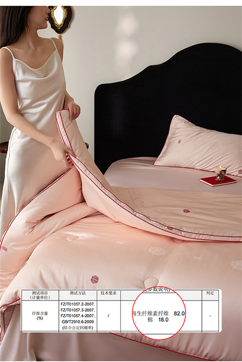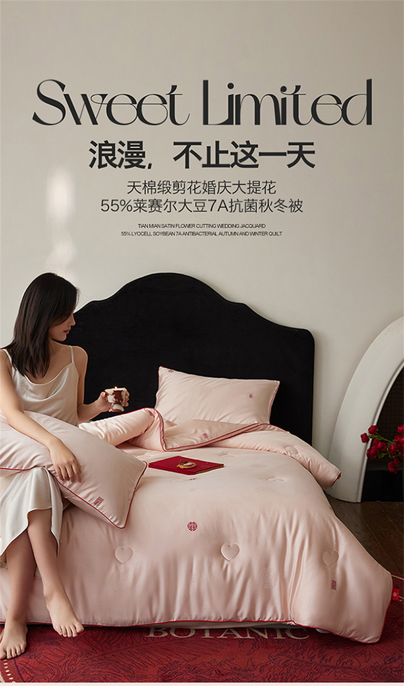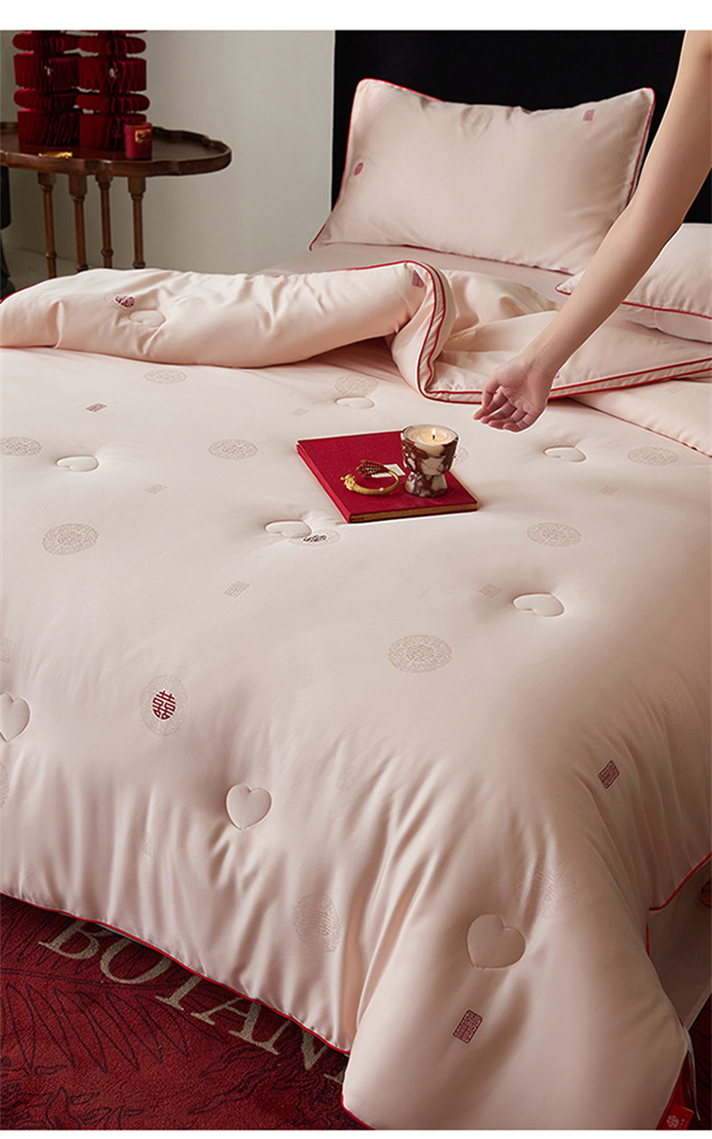 商品名称:头等舱 2025新款天棉缎剪花婚庆大提花55莱赛尔大豆7A抗菌秋冬被(模特图) 吾家有喜-嫩粉
