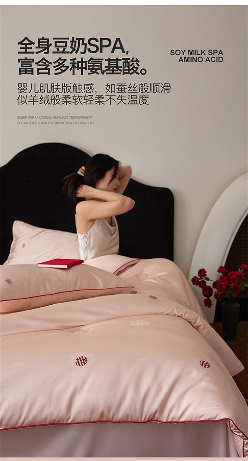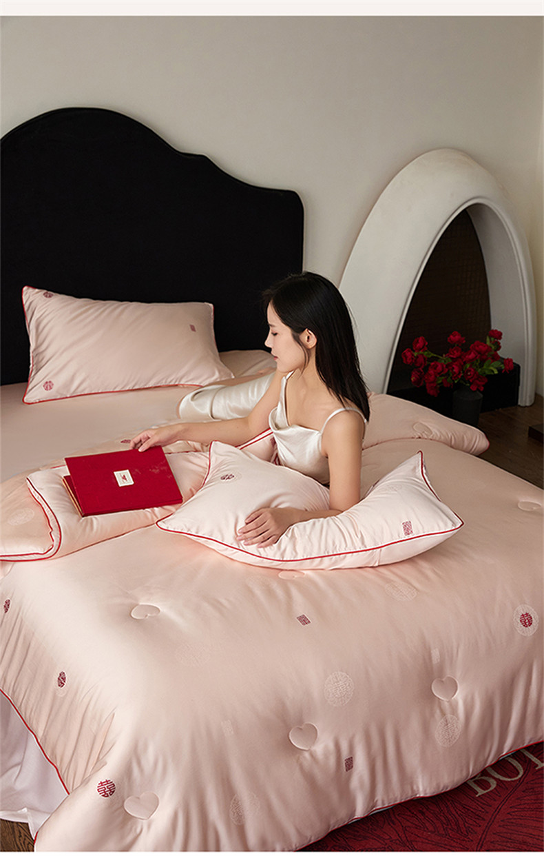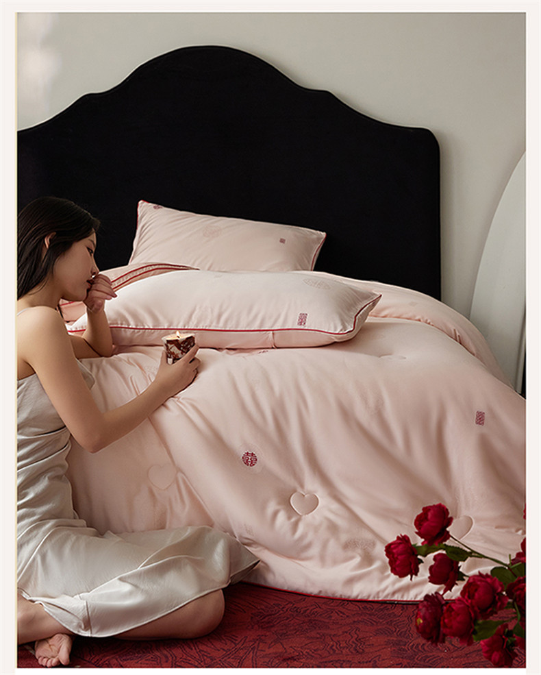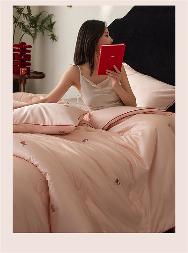 商品名称:头等舱 2025新款天棉缎剪花婚庆大提花55莱赛尔大豆7A抗菌秋冬被(模特图) 吾家有喜-嫩粉