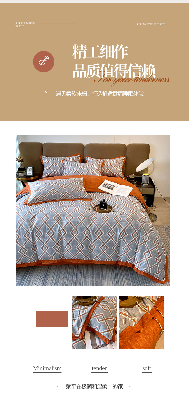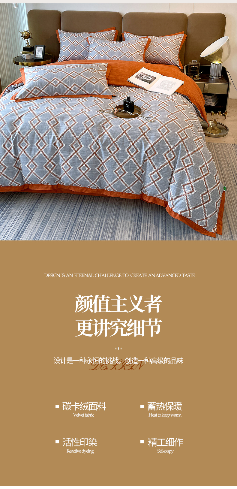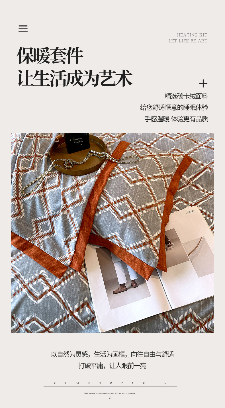 商品名称:恩和家纺 2026新款森能量碳纤维环保四件套系列 碳卡绒-桔格烟灰