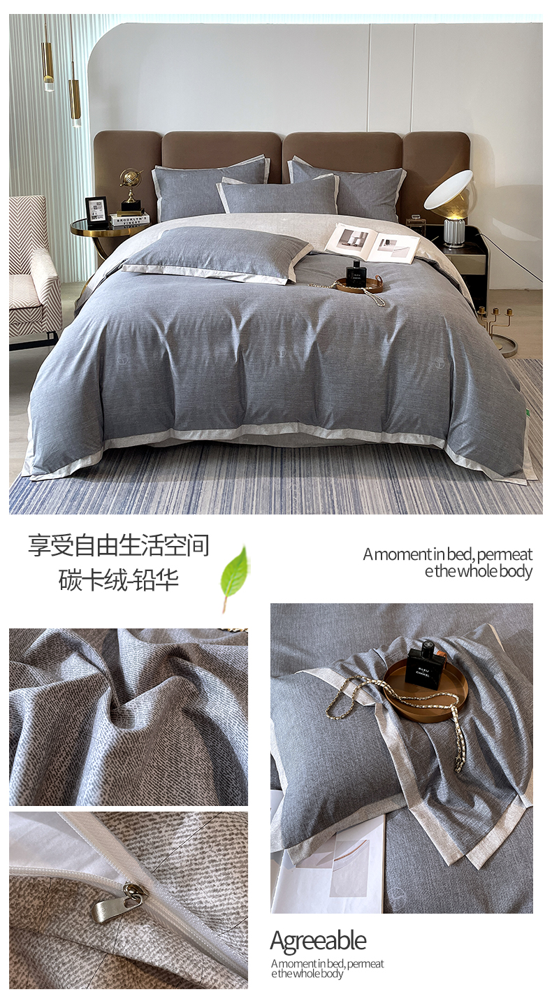 恩和家纺 2026新款森能量碳纤维环保四件套系列 碳卡绒-桔格烟灰