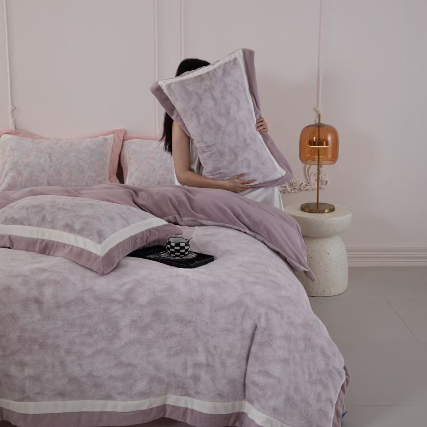 (总)玖琳家纺 2025新款双面高端高克重兔绒毛牛奶绒轻奢款四件套- 时光系列,粉白条,黑白条,灰白条