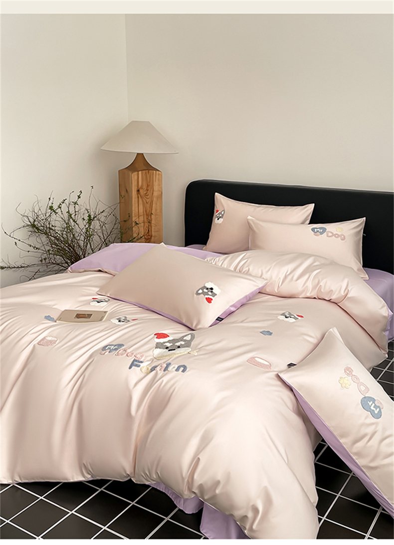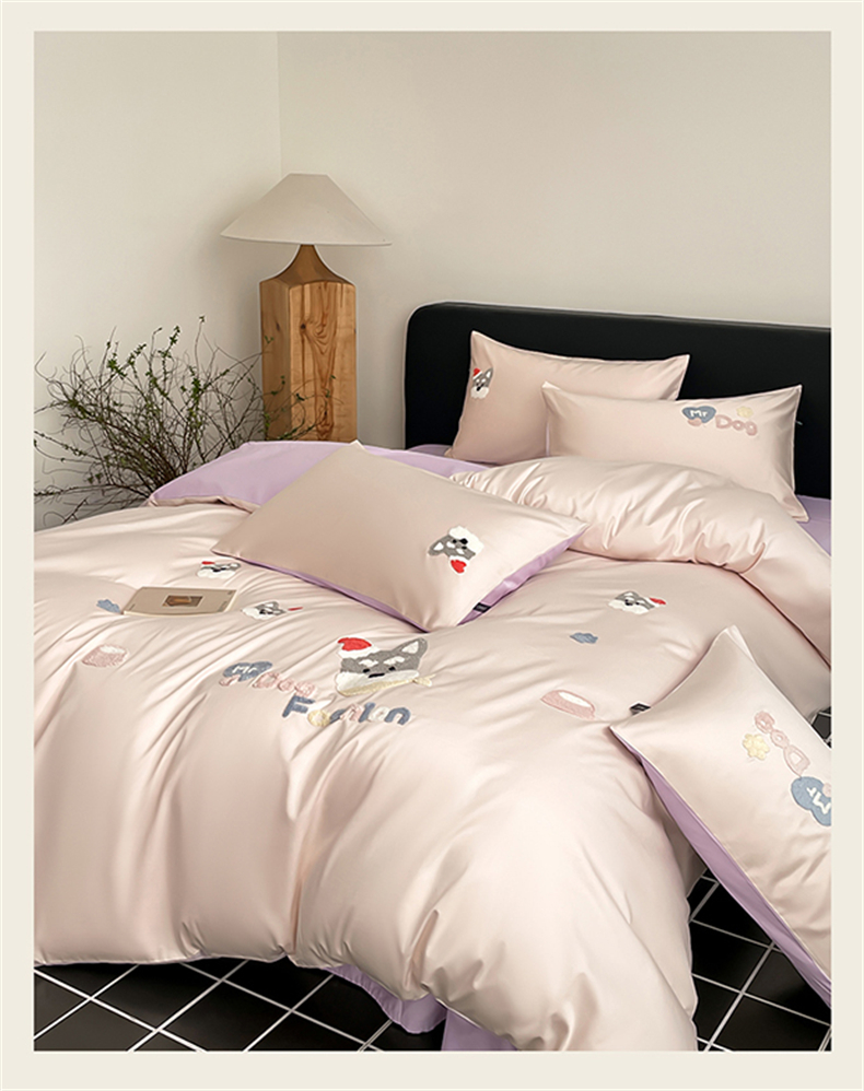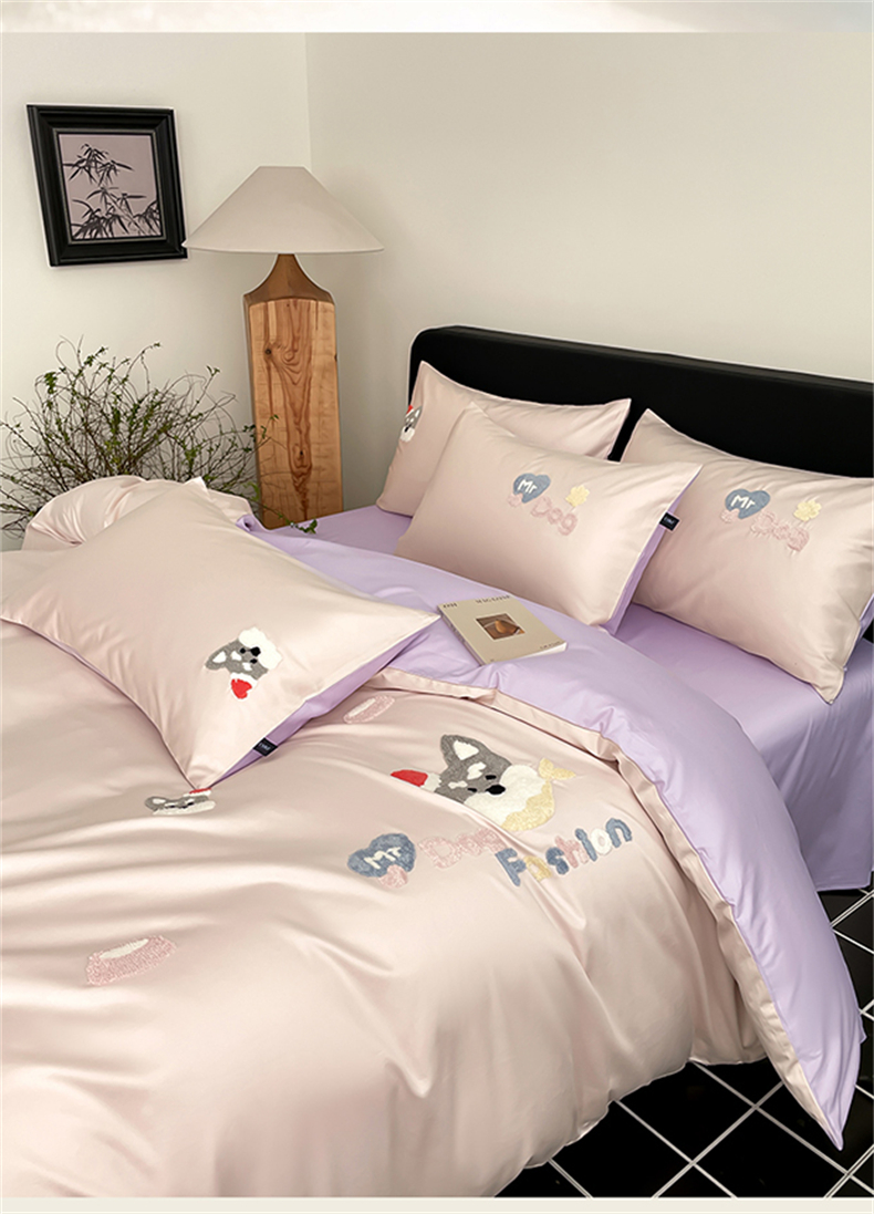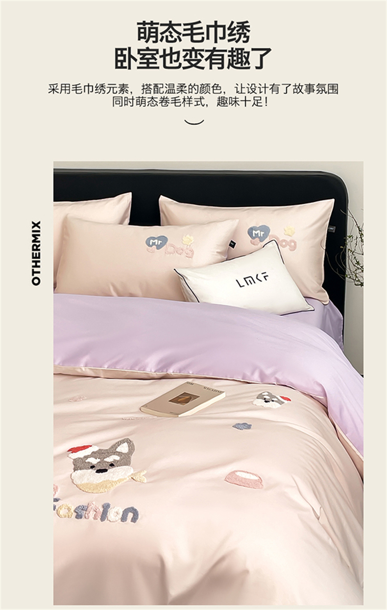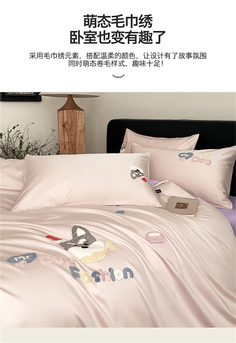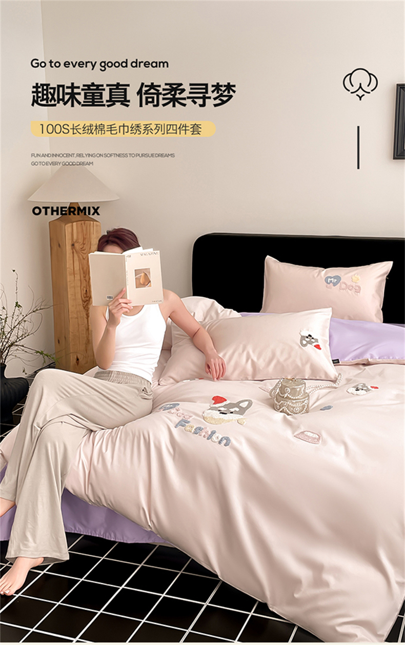 (总)蓝米卡夫 2026春季新款-100S长绒棉毛巾绣系列四件套-花犬狗狗(礼盒),花犬狗狗-桃粉幻紫,花犬狗狗-芝士粉芋
