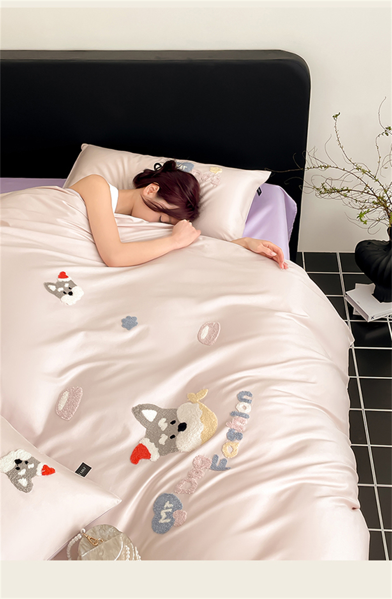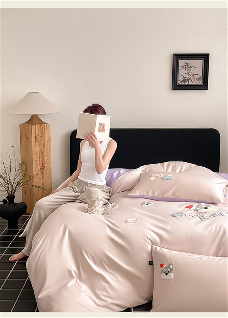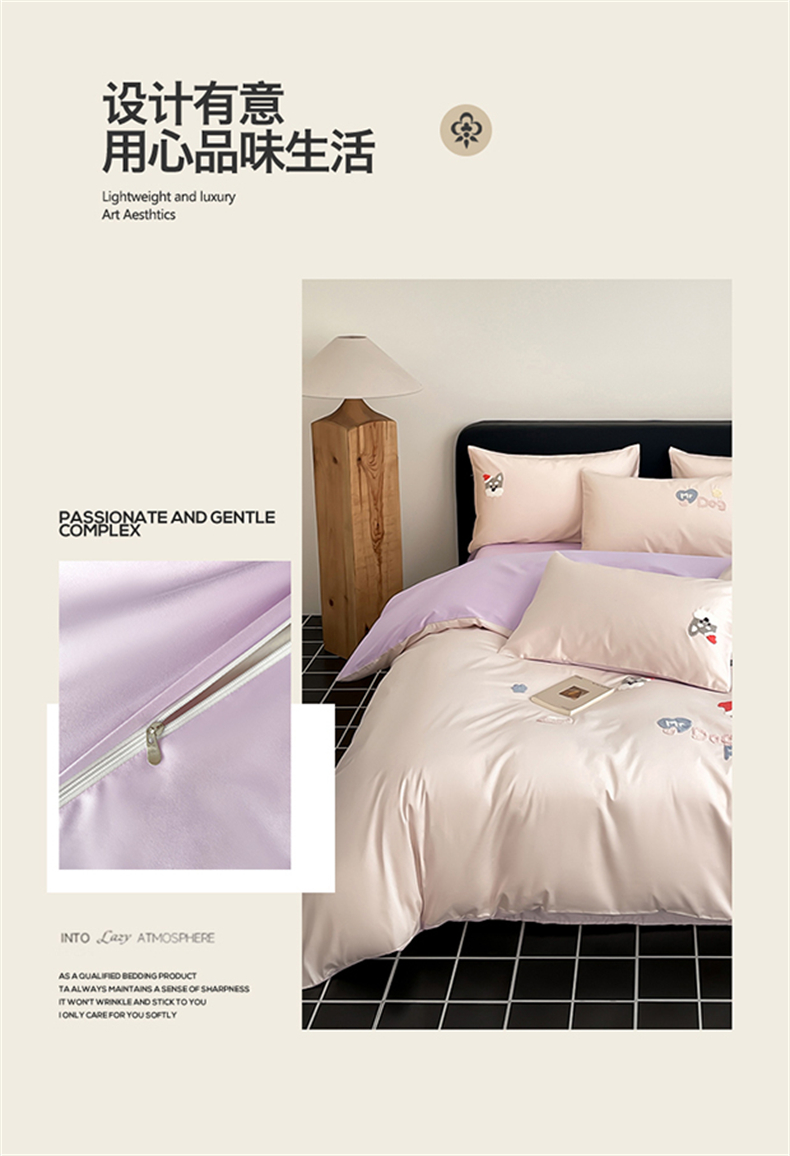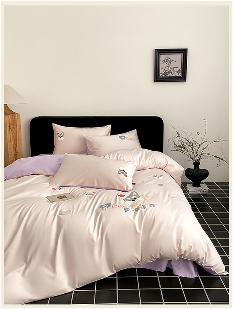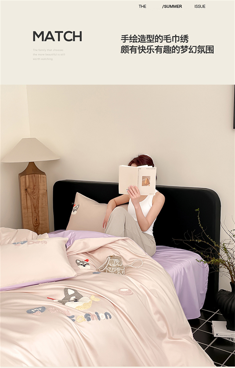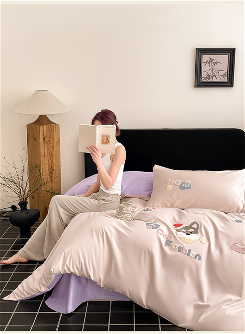 (总)蓝米卡夫 2026春季新款-100S长绒棉毛巾绣系列四件套-花犬狗狗(礼盒),花犬狗狗-桃粉幻紫,花犬狗狗-芝士粉芋