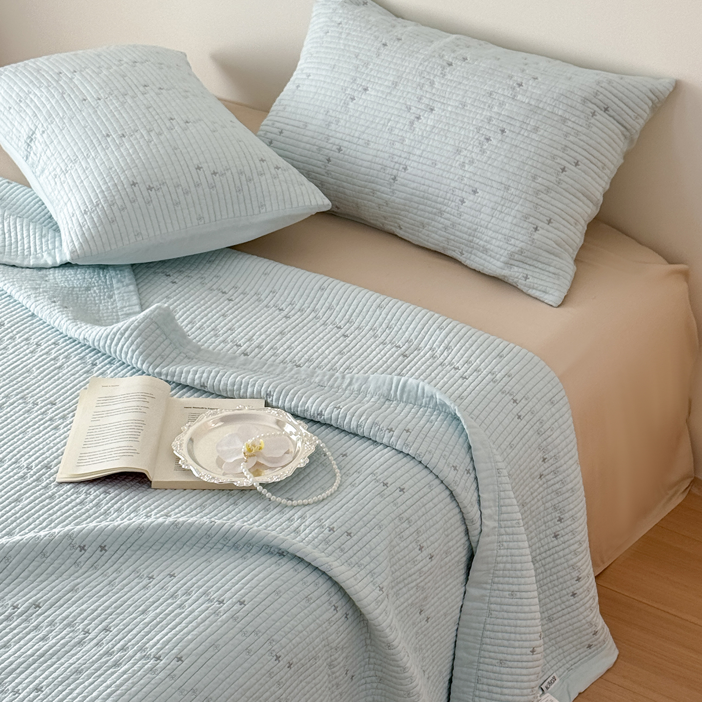 商品名称:床盖工厂店 2026新款四叶草双面莫代尔天丝填充棉花床盖三件套 碧空蓝