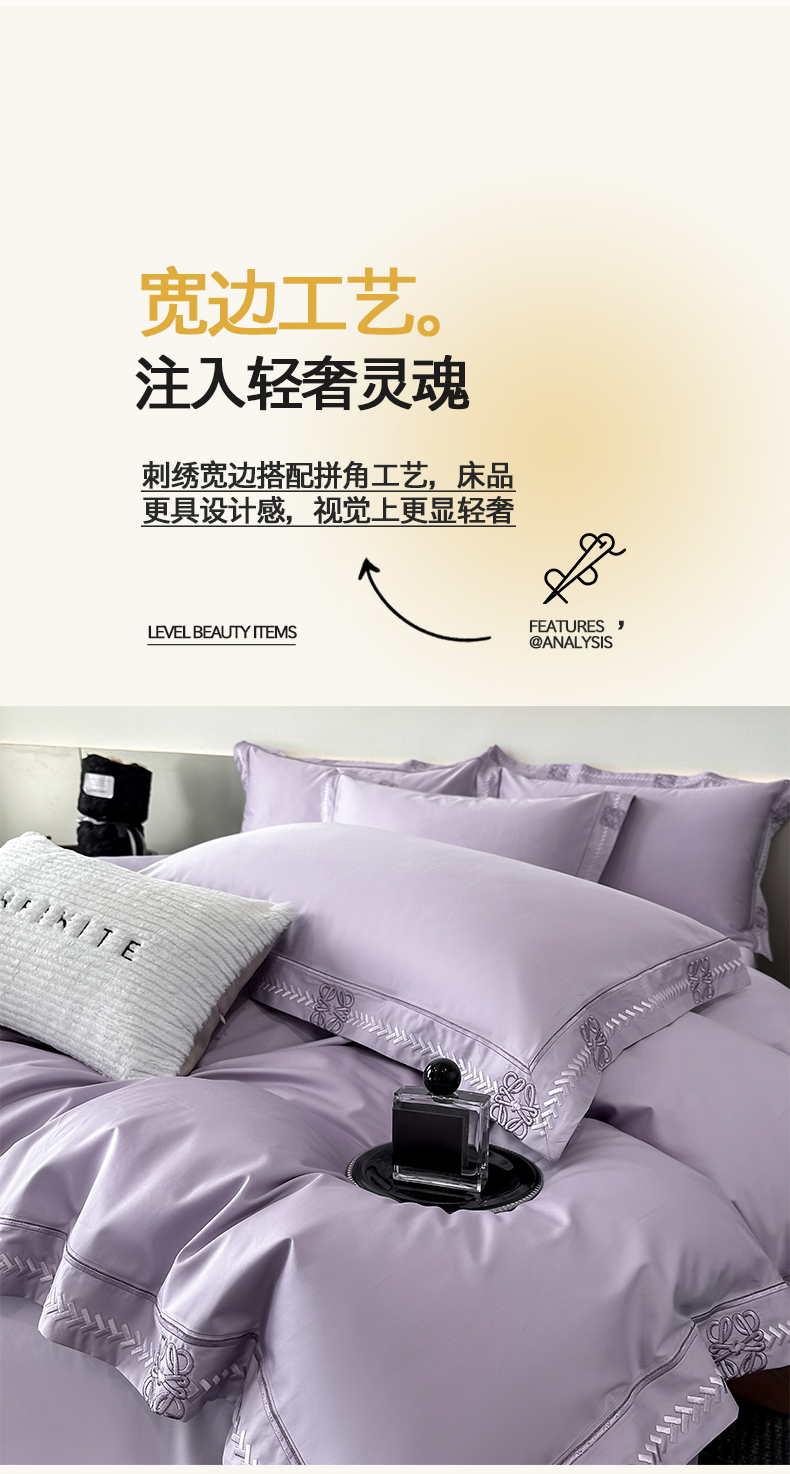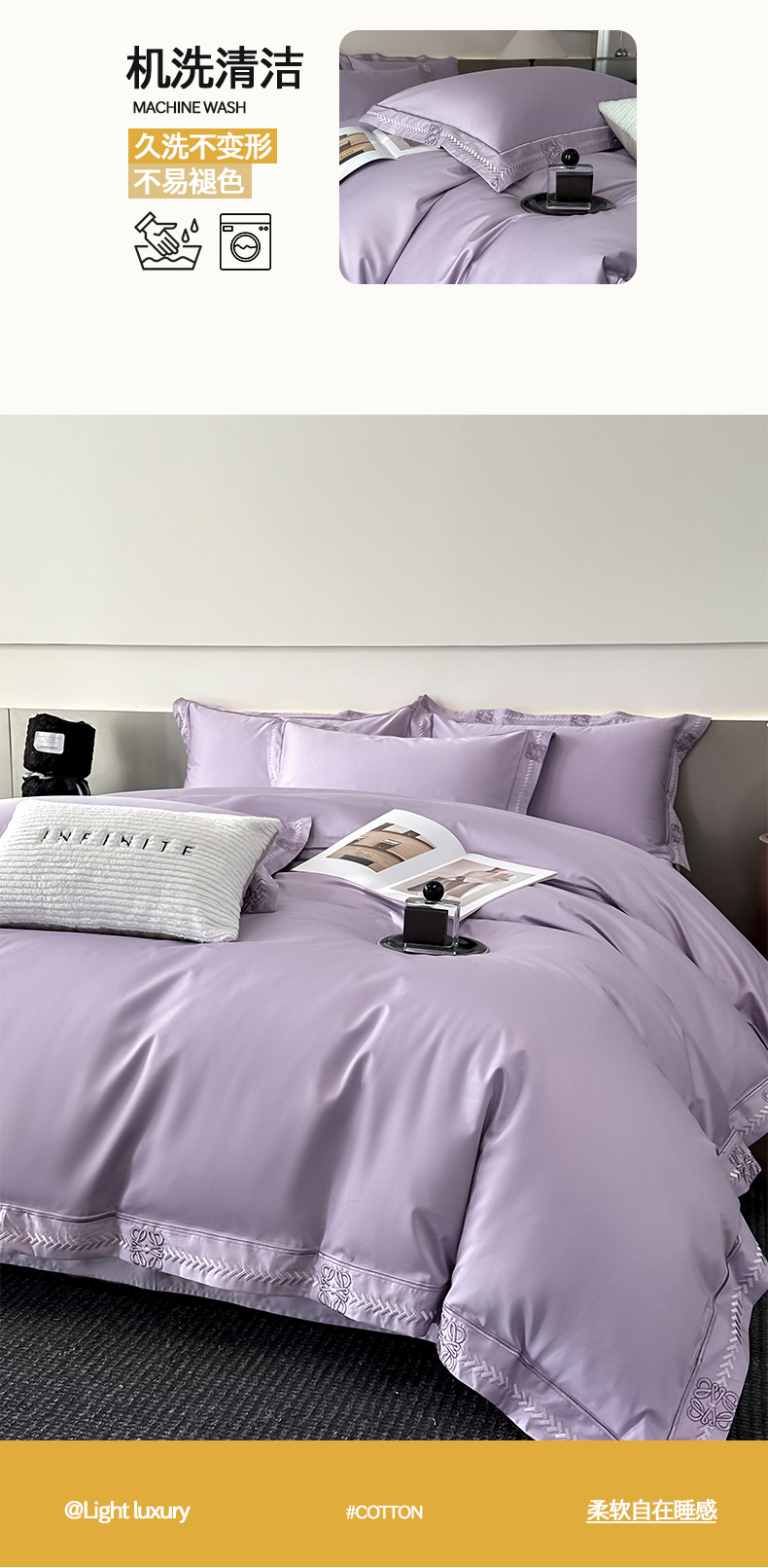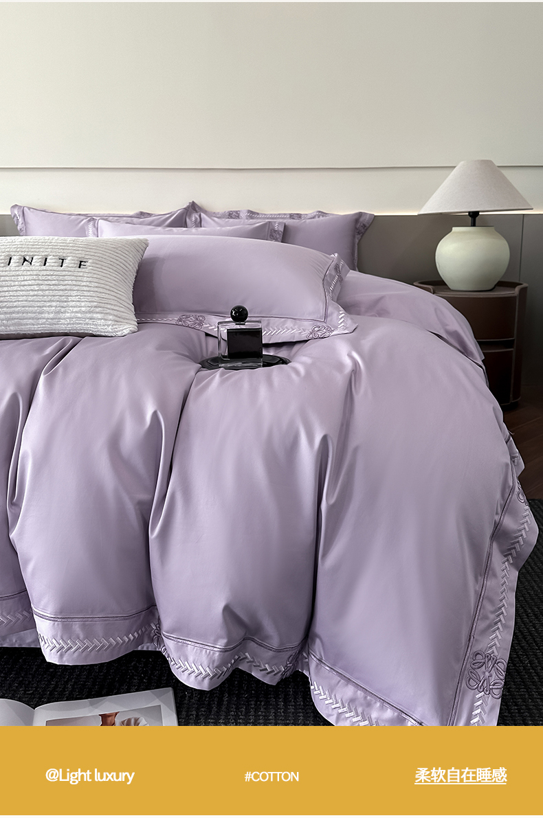 当前位置: 91家纺网 > 商品网购 > 床品套件 > 四件套 > 其它四件套 > 置顶家纺 2026春夏新款多伦多系列亲肤刺绣拼角四件套 多伦多-香芋紫