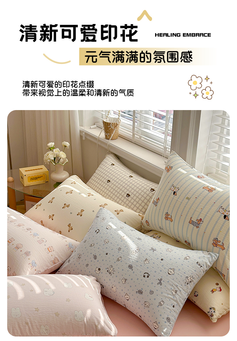 (总)多品家纺 2026新款奶呼呼超柔云感双层纱系列单枕套,白露,半岛兰格,半岛紫格,豹纹猫咪,粉粉小花,福气满满,花田小狗,欢乐时光,开心狗,棉花兔兔,浅浅春意,桃气兔兔,淘气园,汪星人,小橘狗,熊多多,熊熊空间,学院派,樱桃蓝,樱桃紫,组合图