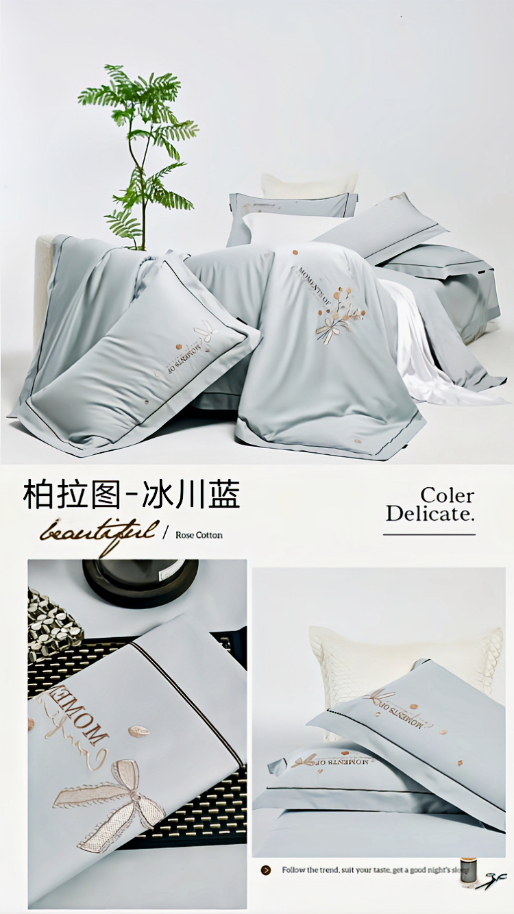 梦丝语家纺秋冬婚庆送礼居家高端100支长绒棉磨毛平绣加毛巾绣四件套,柏拉图-冰川蓝