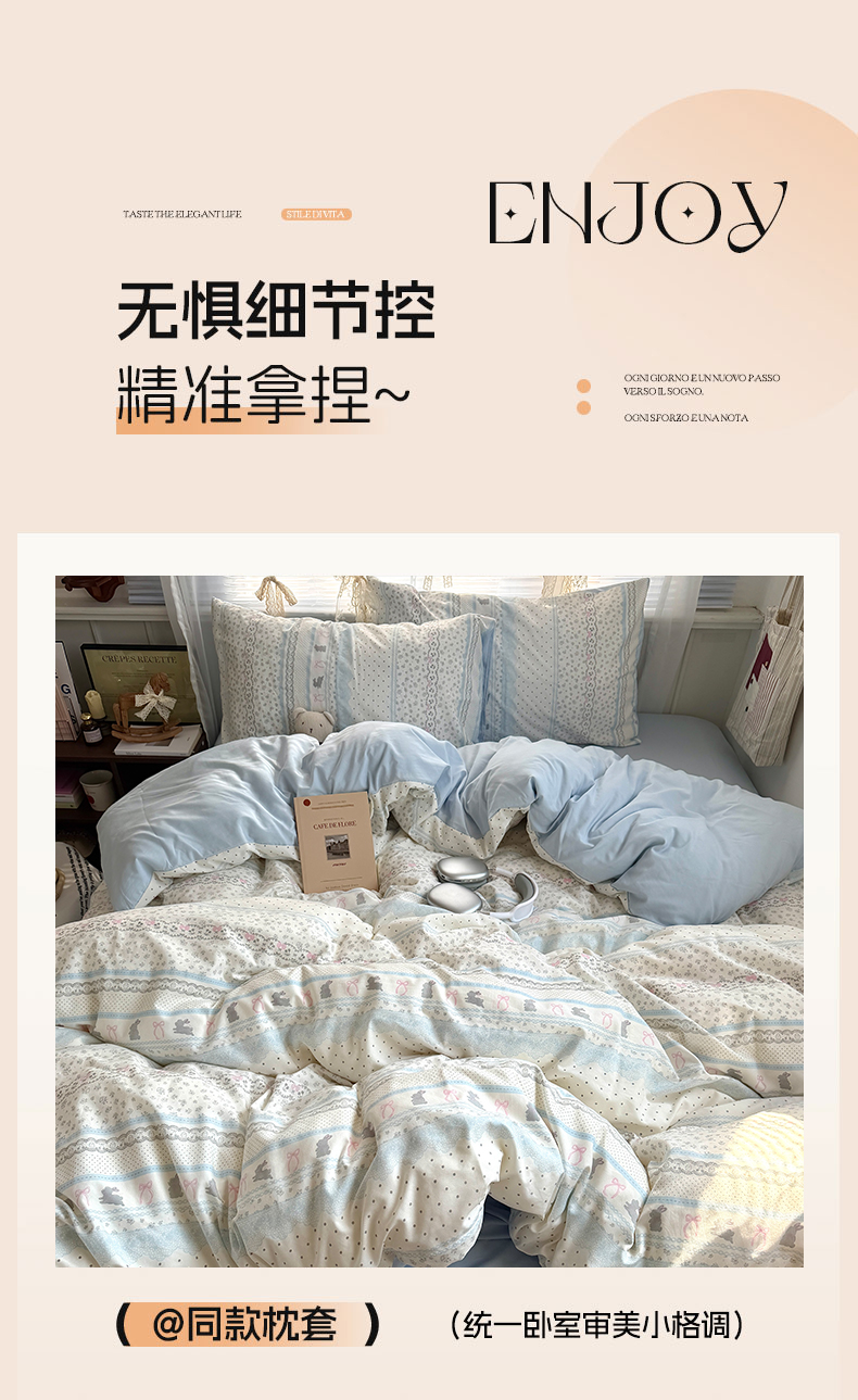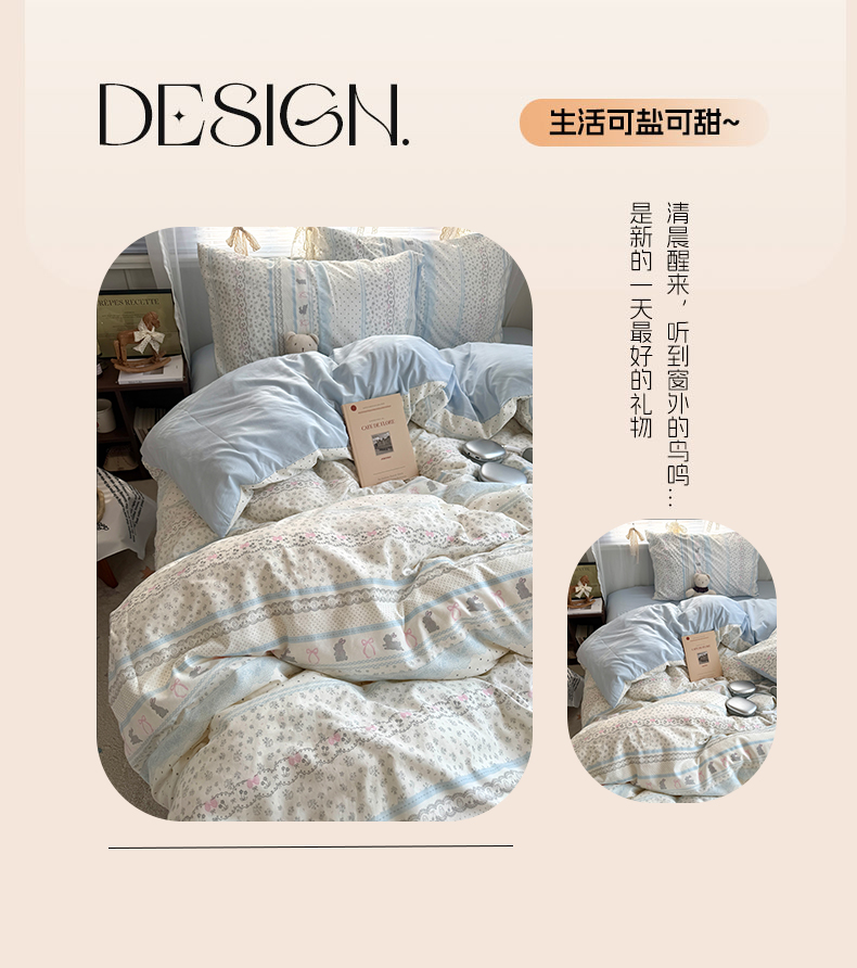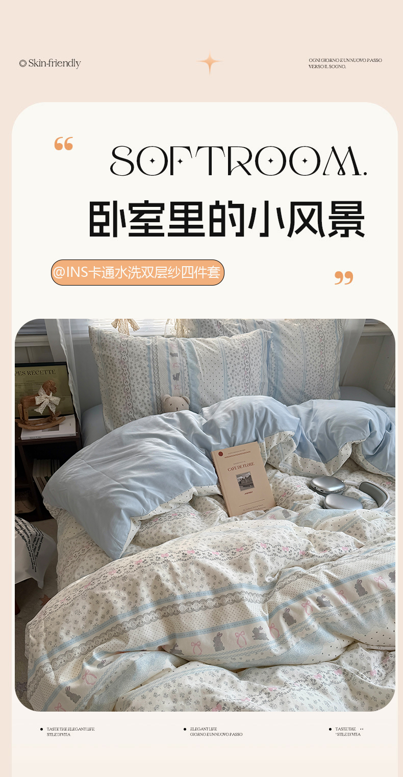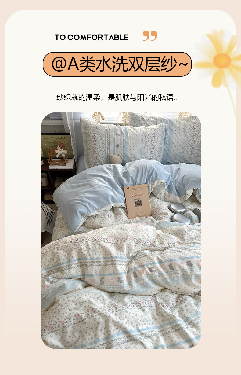 当前位置: 91家纺网 > 商品网购 > 床品套件 > 四件套 > 双层纱四件套 > 原素 2026新款小清新水洗双层纱四件套 费尔岛兔兔