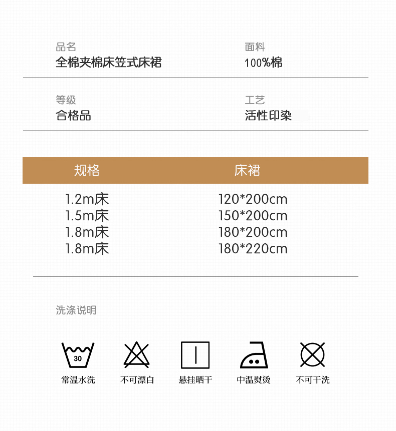 180*200cm(裙边高度35cm/床笠高度30cm)