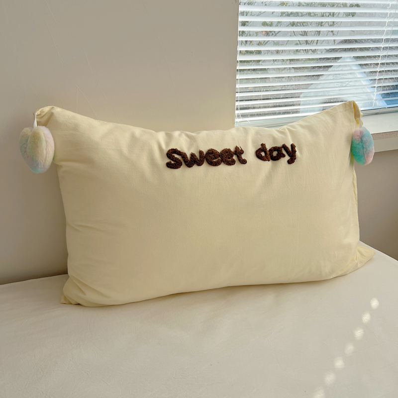 丽涵家纺 2026新款全棉纯棉色织水洗棉单品枕套--爱心兔毛球 笑脸猫咪-黄格