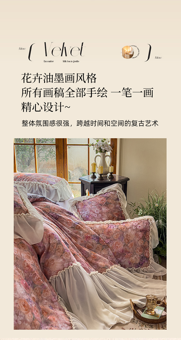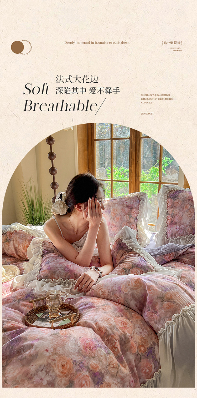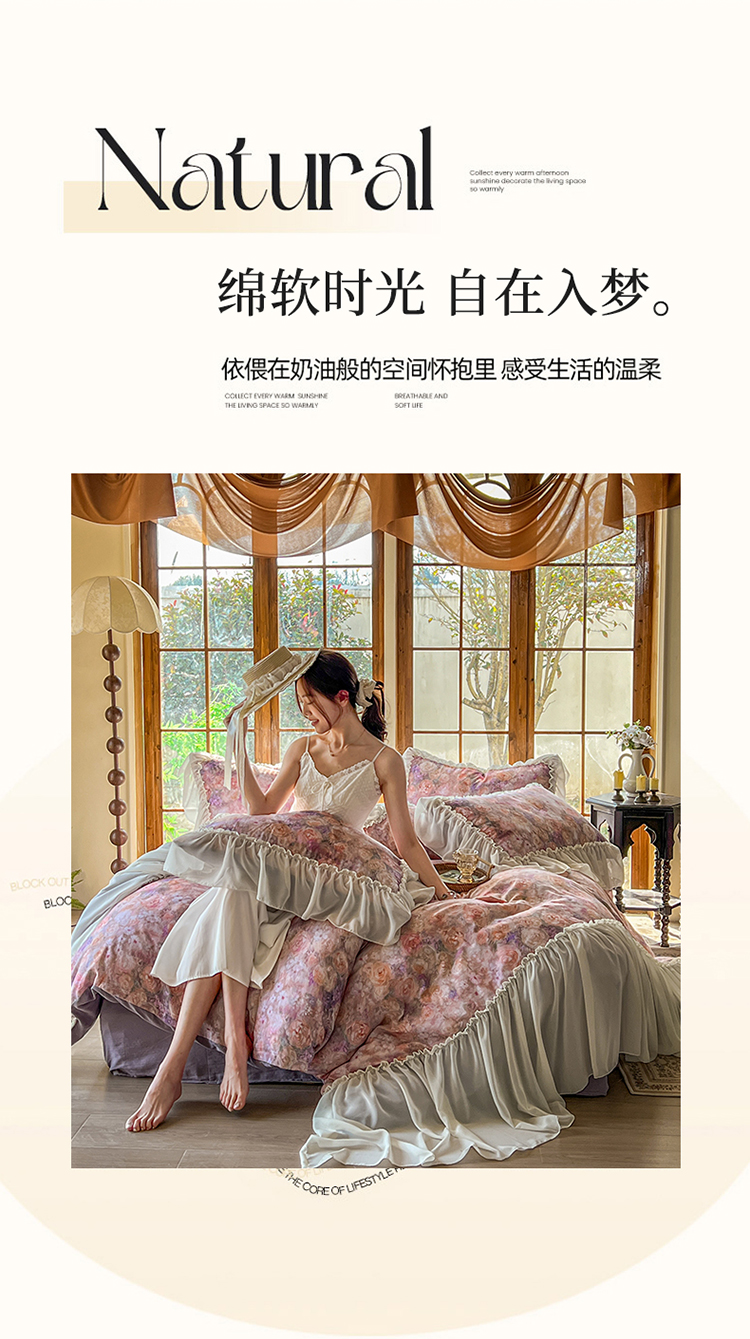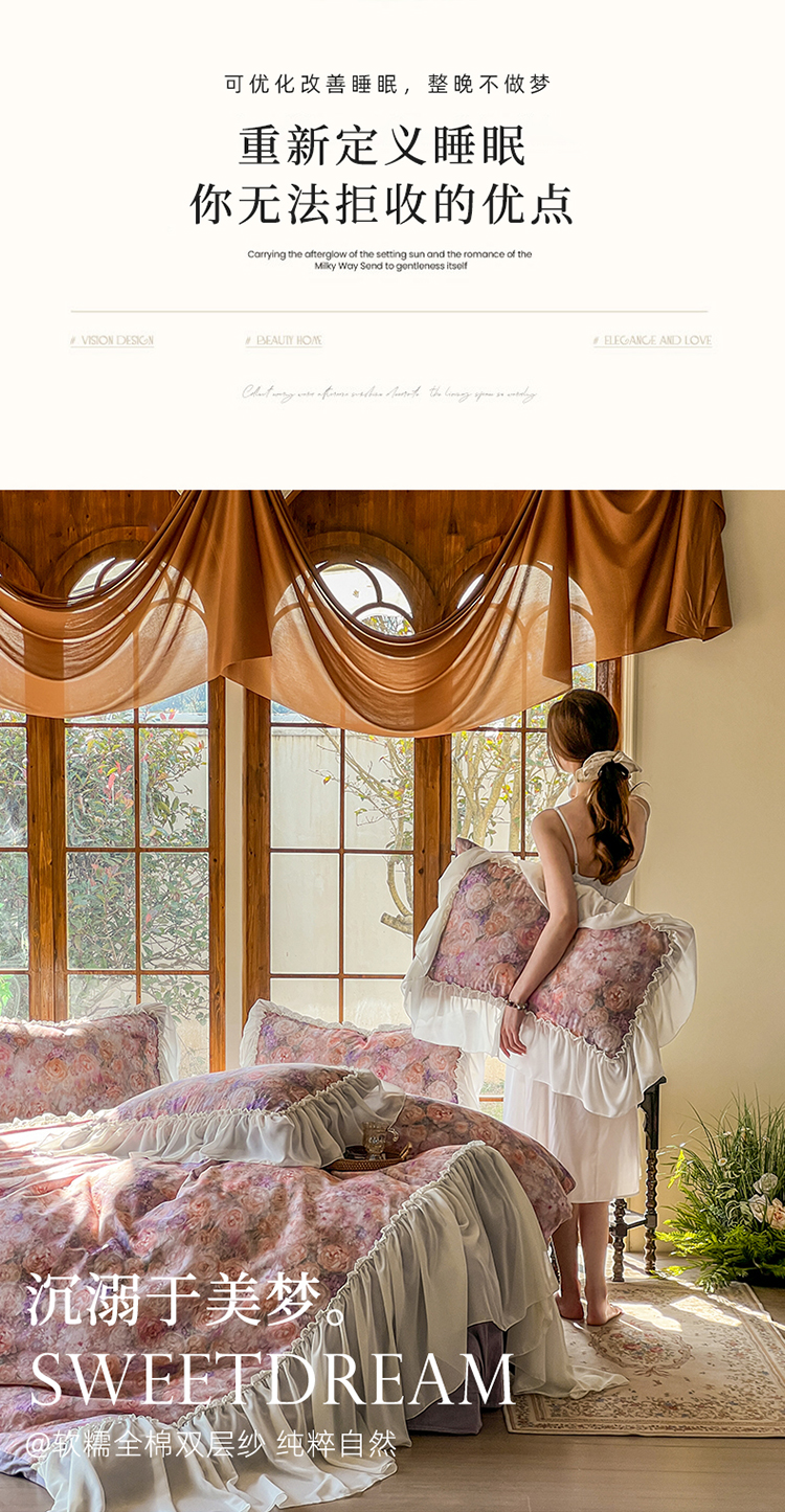 商品名称:(总)2026高端韩版法式公主复古油画风全棉纯棉双层纱四件套赫本浪漫荷叶花边仙女风全棉双层纱四件套床上用品被套床单床笠