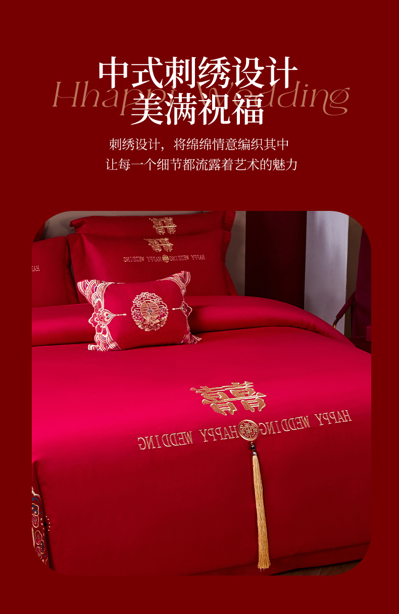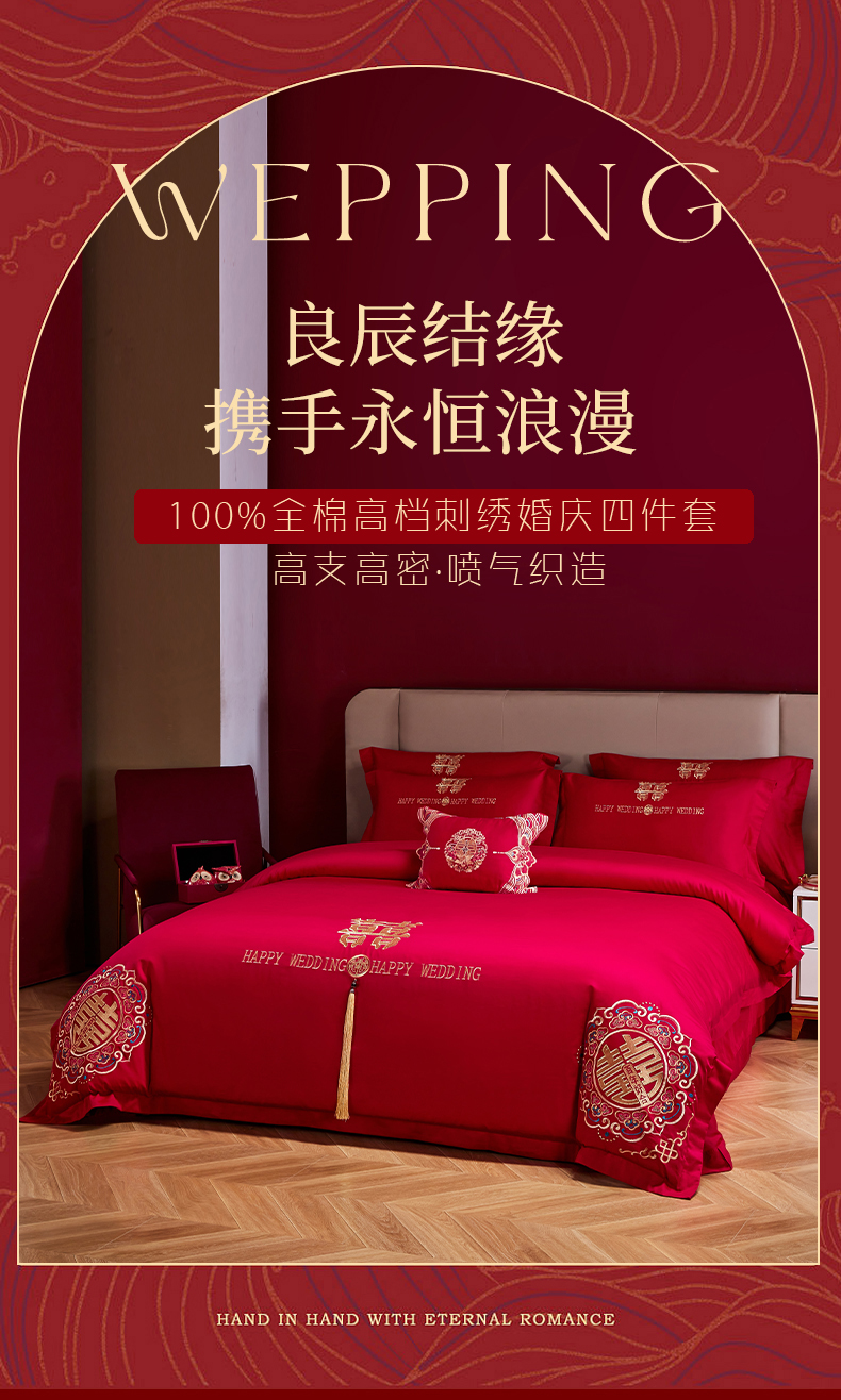 晶缦家纺 2026新款喷气全棉13376纯棉刺绣花婚庆四件套 喜来登-金