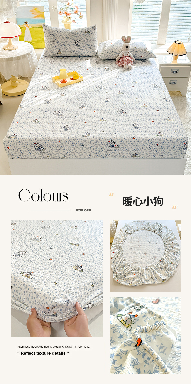 • 91家纺网 家纺一手货源 找家纺 九诺家纺 2026春夏新款丝柔棉小清新单床笠床罩保护套床笠单件床笠三件套 暖心小狗