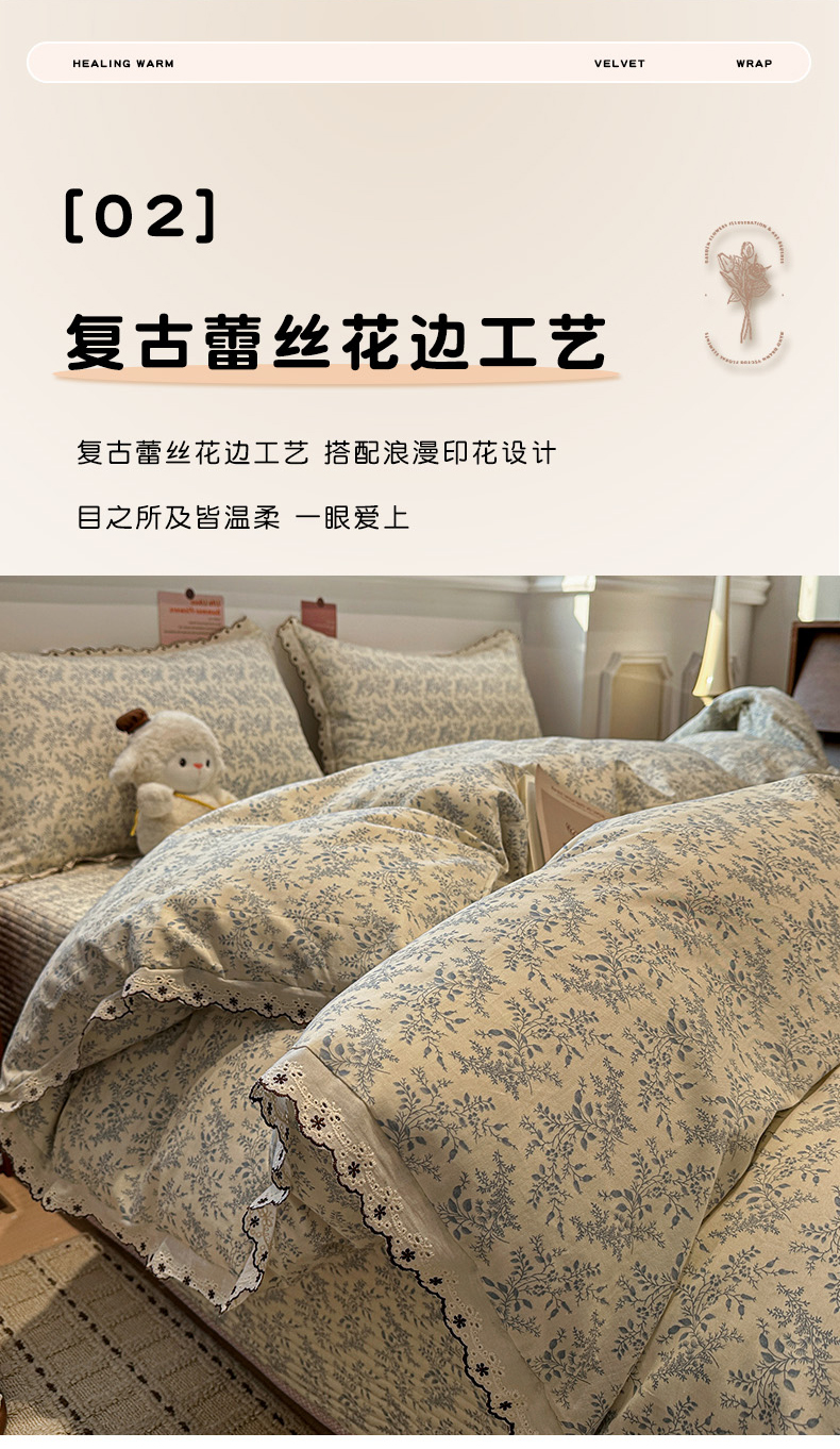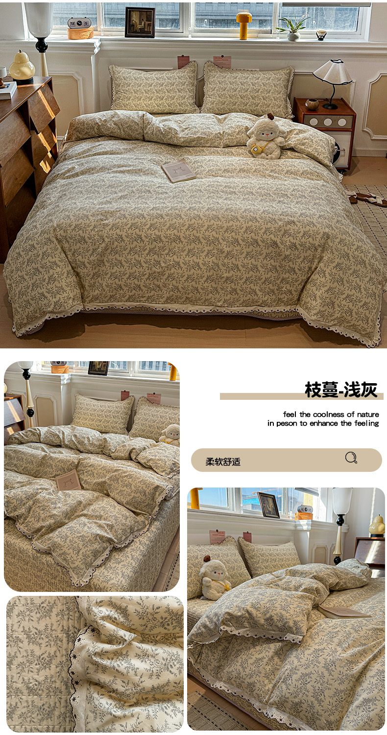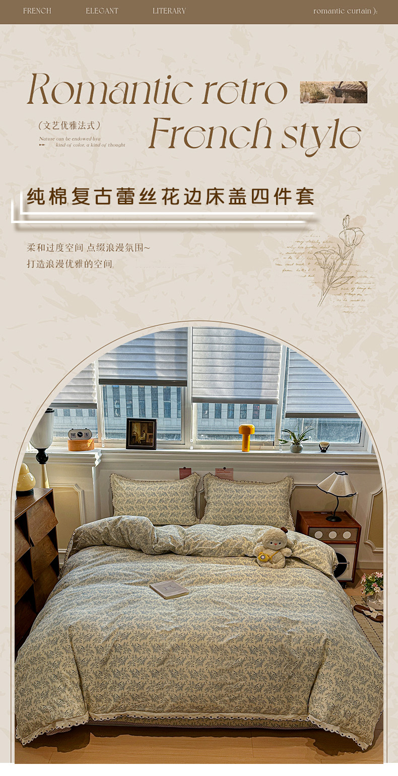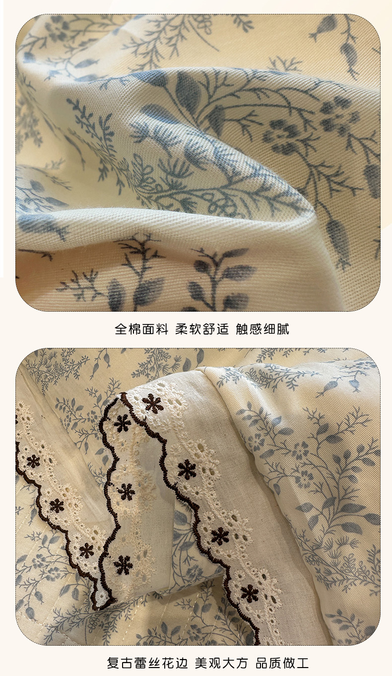(总)橙子家居 2026新款纯棉法式复古蕾丝花边床盖四件套,复古蔷薇粉,花町,花影,墨影,普罗旺斯,枝蔓-浅灰,枝蔓-浅蓝