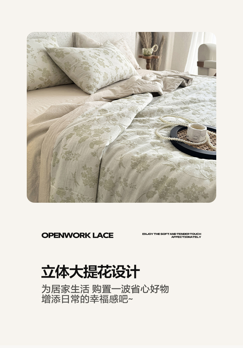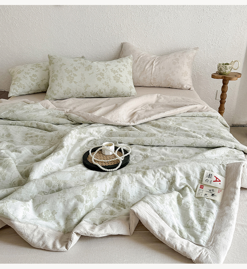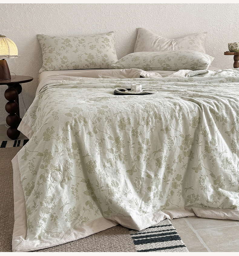 • 91家纺网 家纺一手货源 找家纺 薇玛仕 2026春夏新款全棉色织水洗棉三层纱夏被新疆棉花夏凉被四件套里外全棉 包过检 浅绿清眠