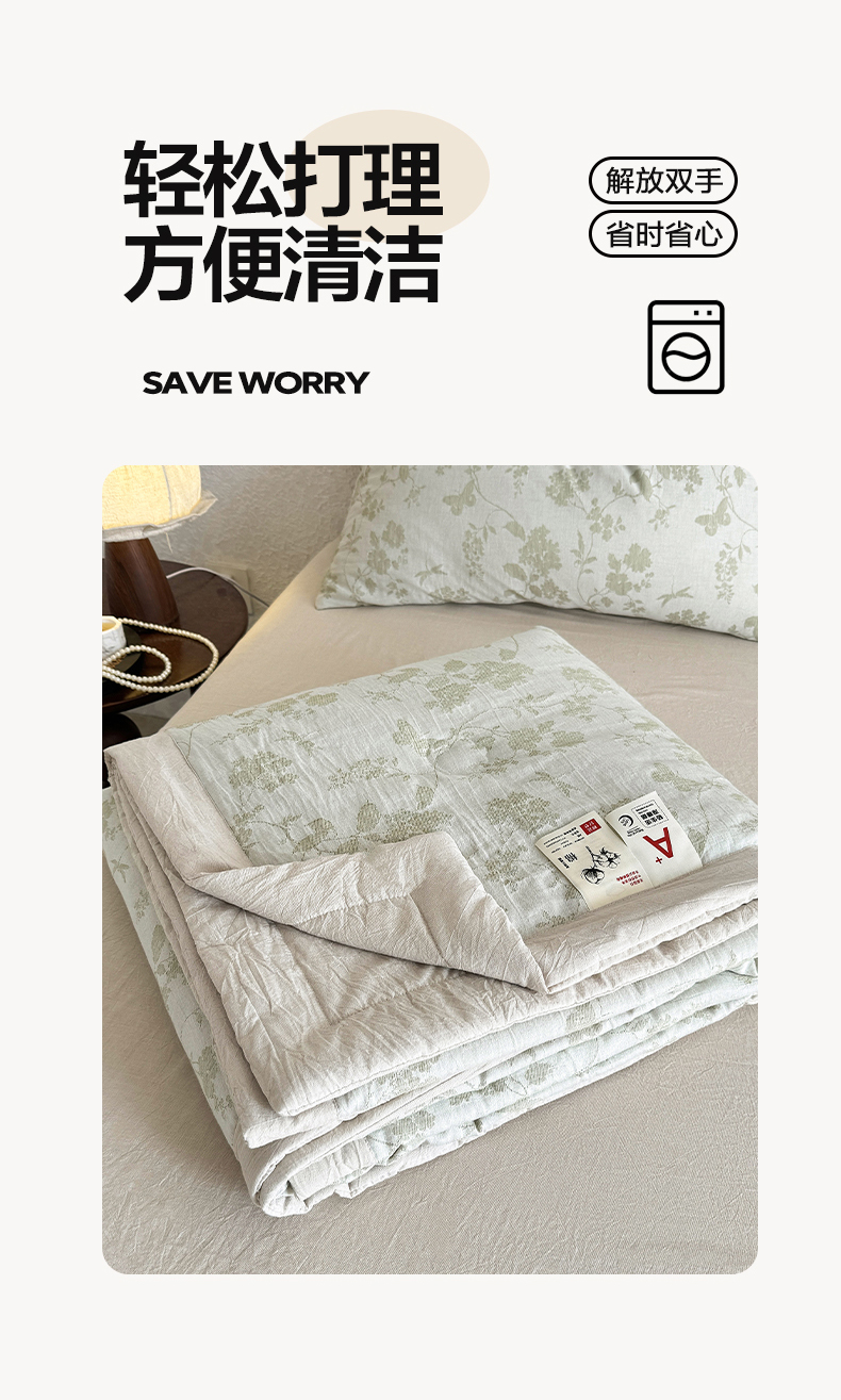 当前位置: 91家纺网 > 商品网购 > 被子 > 夏被 > 薇玛仕 2026春夏新款全棉色织水洗棉三层纱夏被新疆棉花夏凉被四件套里外全棉 包过检 浅绿清眠