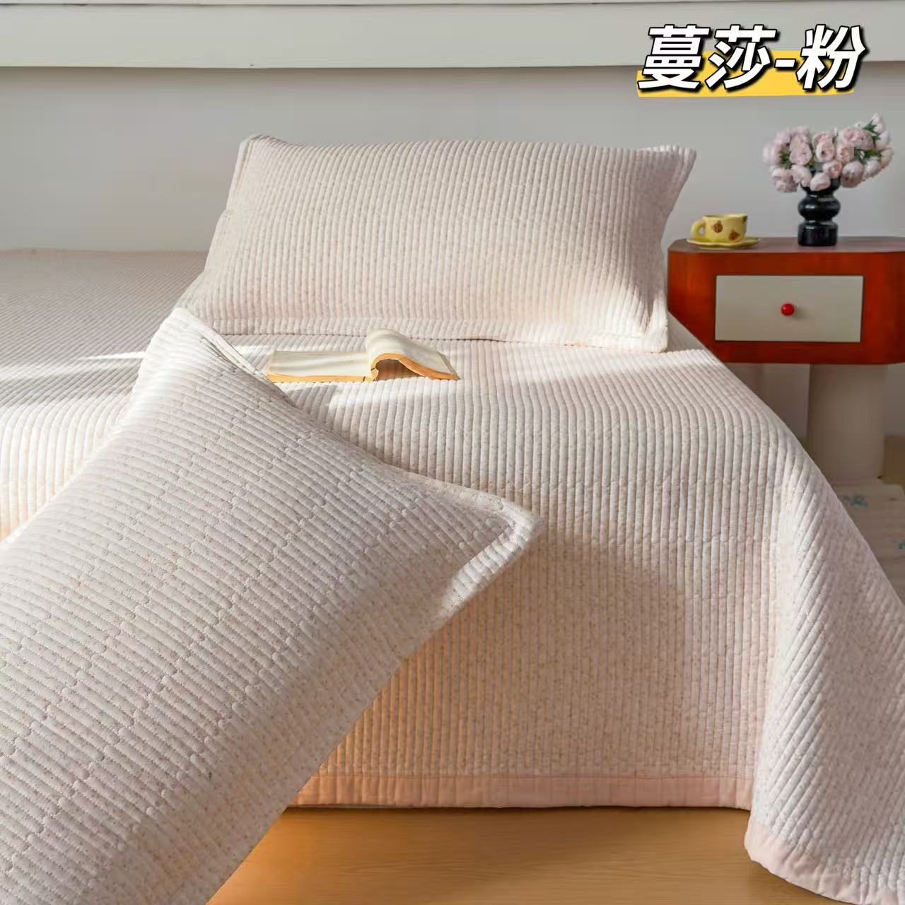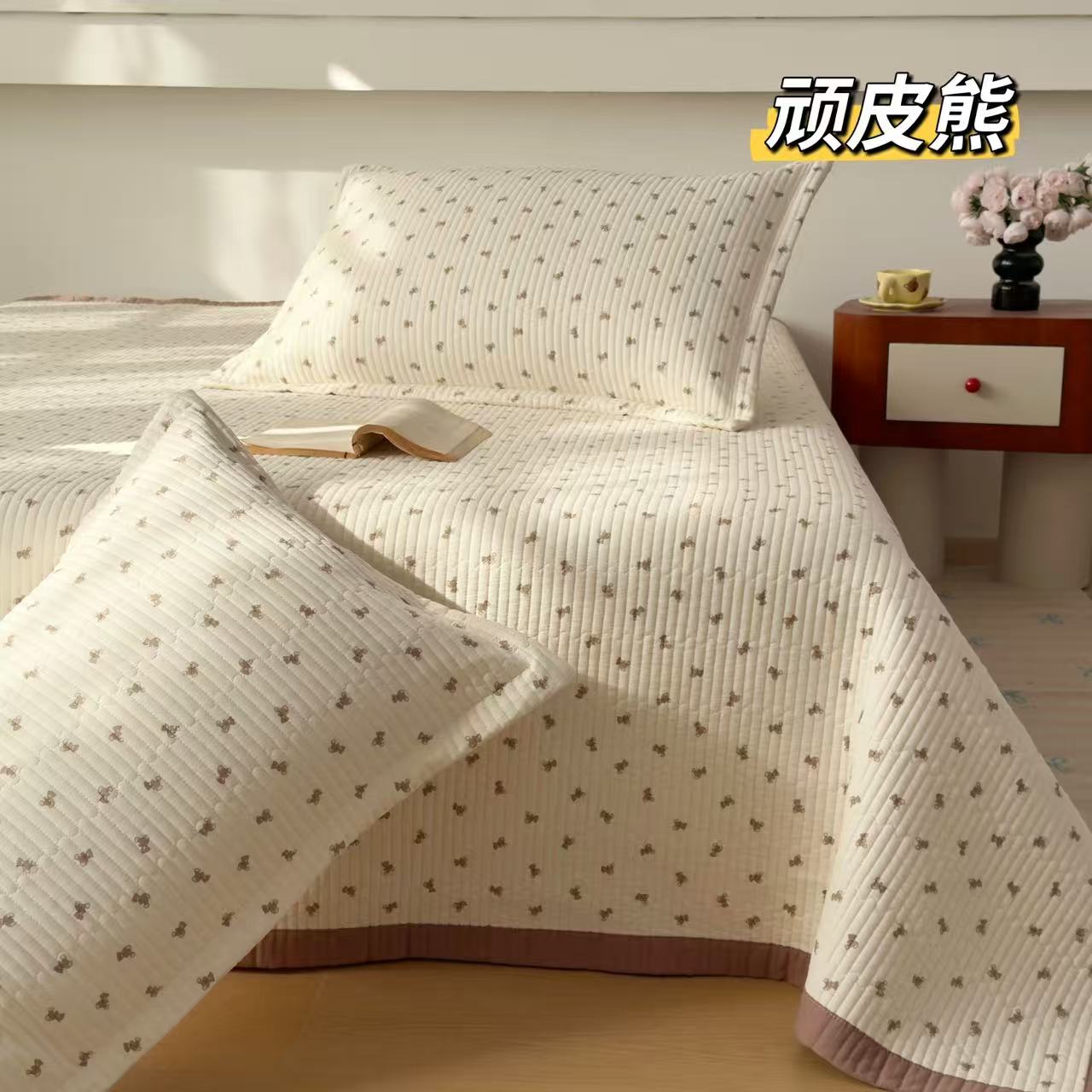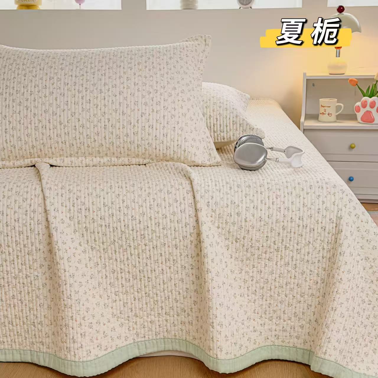 (总)纯棉水洗棉床盖 花边60S双面全棉砂洗床盖三件套绗缝夹棉床单,白色,粉色,绿色,咖色,本麻