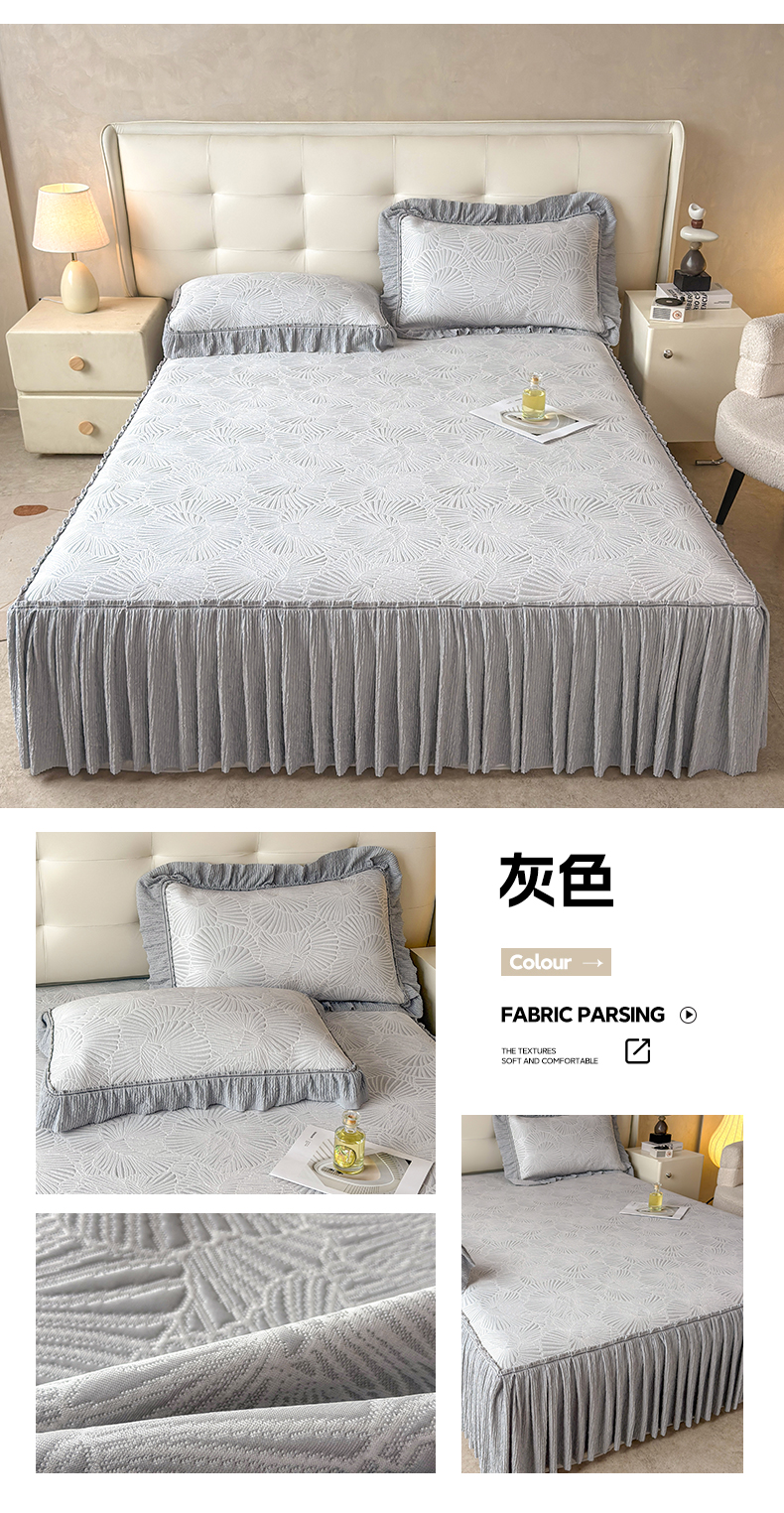 商品名称:牵梦萦家纺 2026新款立体浮雕压花工艺凉感豆豆凉席-床裙款 银杏叶-灰色