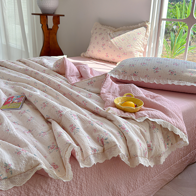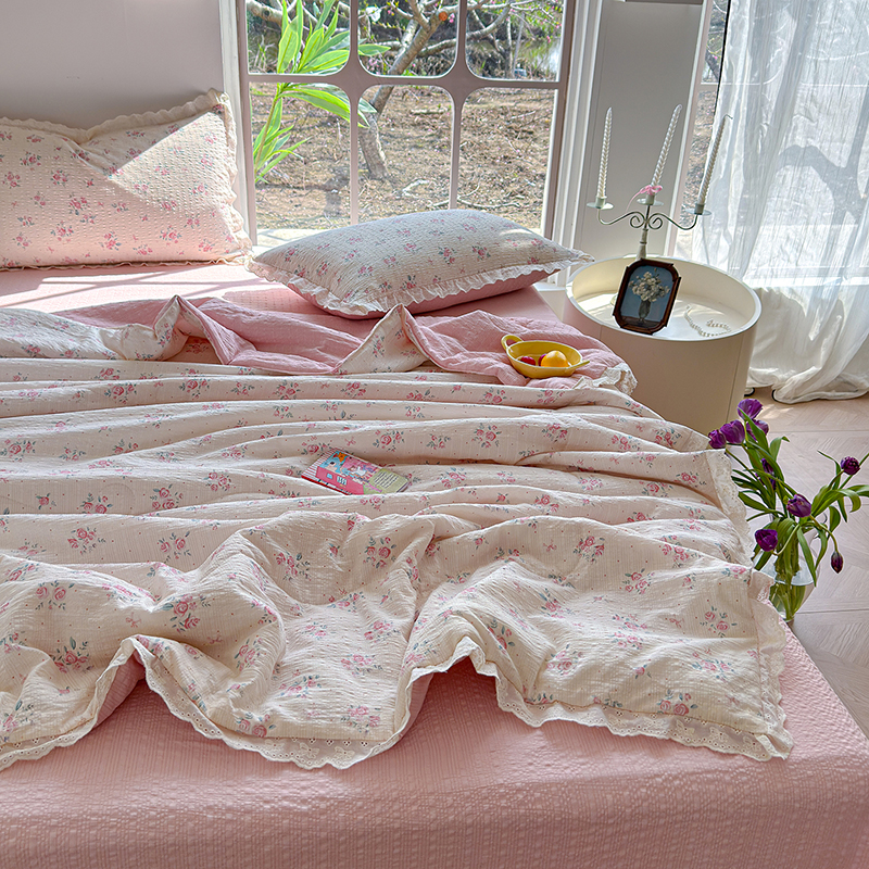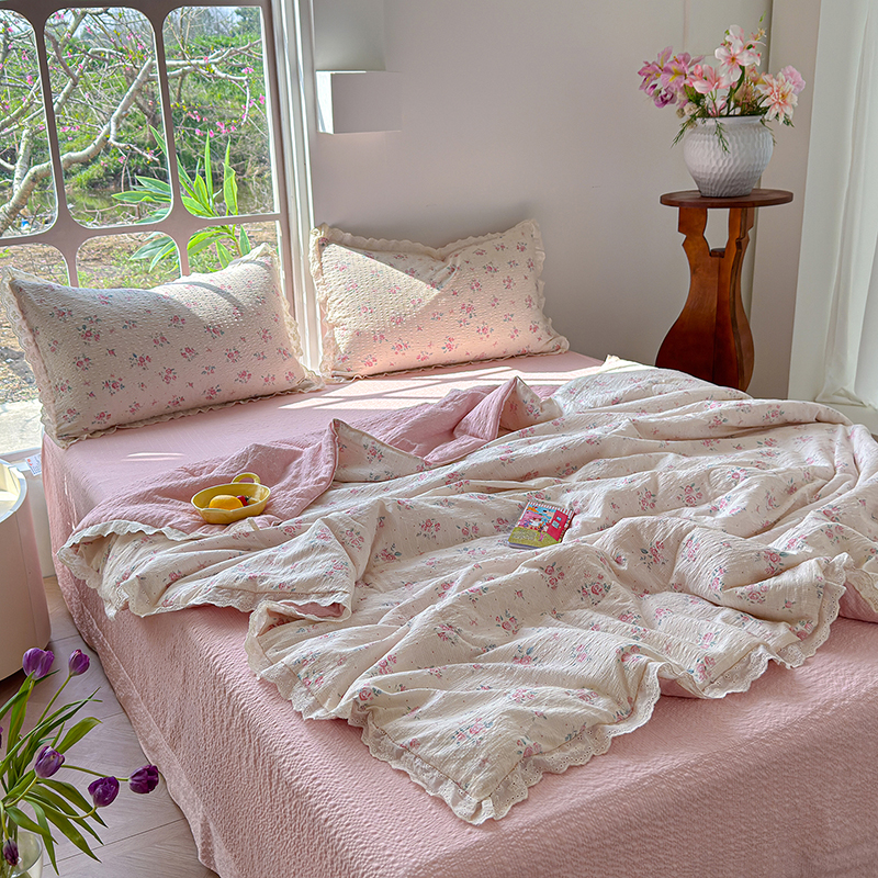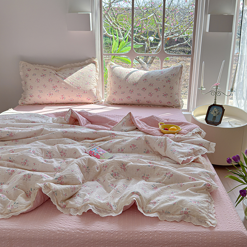 竹合家纺 2026新品泡芙纱夏被四件套全棉镂空花边泡泡皱皱纱夏凉被 粉黛