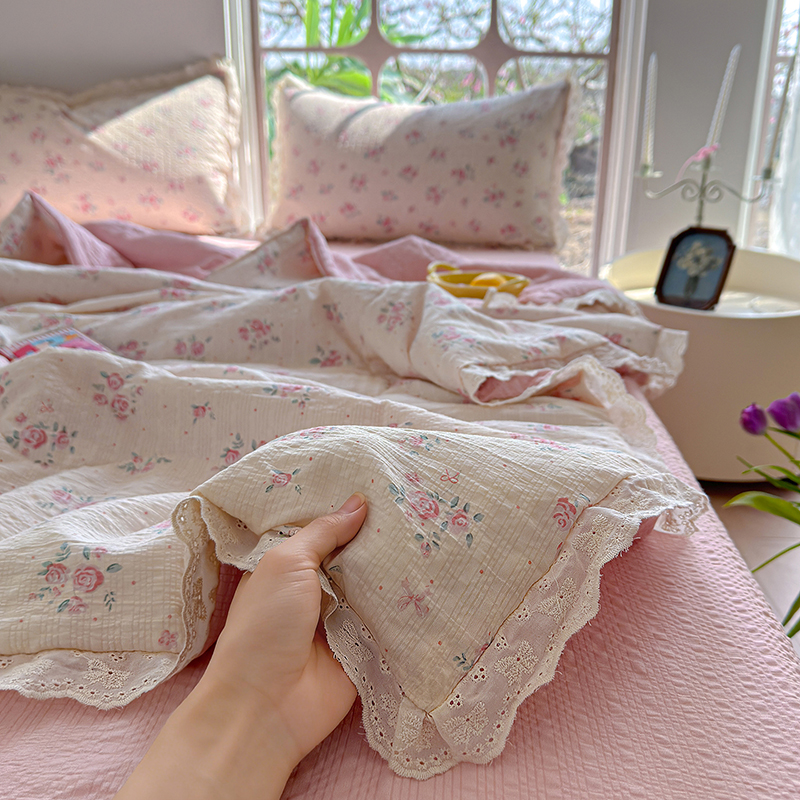 商品名称:竹合家纺 2026新品泡芙纱夏被四件套全棉镂空花边泡泡皱皱纱夏凉被 粉黛