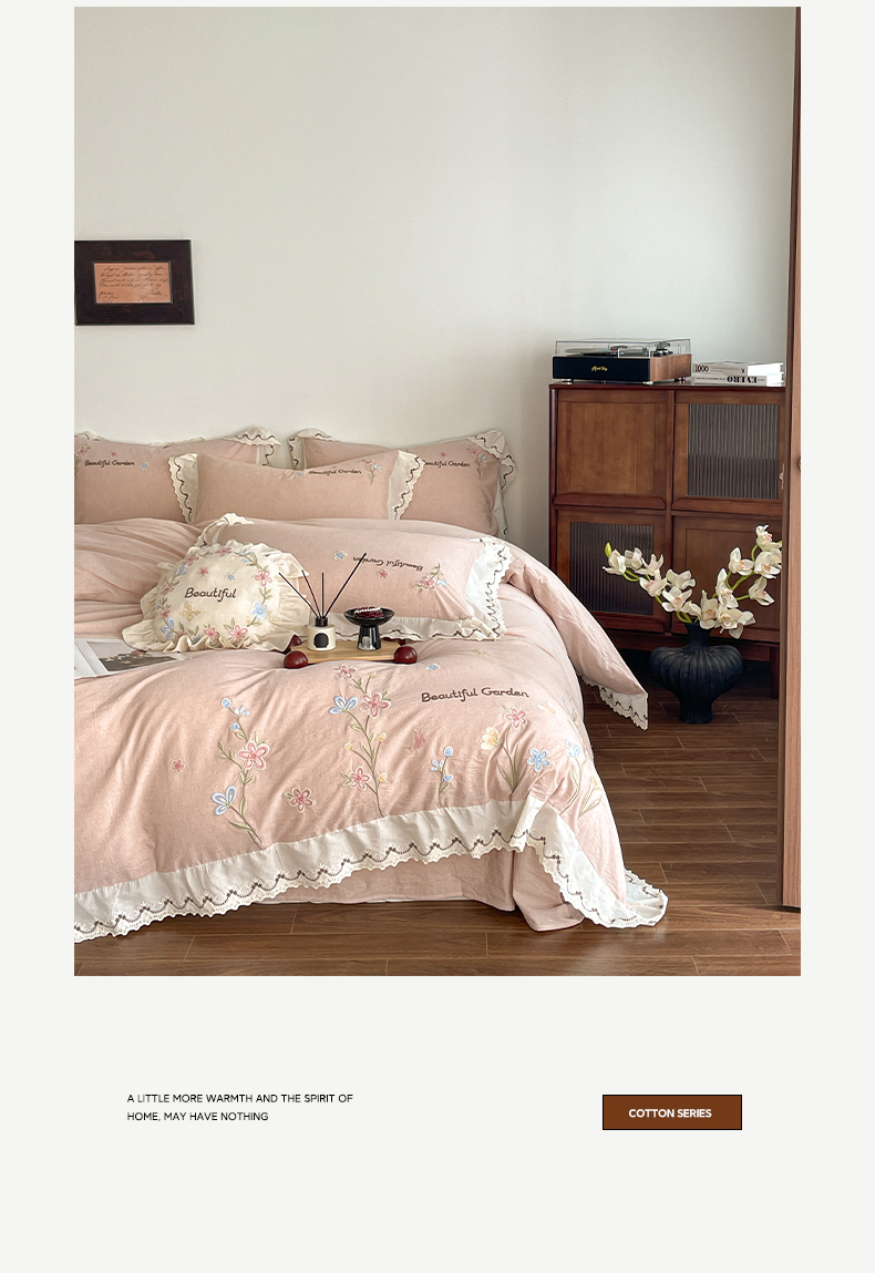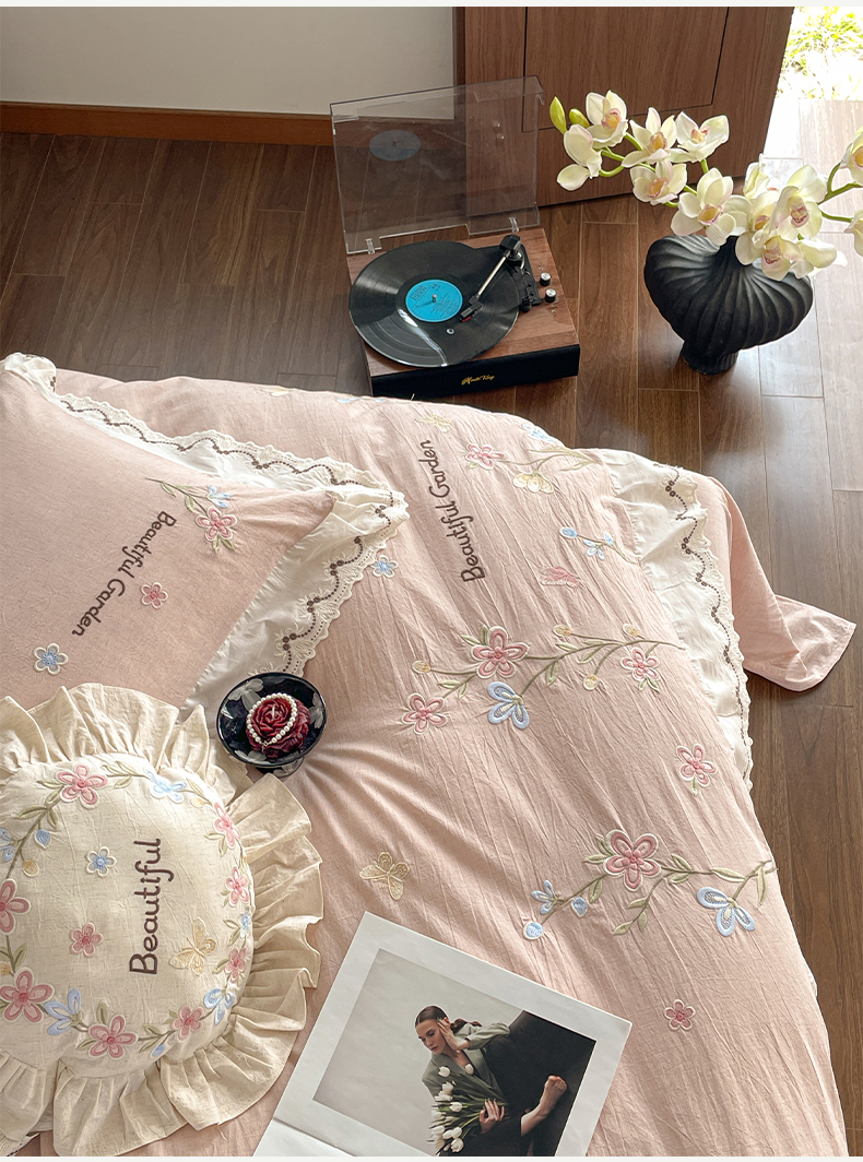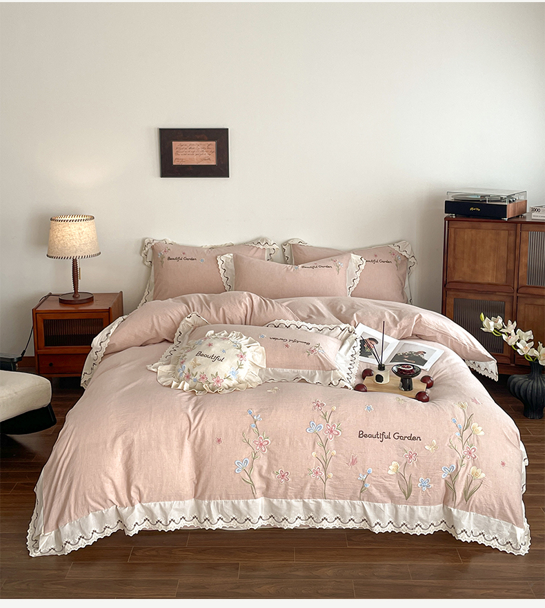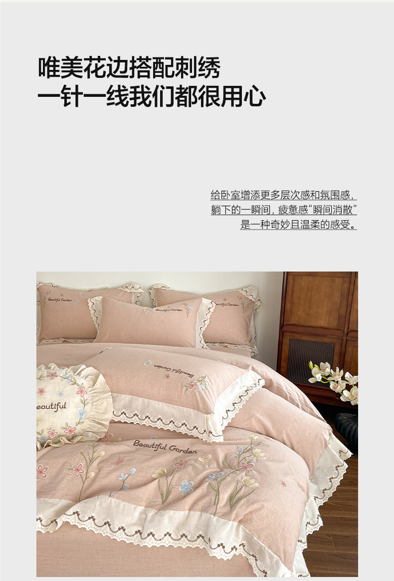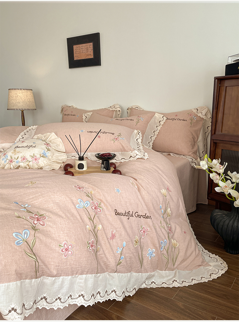 如一 2026新款棉麻绣花花边款全棉亚麻四件套 花间-粉