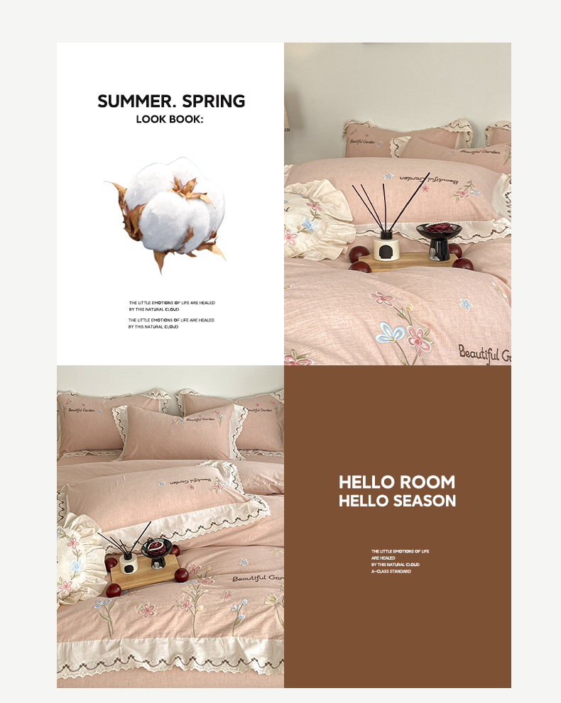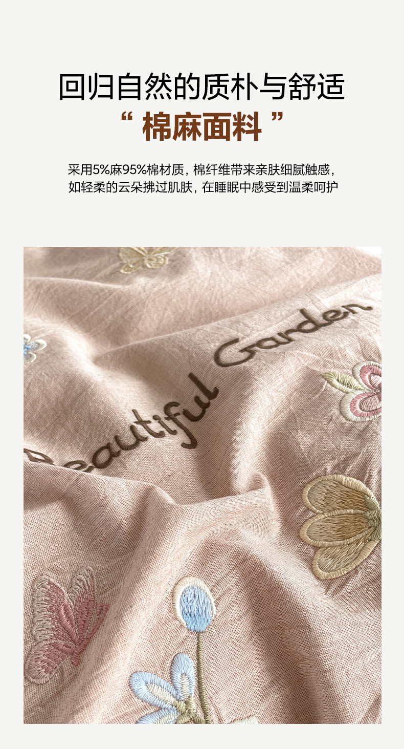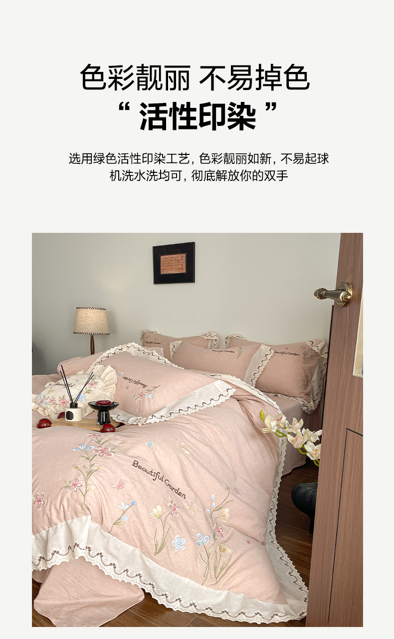 (总)如一 2026新款棉麻绣花花边款全棉亚麻四件套,花间-粉,花间-咖,花间-绿,花间-米
