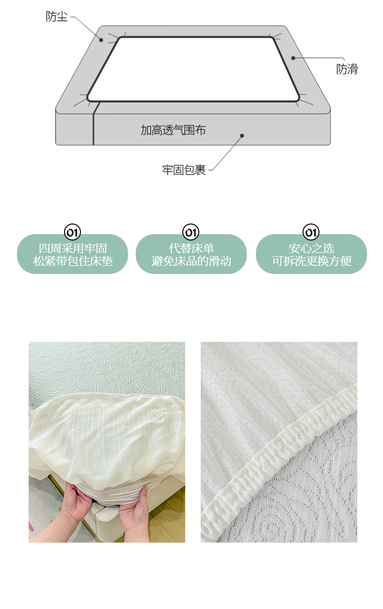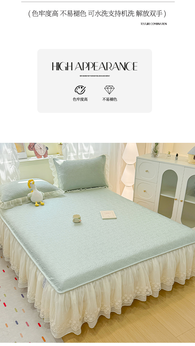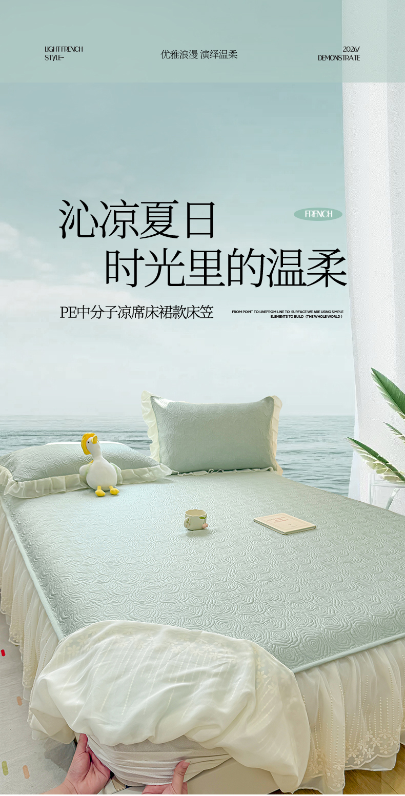(总)眠势力 2026新款PE提花冰凉豆豆床裙款床笠凉席子冰丝凉感中分子床裙乙纶床裙床笠二合一,晚风-冰蓝,晚风-冷灰,晚风-凝粉,晚风-清绿,晚风-雾米
