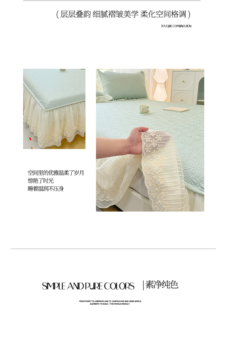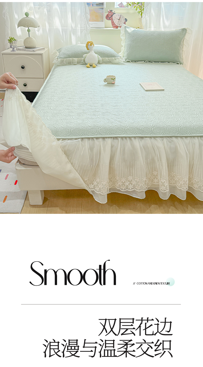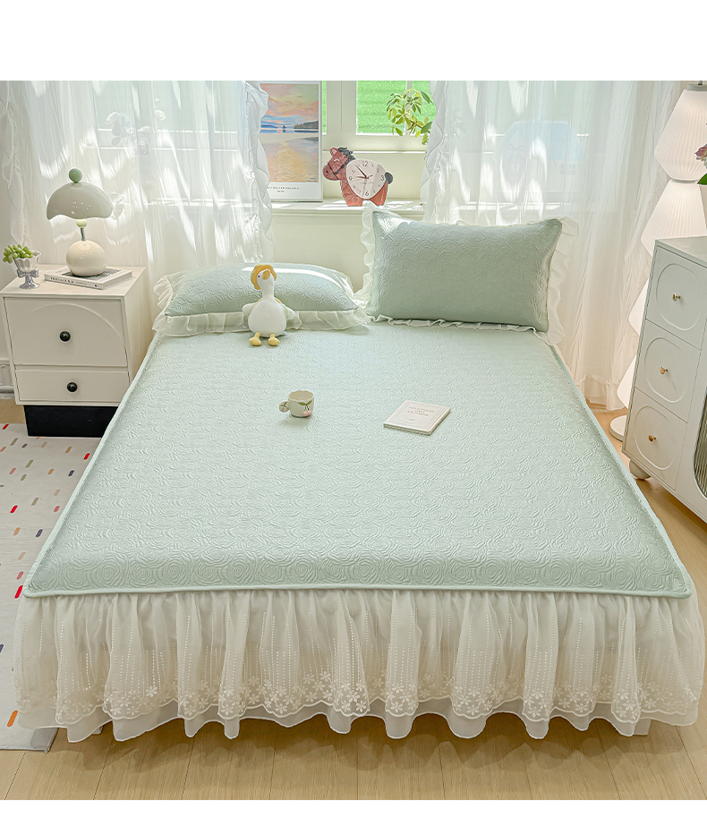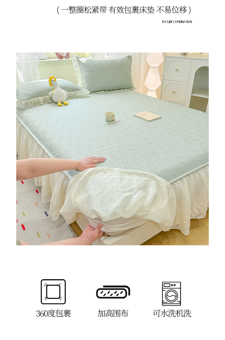 • 91家纺网 家纺一手货源 找家纺 眠势力 2026新款PE提花冰凉豆豆床裙款床笠凉席子冰丝凉感中分子床裙乙纶床裙床笠二合一 晚风-清绿