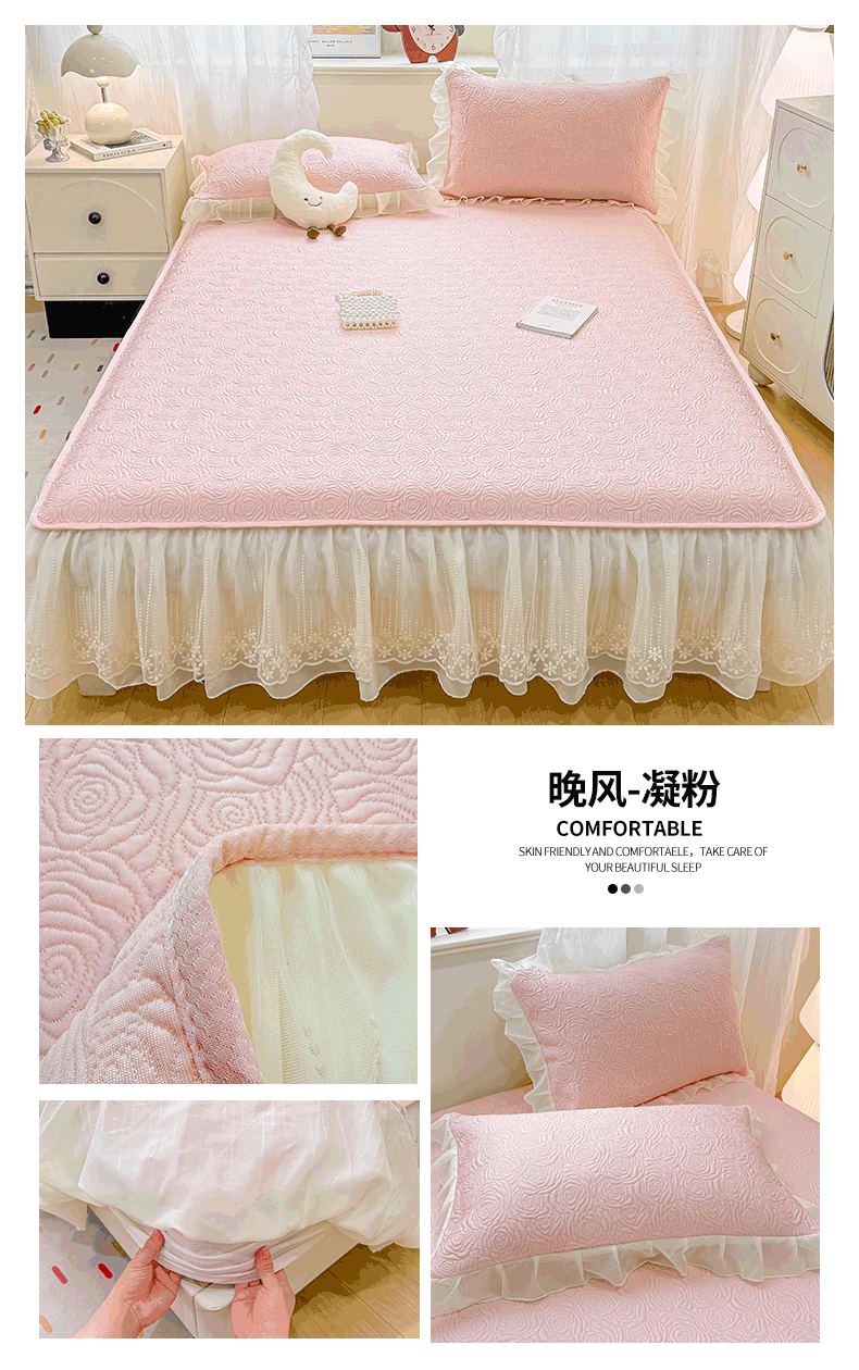 • 91家纺网 家纺一手货源 找家纺 (总)眠势力 2026新款PE提花冰凉豆豆床裙款床笠凉席子冰丝凉感中分子床裙乙纶床裙床笠二合一,晚风-冰蓝,晚风-冷灰,晚风-凝粉,晚风-清绿,晚风-雾米