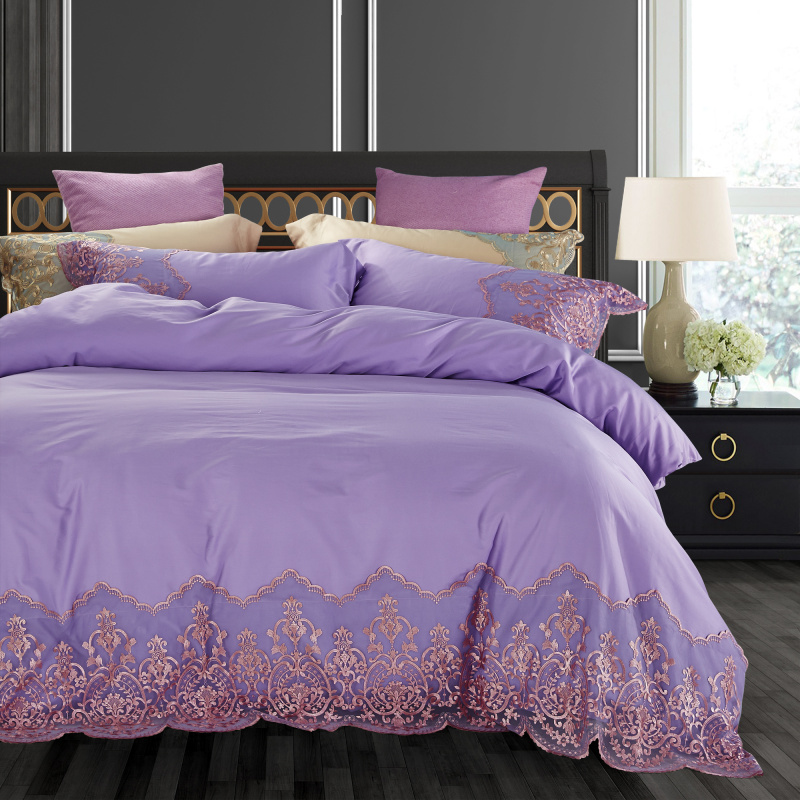 玖玖爱家纺 60s长绒棉蕾丝四件套 雪青