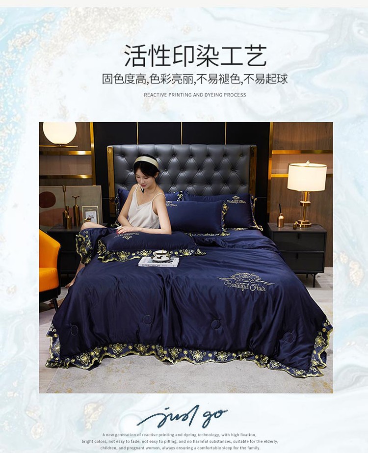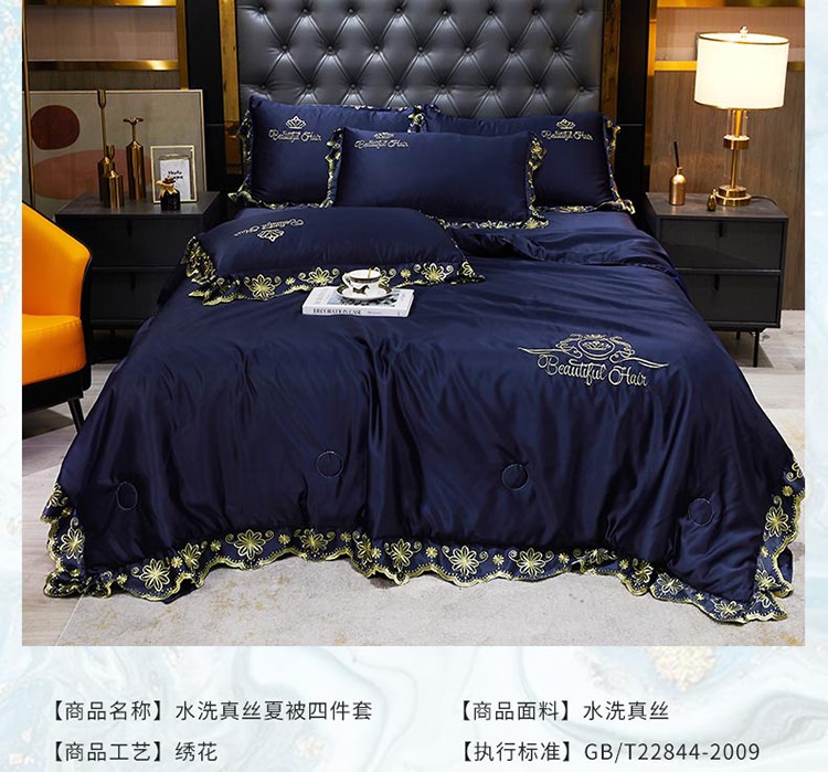 • 91家纺网 家纺一手货源 找家纺 铠畅 纳威水洗真丝夏被空调被四件套春夏刺绣床单款天丝夏凉被套件 深蓝