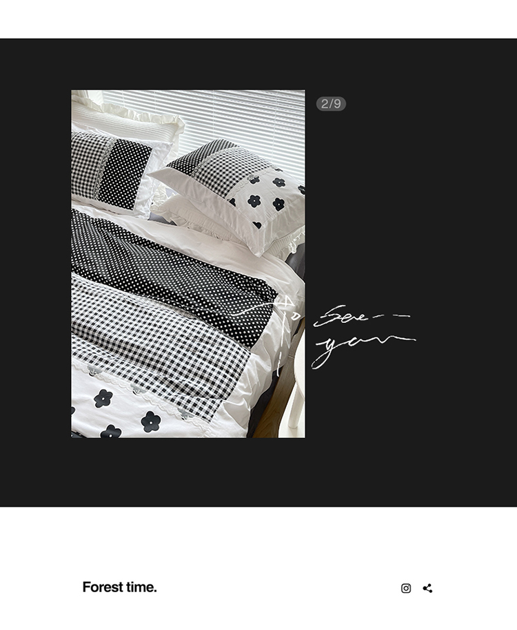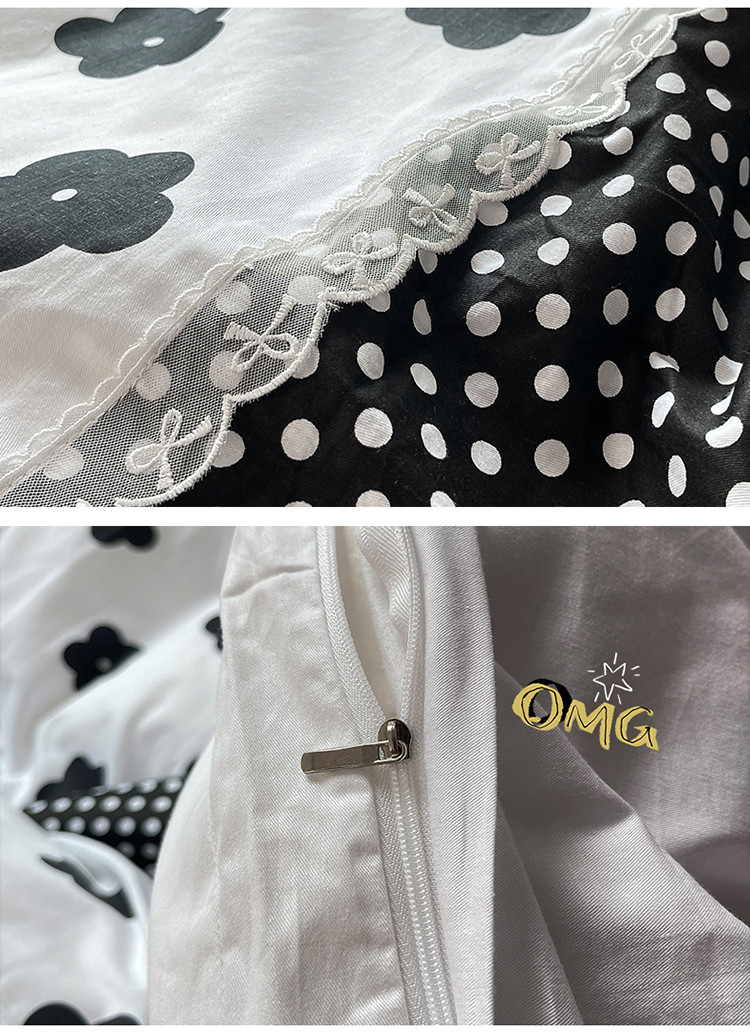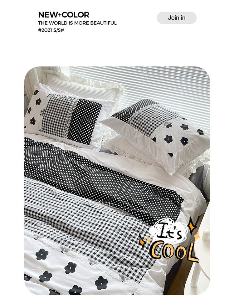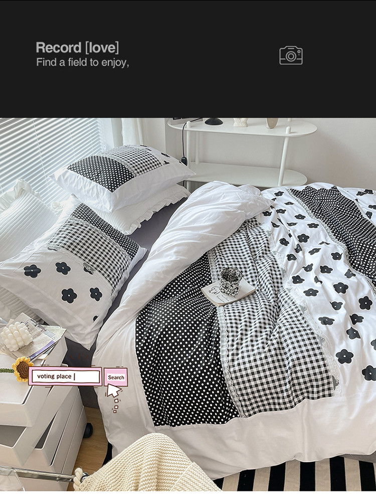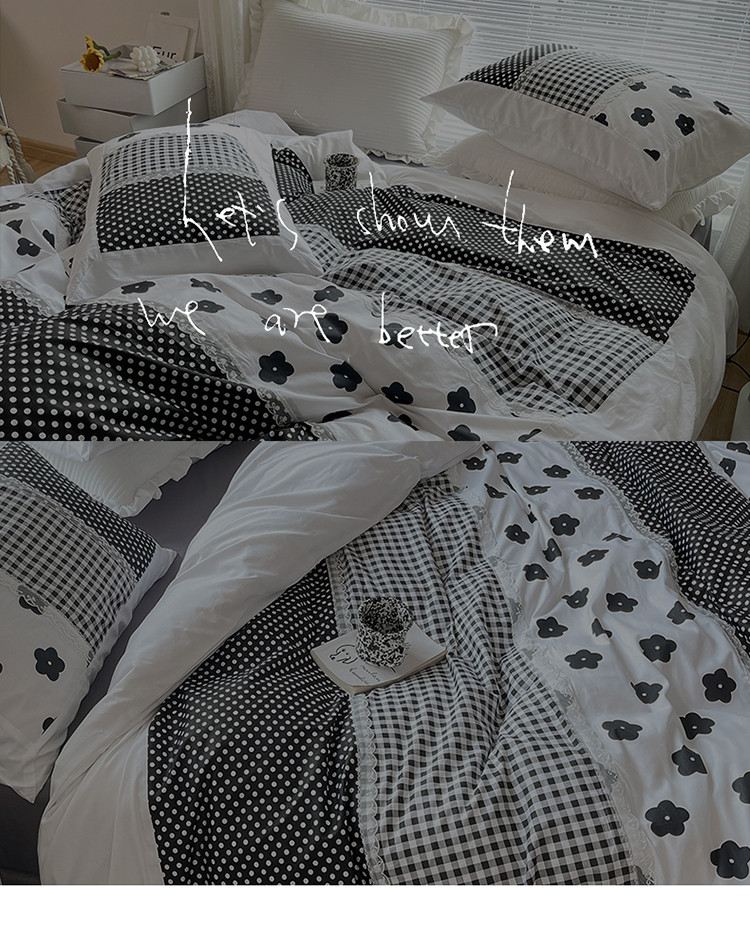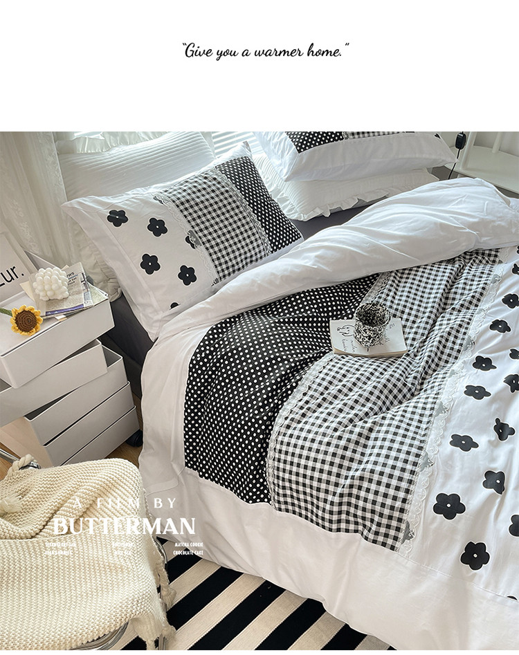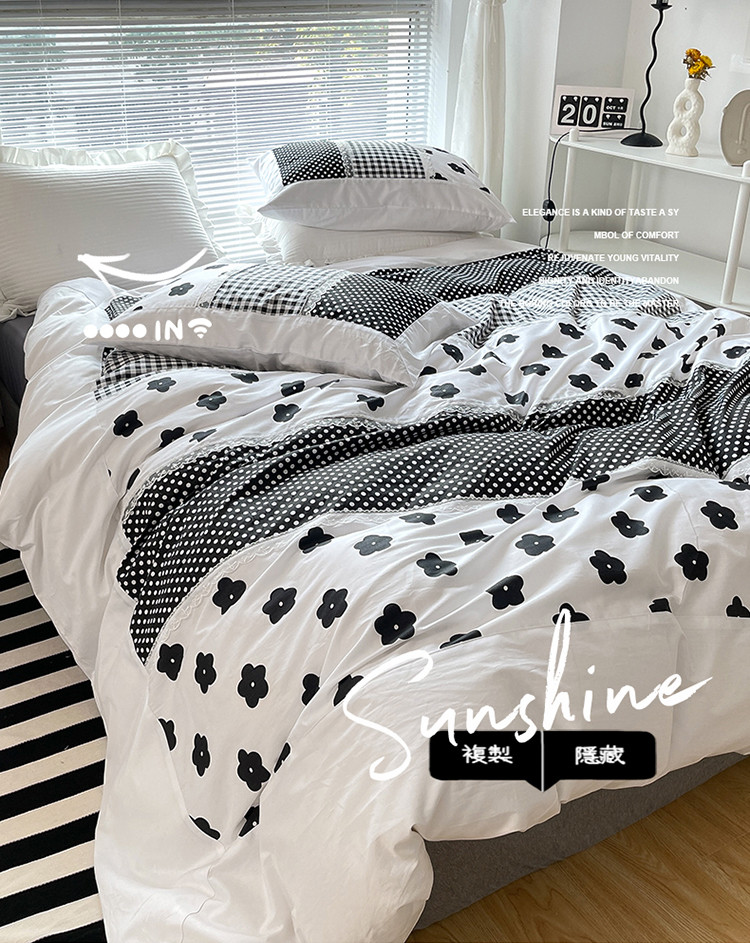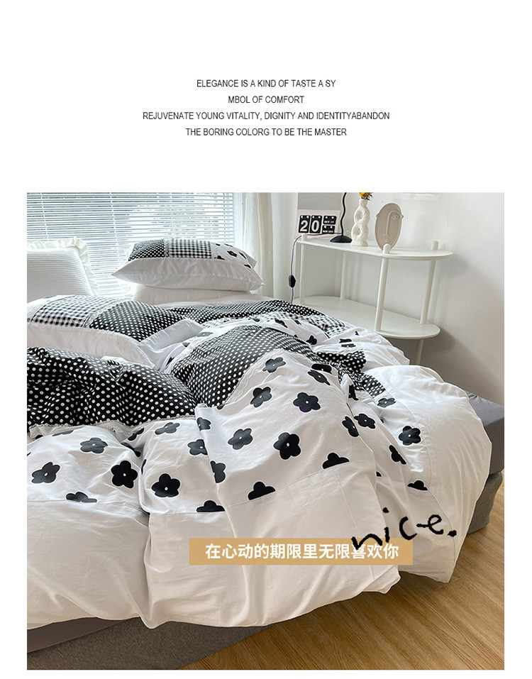婳庭 2021新款黑白拼接款四件套 山茶花-白