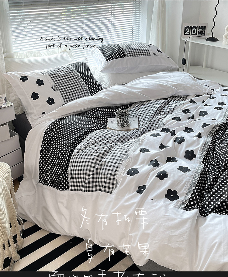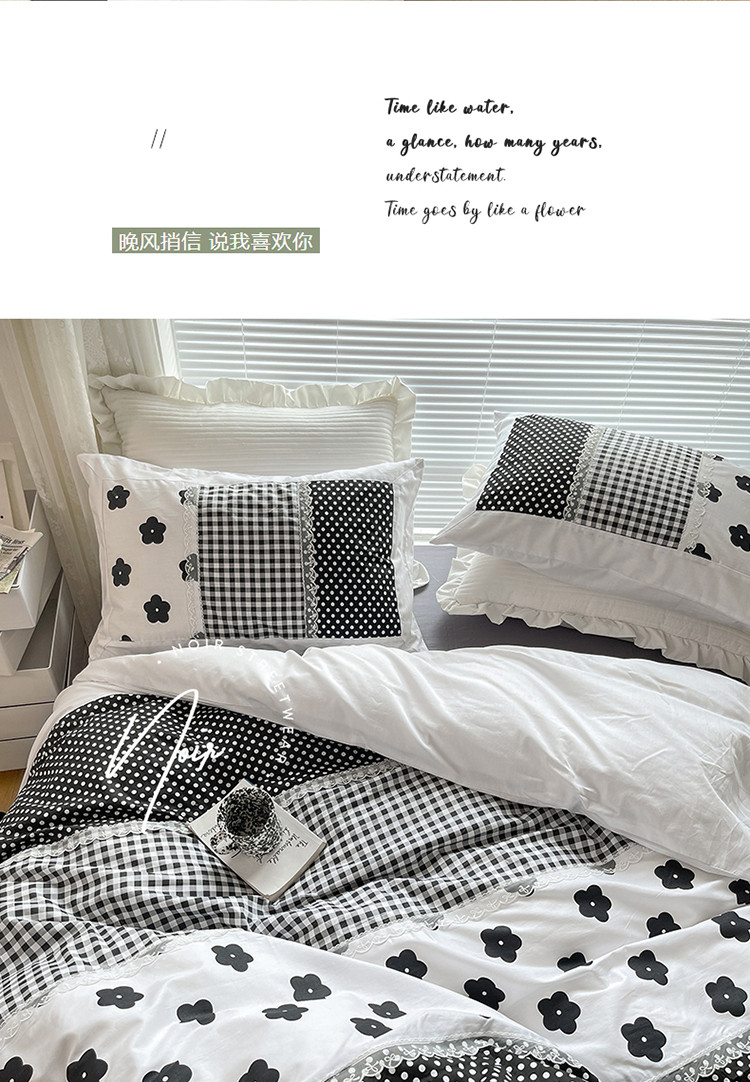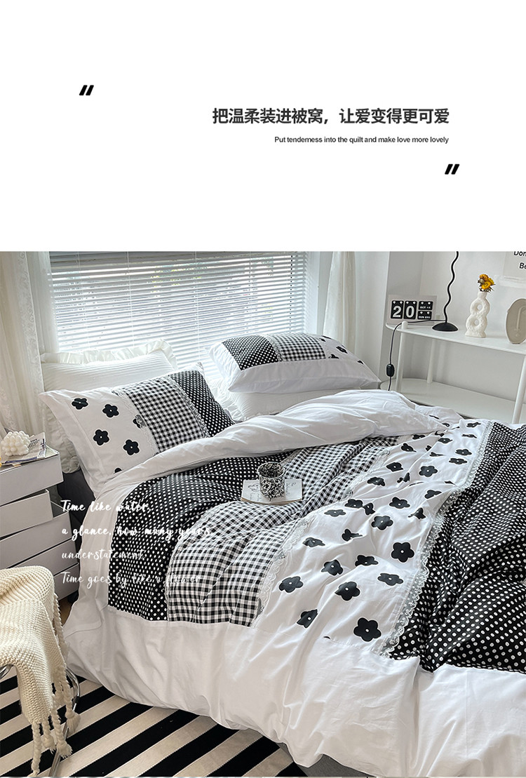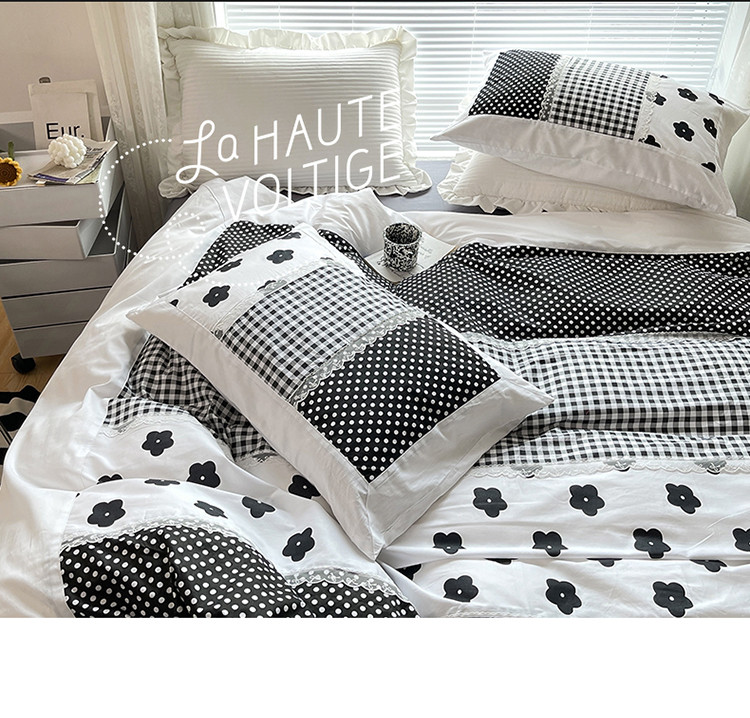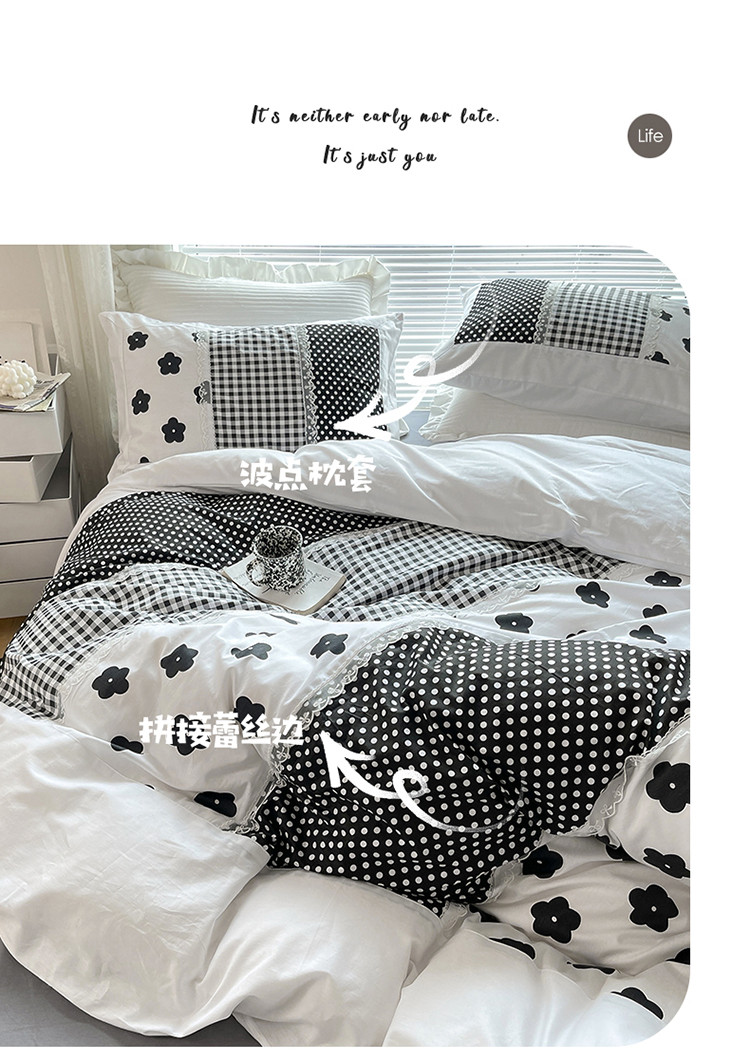 商品名称:婳庭 2021新款黑白拼接款四件套 山茶花-白