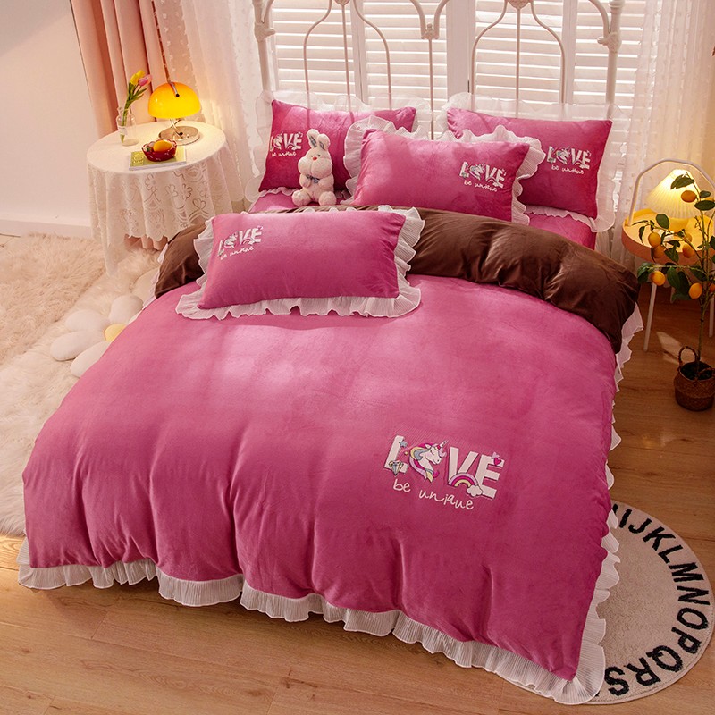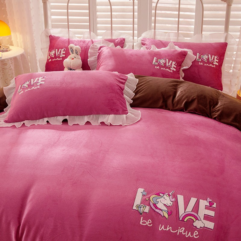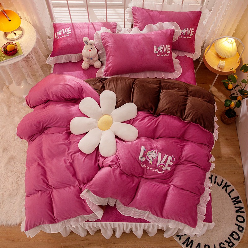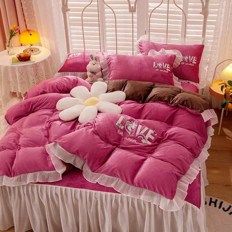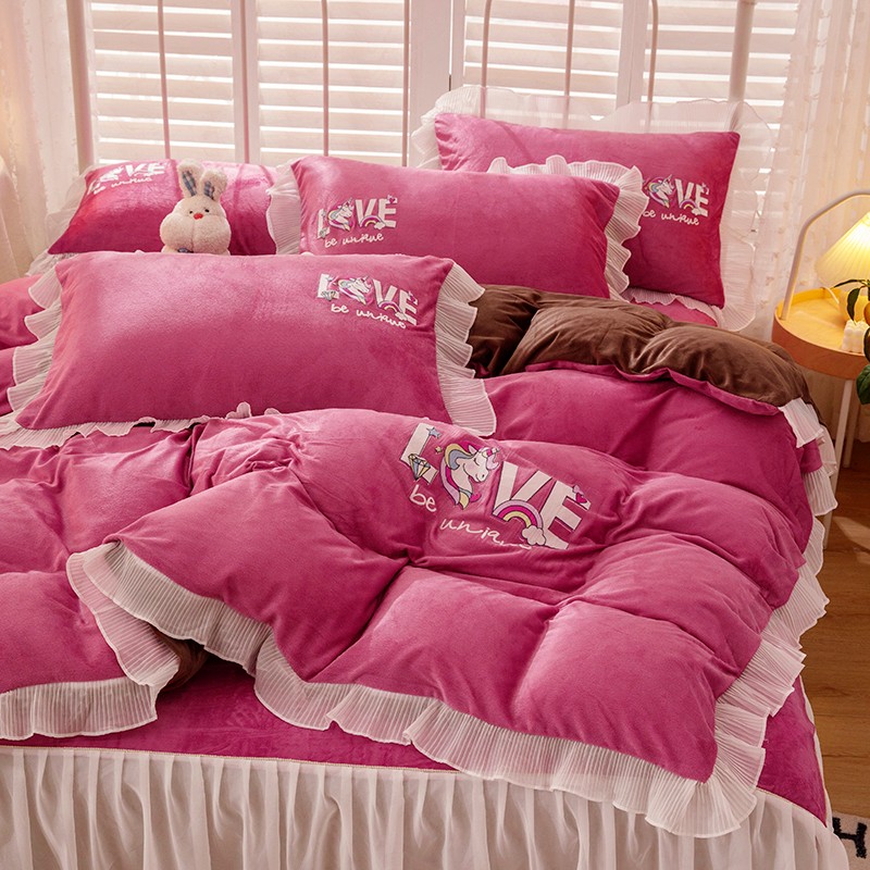 纽缦 2021新款韩版水晶绒床裙四件套 独角兽-豆沙咖