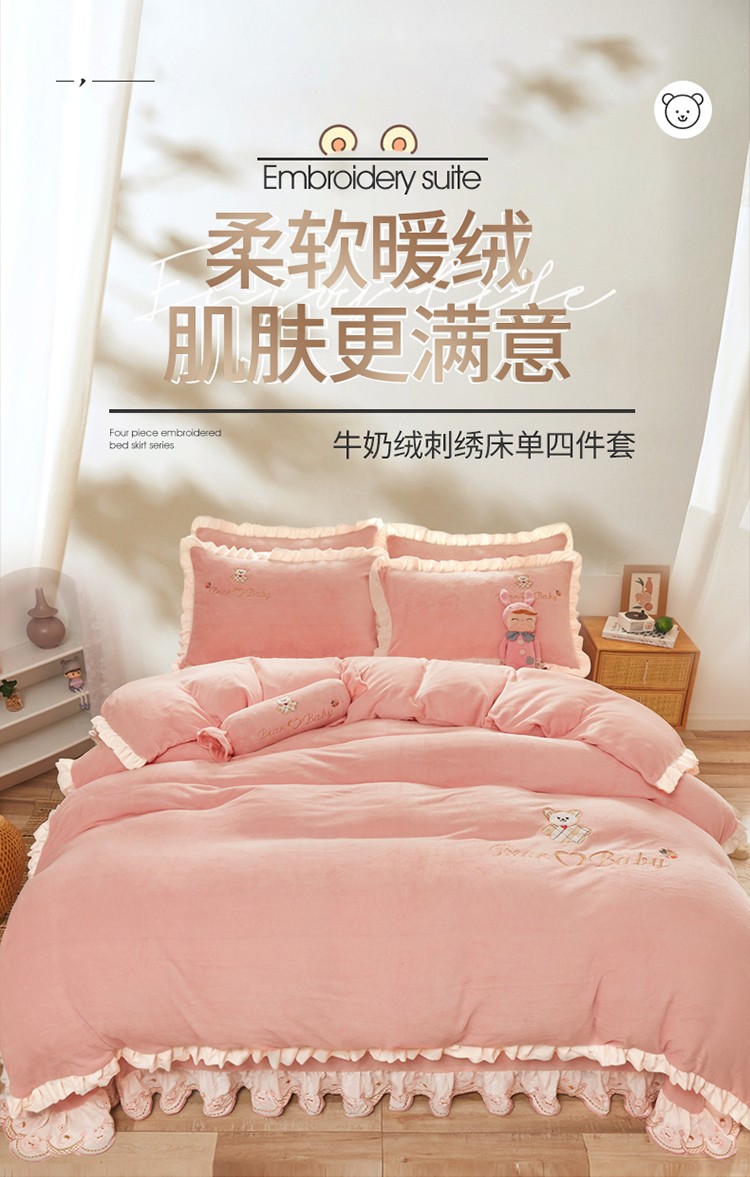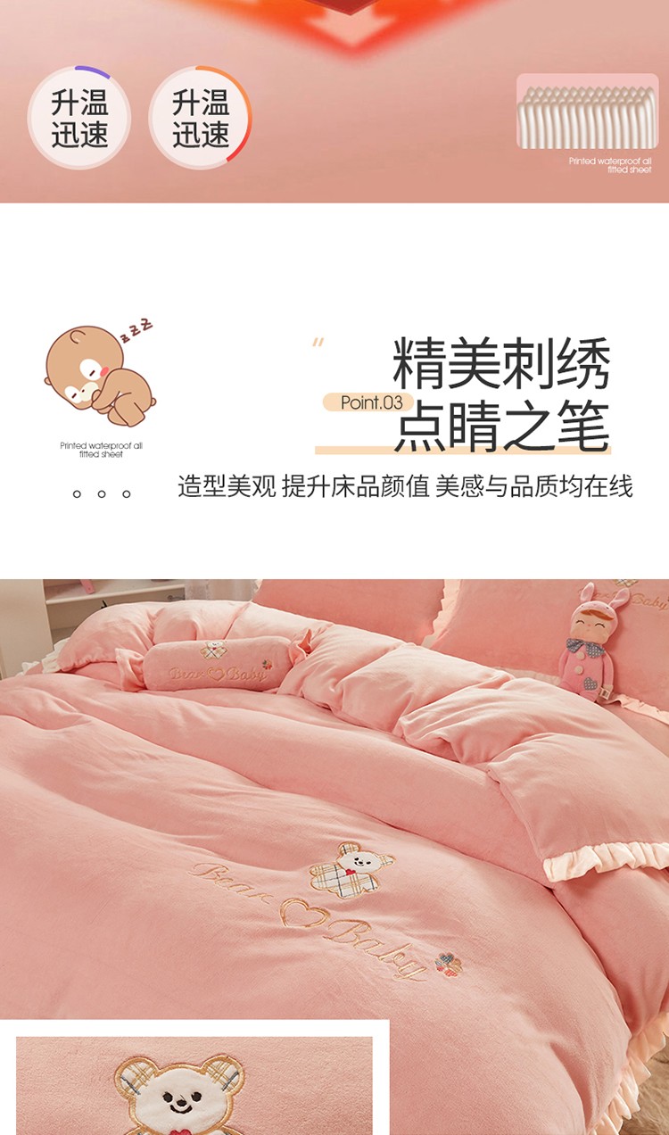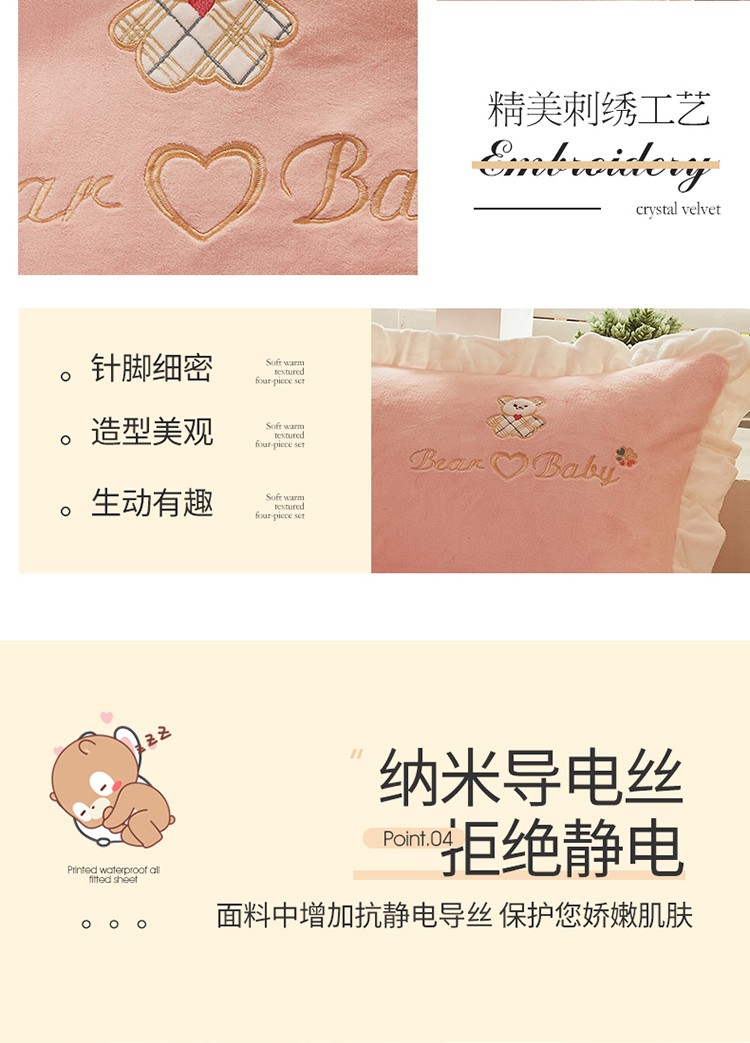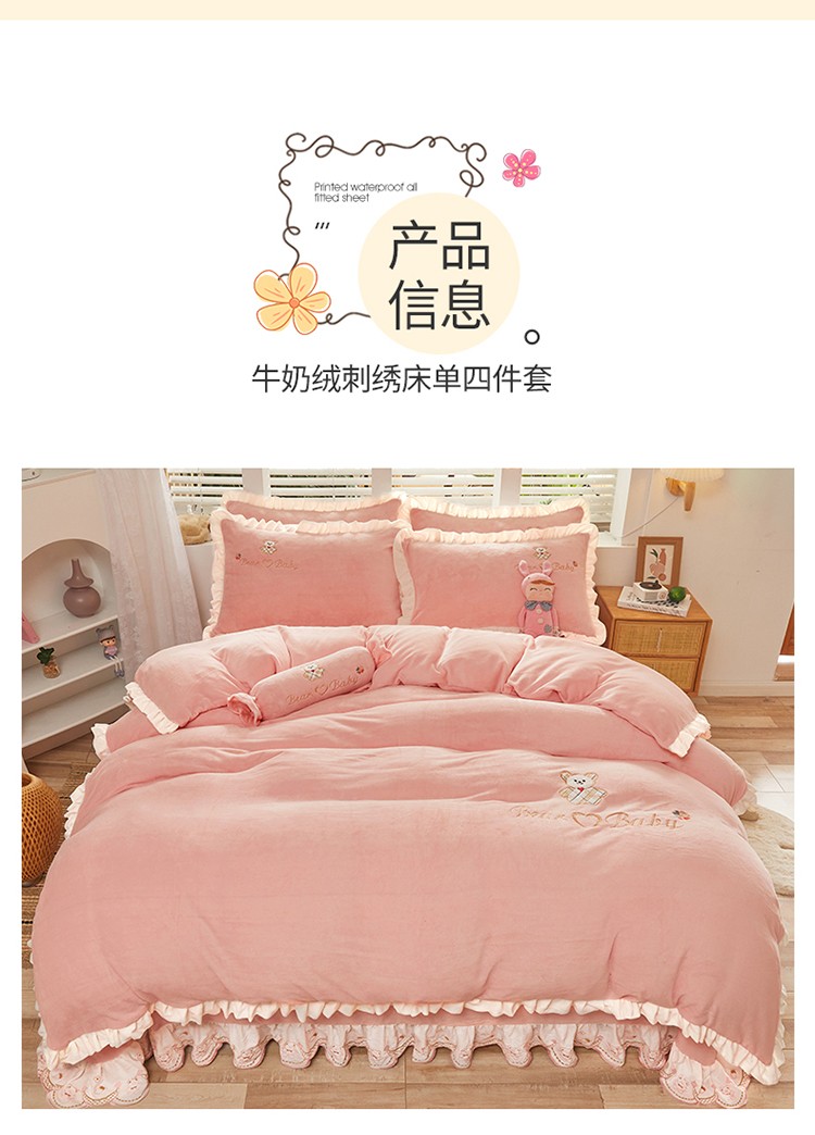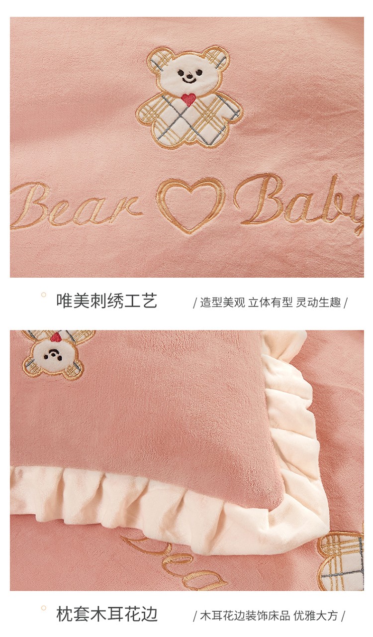 商品名称:宜凡家纺 2021新款牛奶绒绣花熊床单四件套 可爱熊-仙粉
