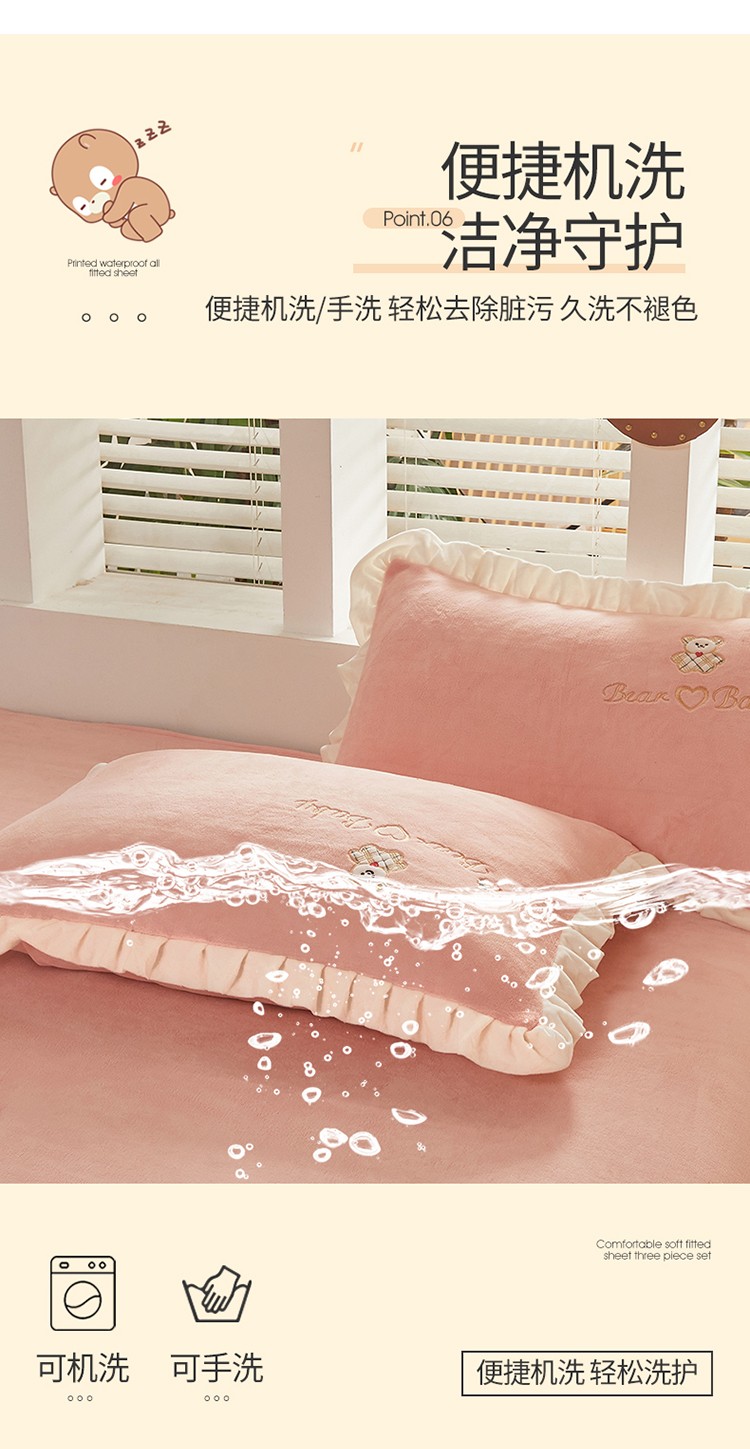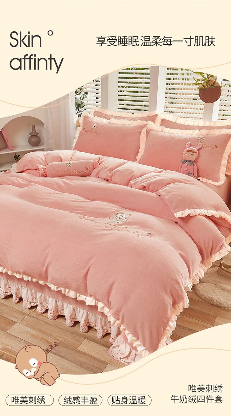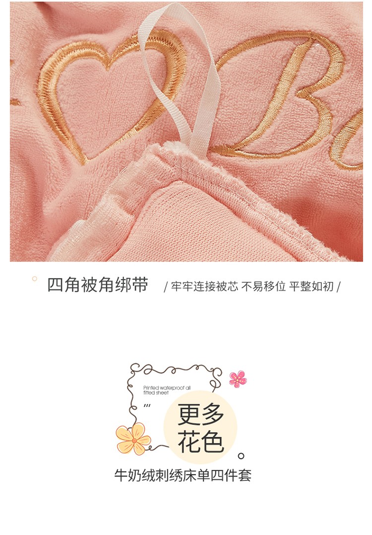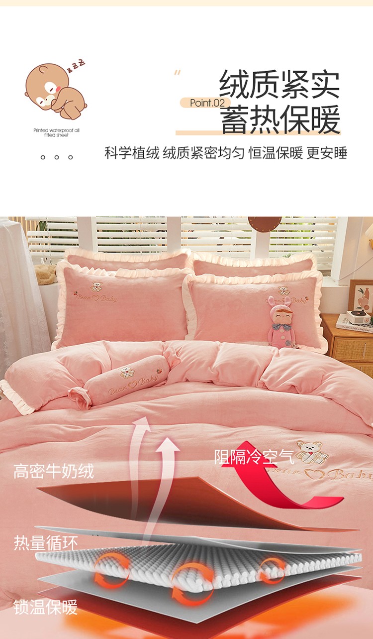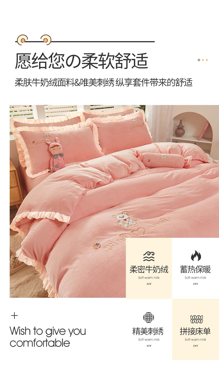 商品名称:宜凡家纺 2021新款牛奶绒绣花熊床单四件套 可爱熊-仙粉