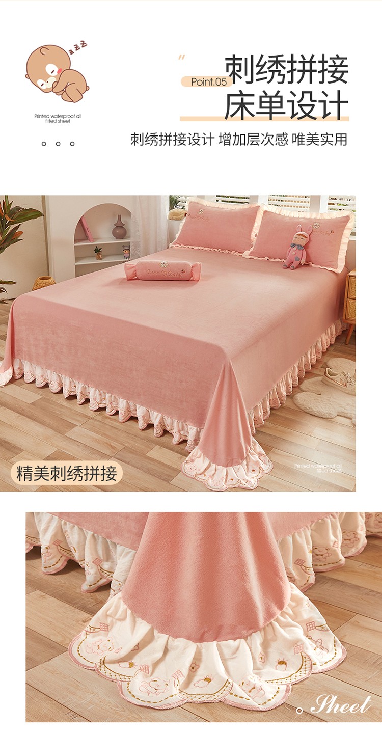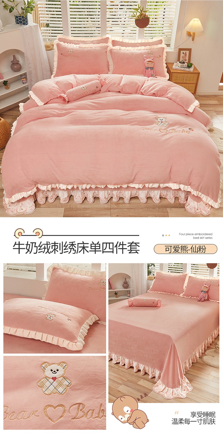宜凡家纺 2021新款牛奶绒绣花熊床单四件套 可爱熊-仙粉