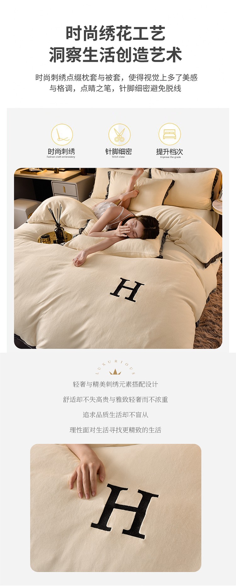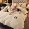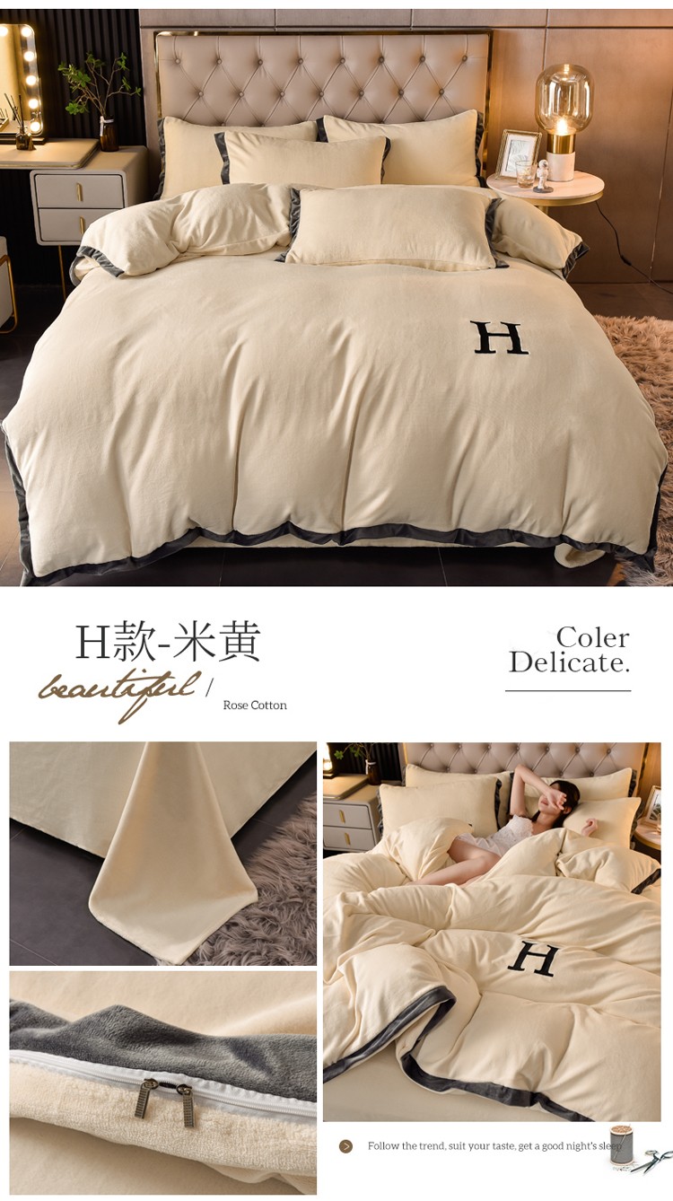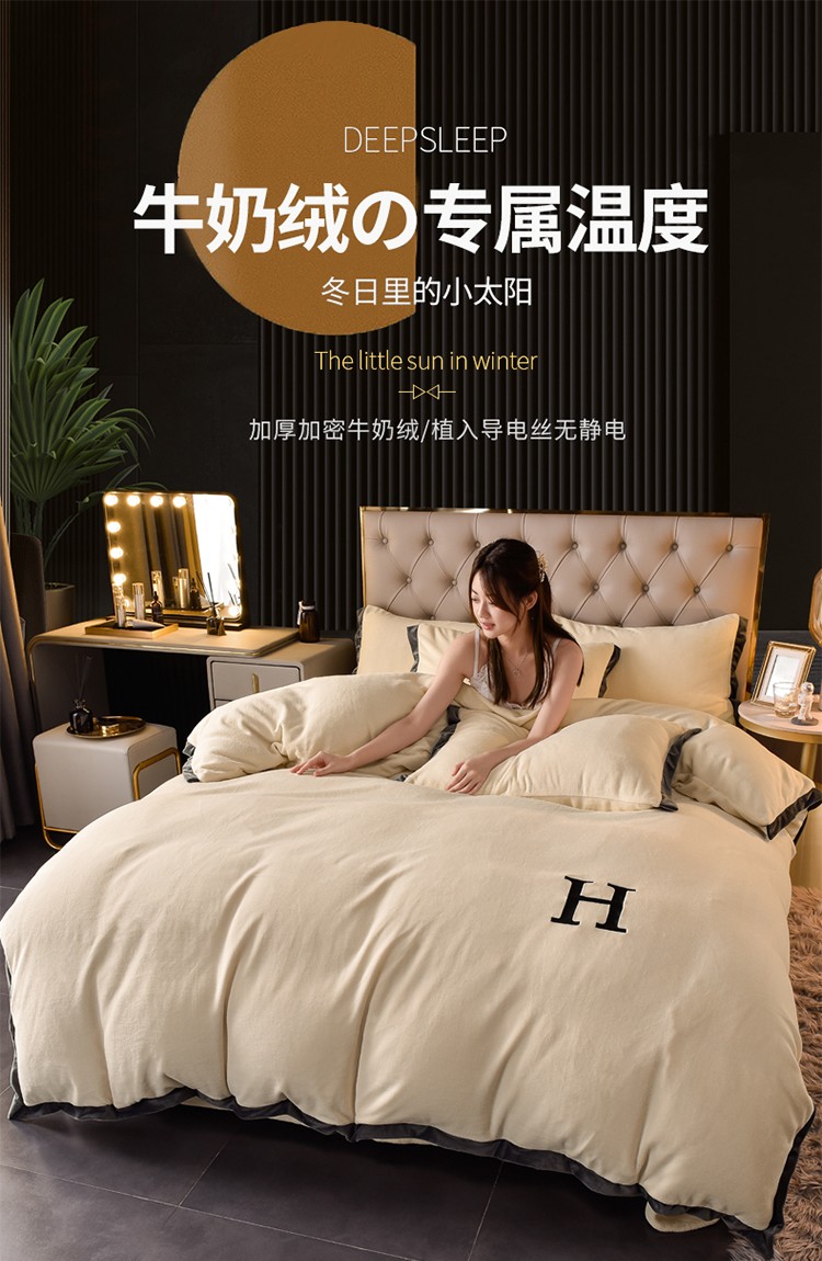 商品名称:简爱家纺2025款高克重牛奶绒拼角工艺四件套 H款-米黄