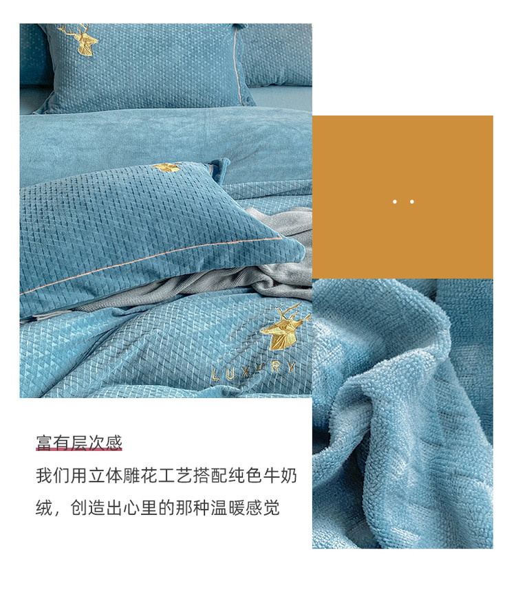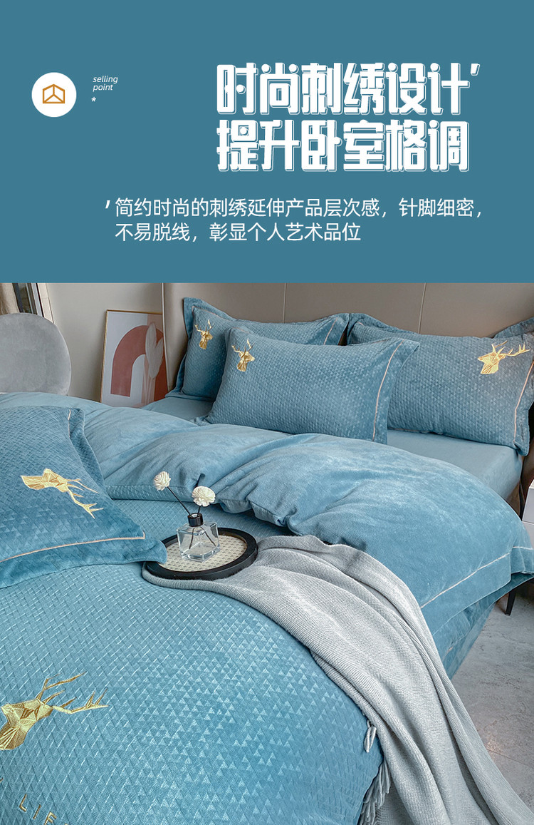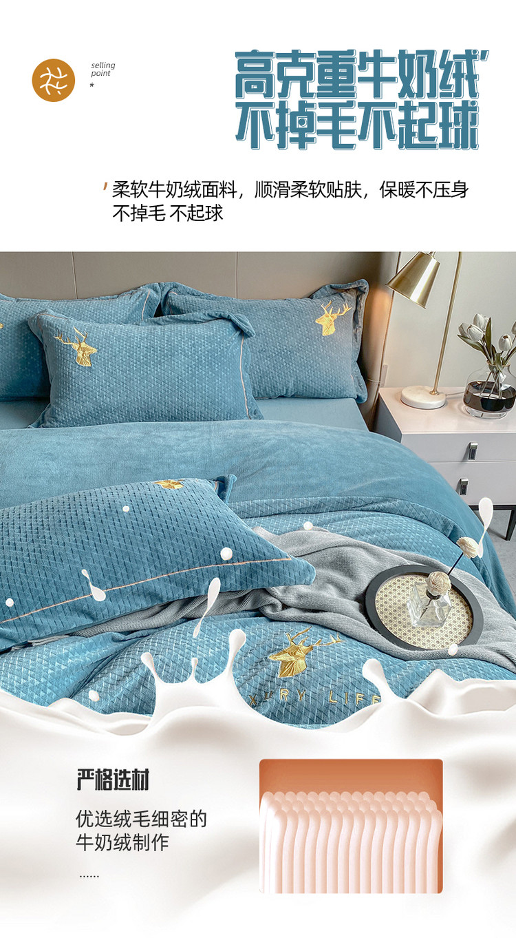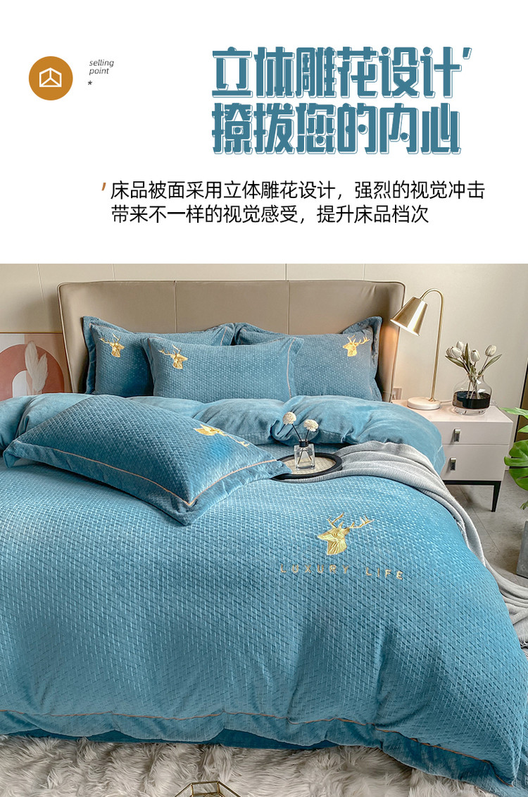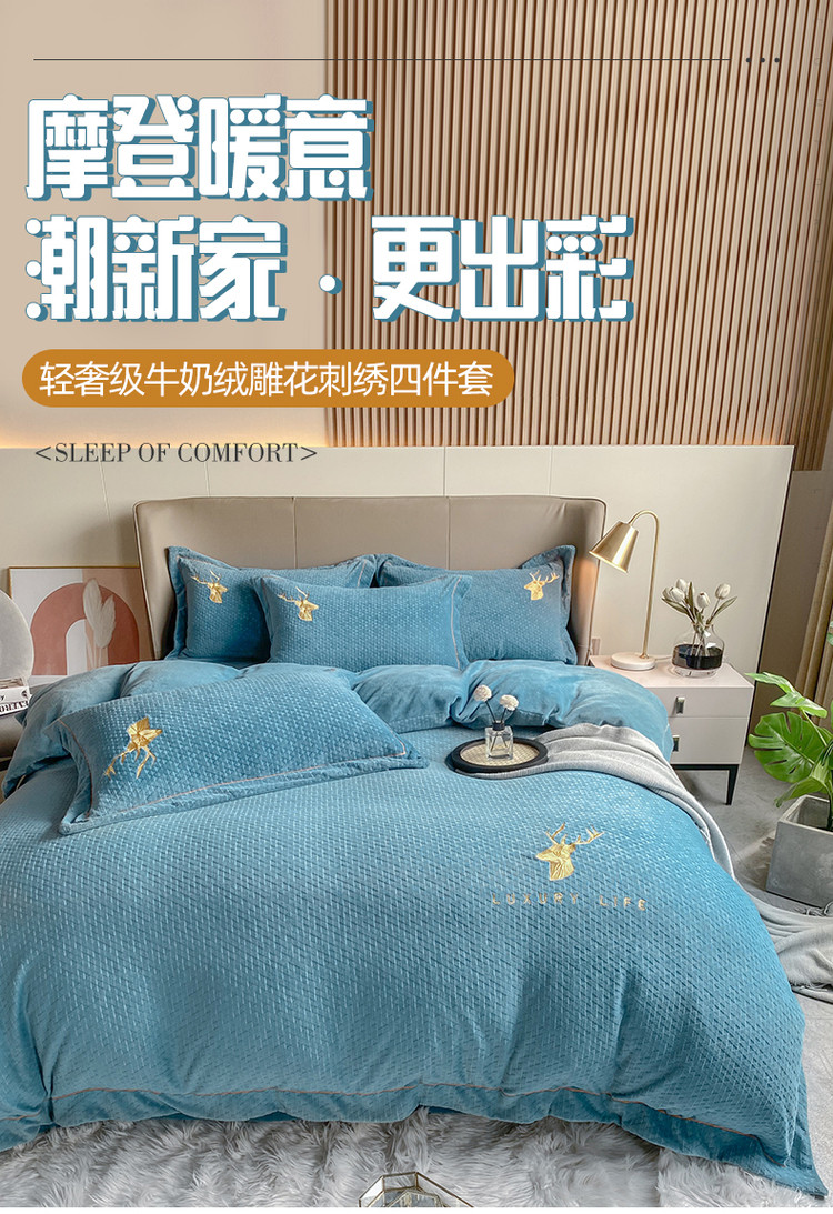 棉生活家纺 2021新款牛奶绒雕花刺绣四件套 野格-蓝