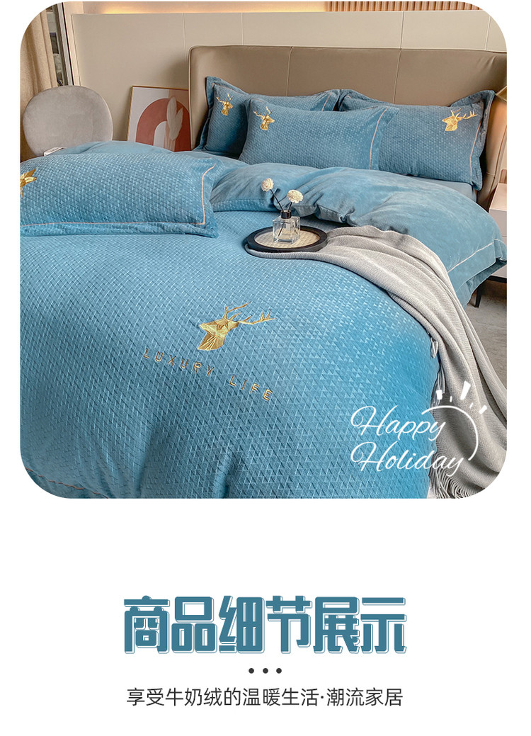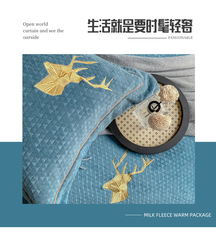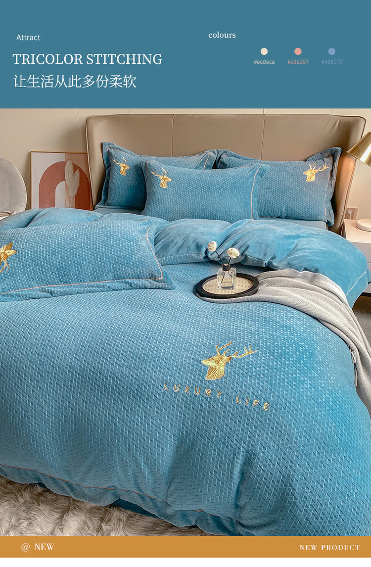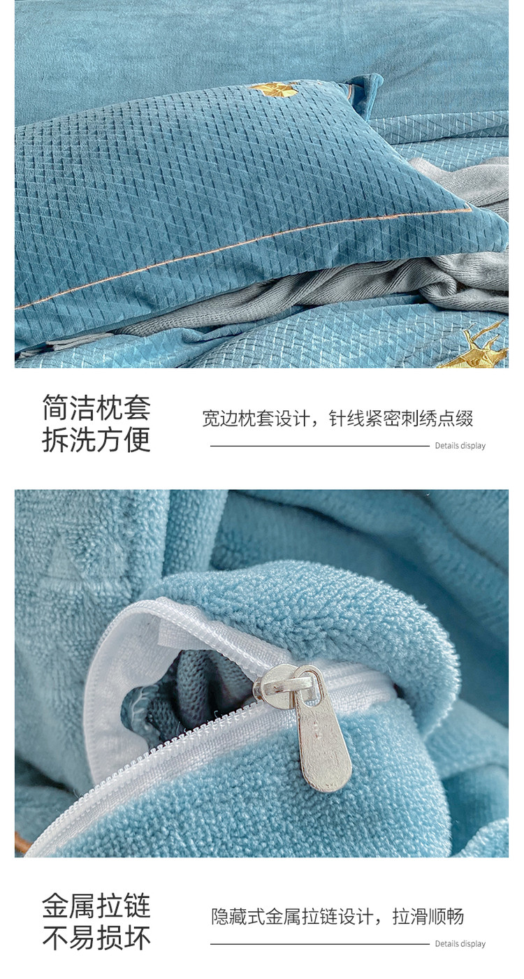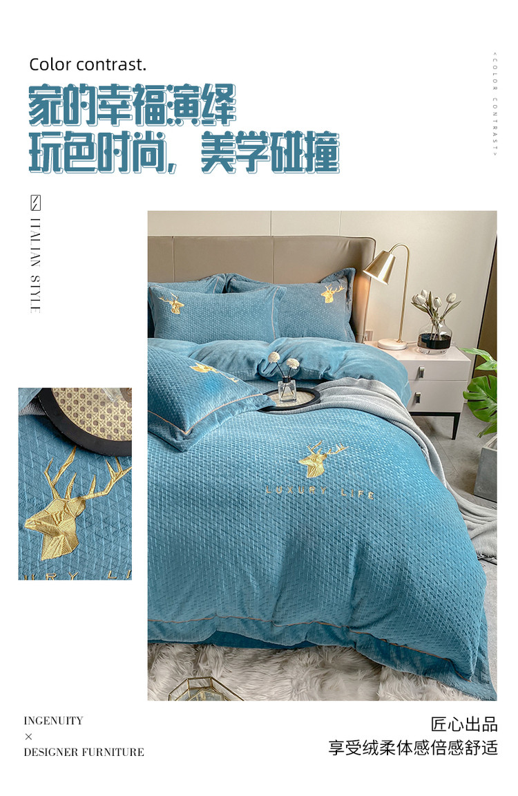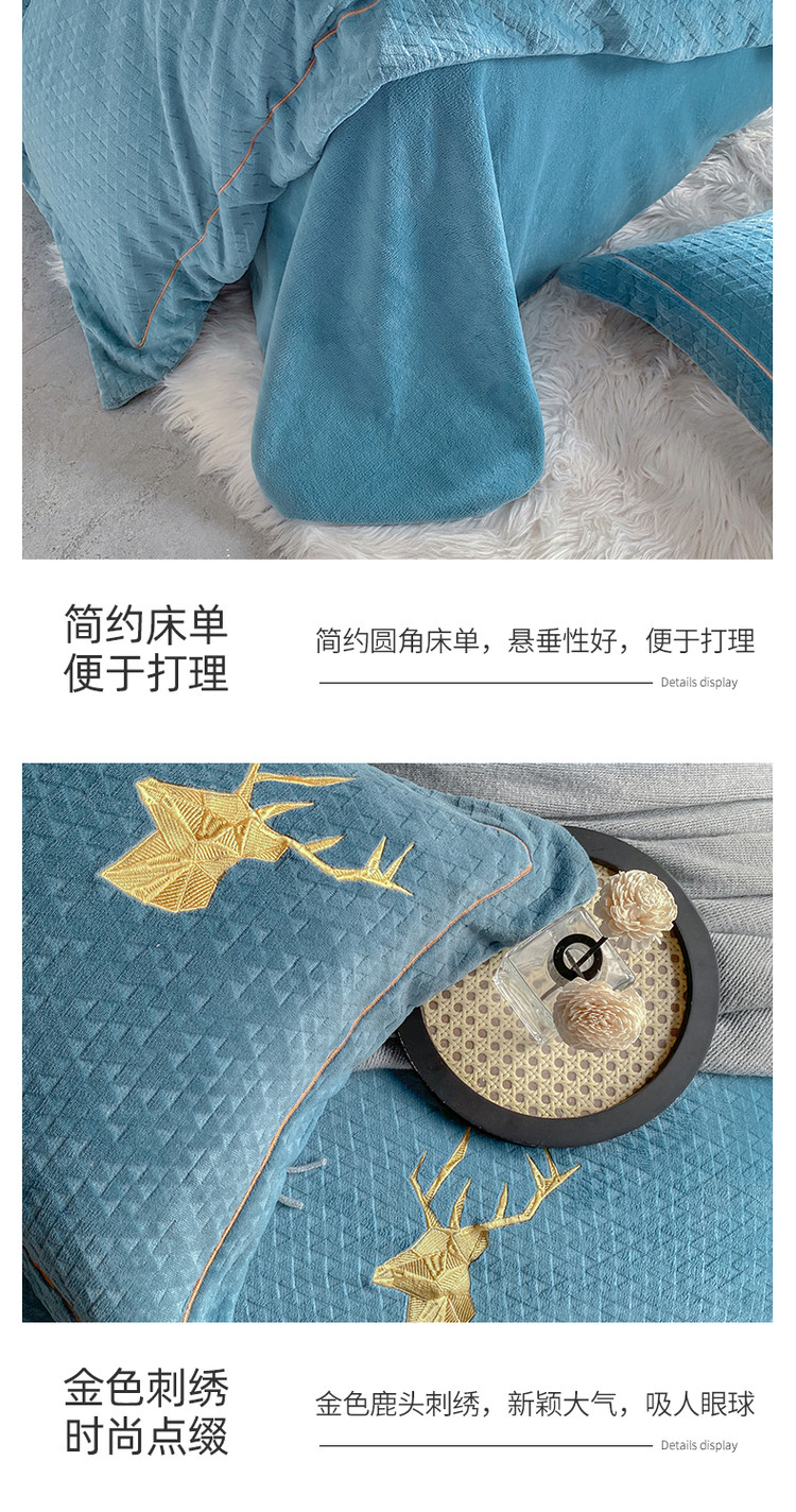 棉生活家纺 2021新款牛奶绒雕花刺绣四件套 野格-蓝