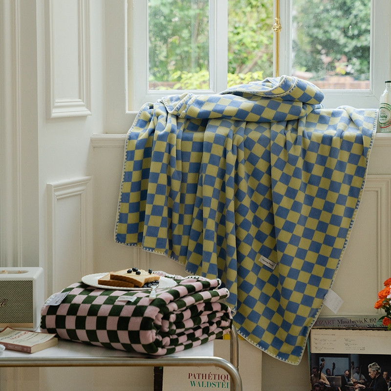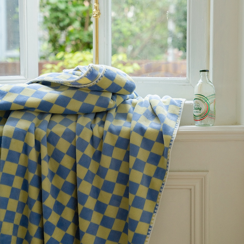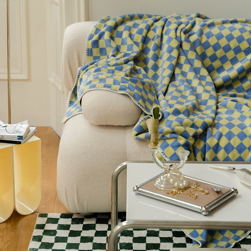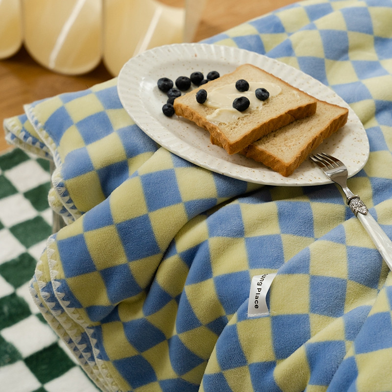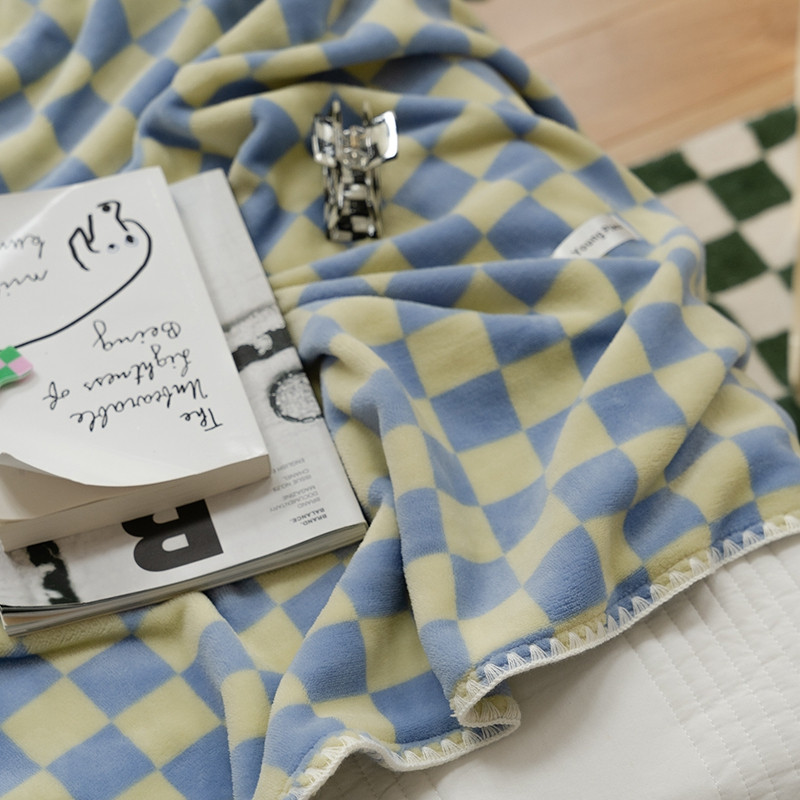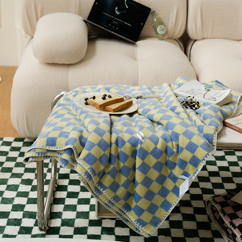 洋铭区 2021冬季新品棋盘格双色牛奶绒毯子 水雾蓝