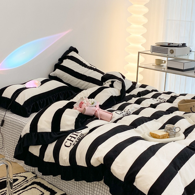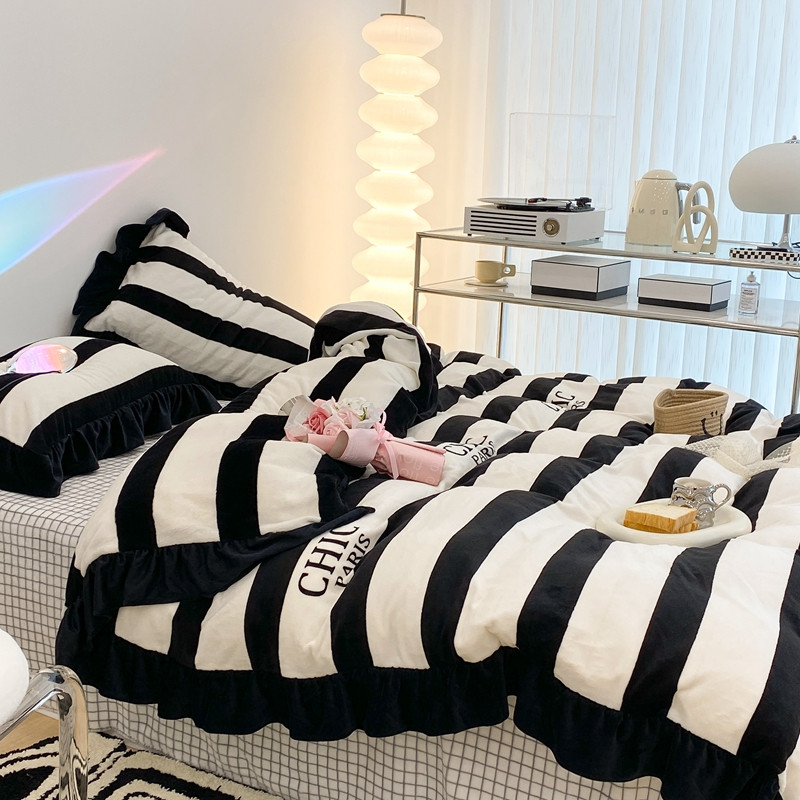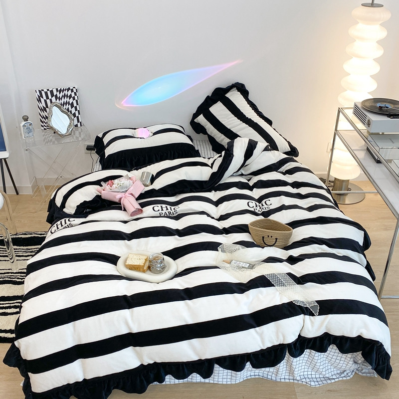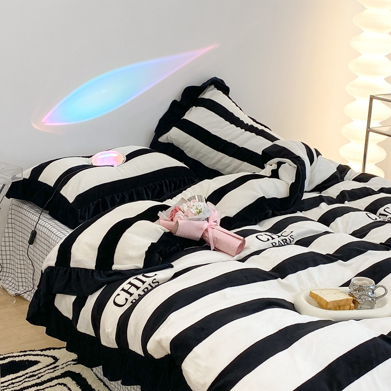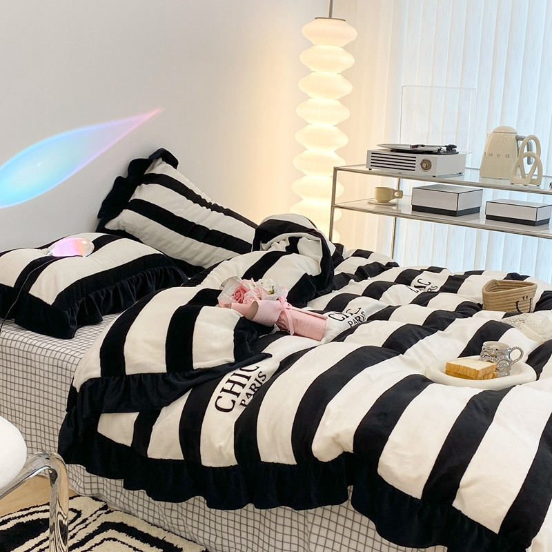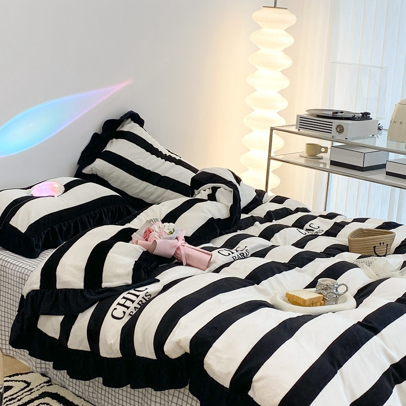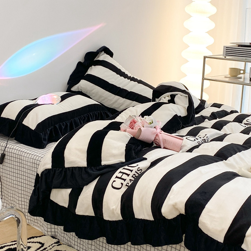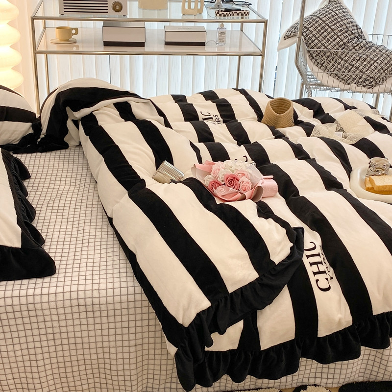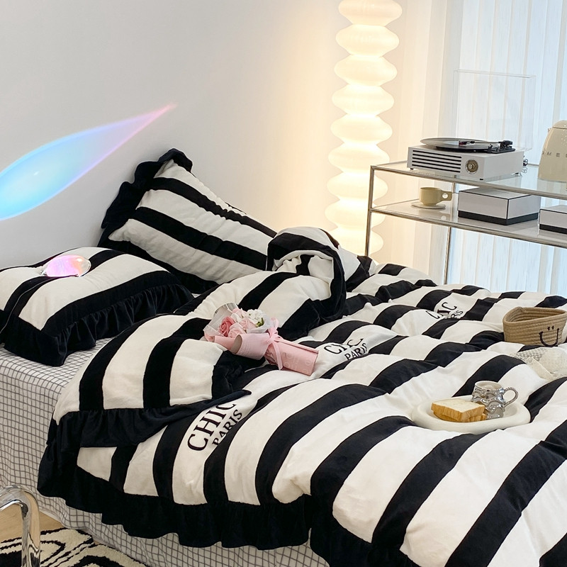 昔可 2021新款黑色花边牛奶绒四件套 香香条纹