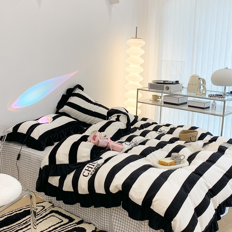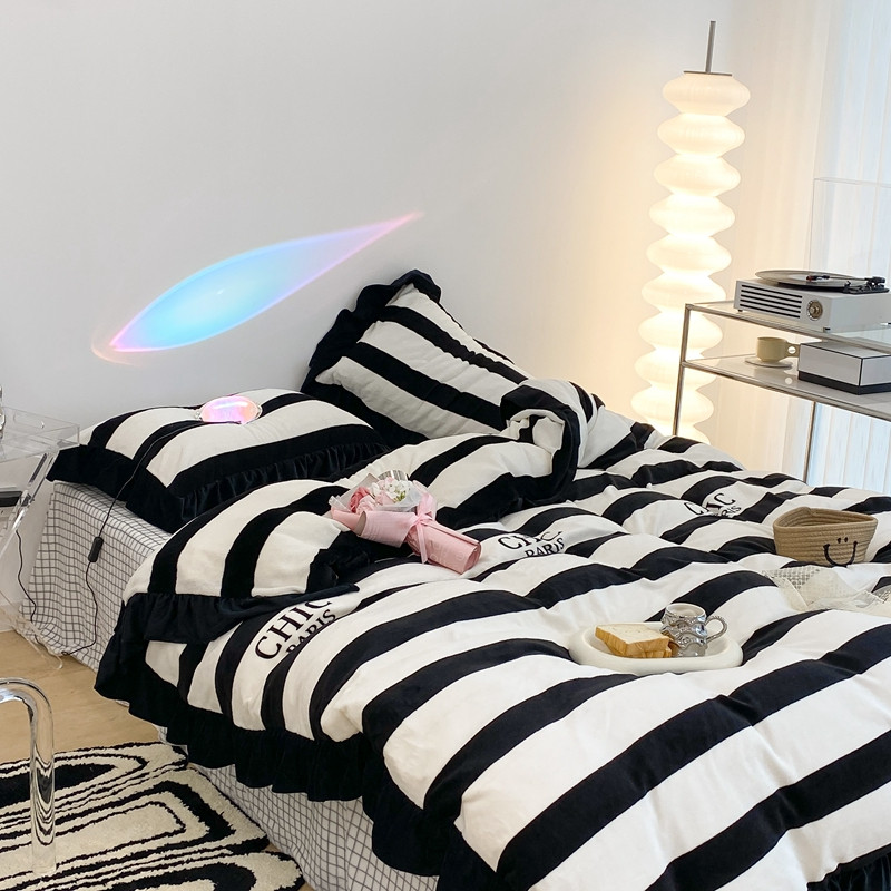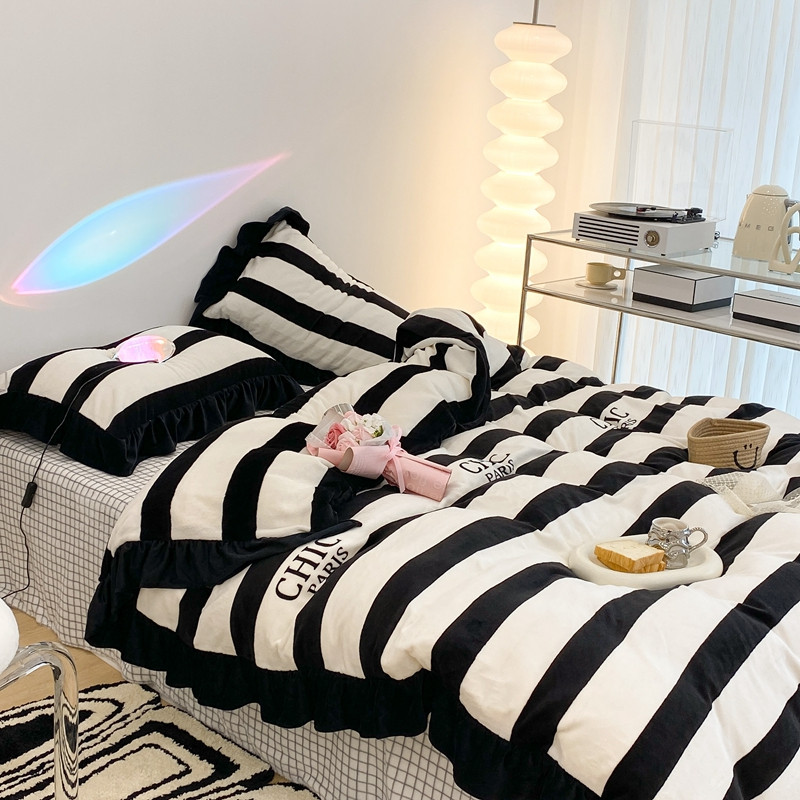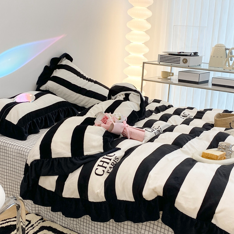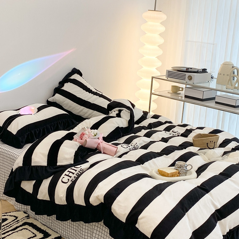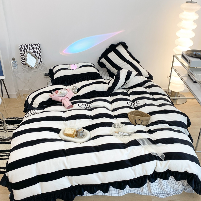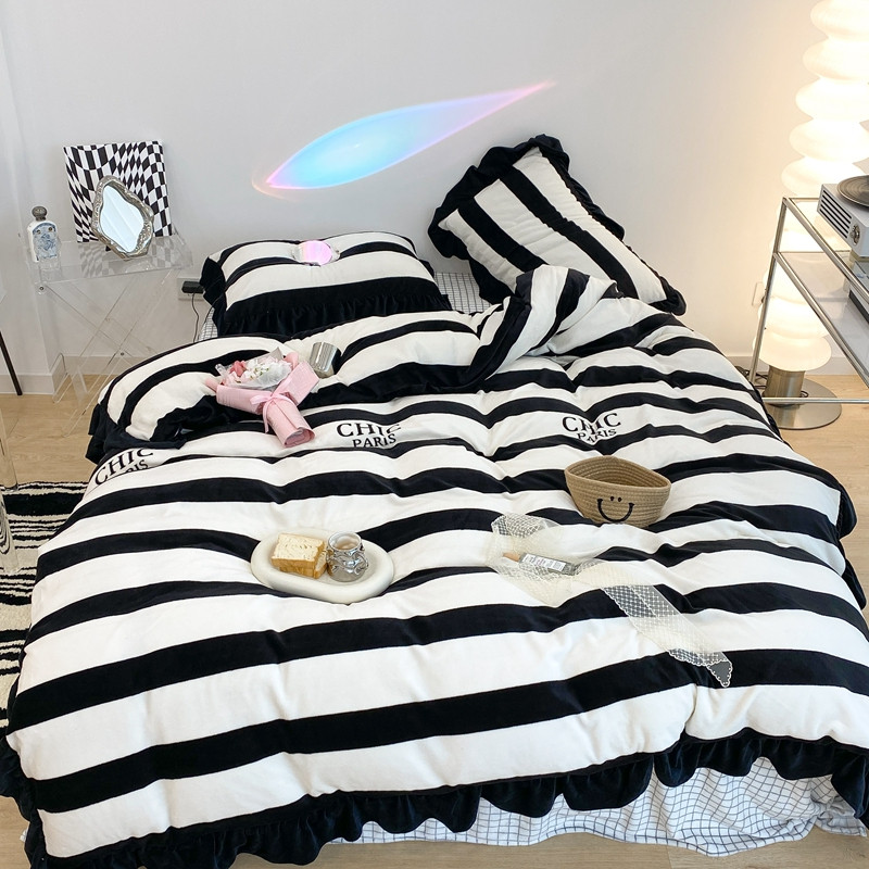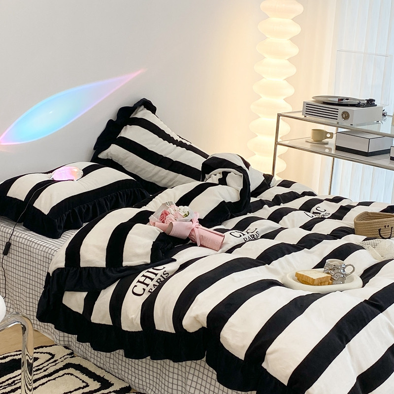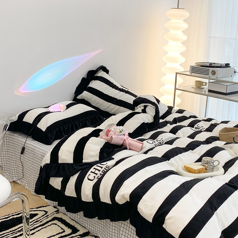 昔可 2021新款黑色花边牛奶绒四件套 香香条纹