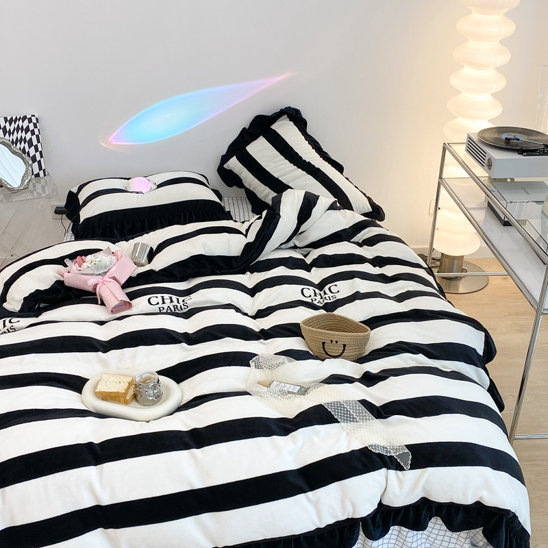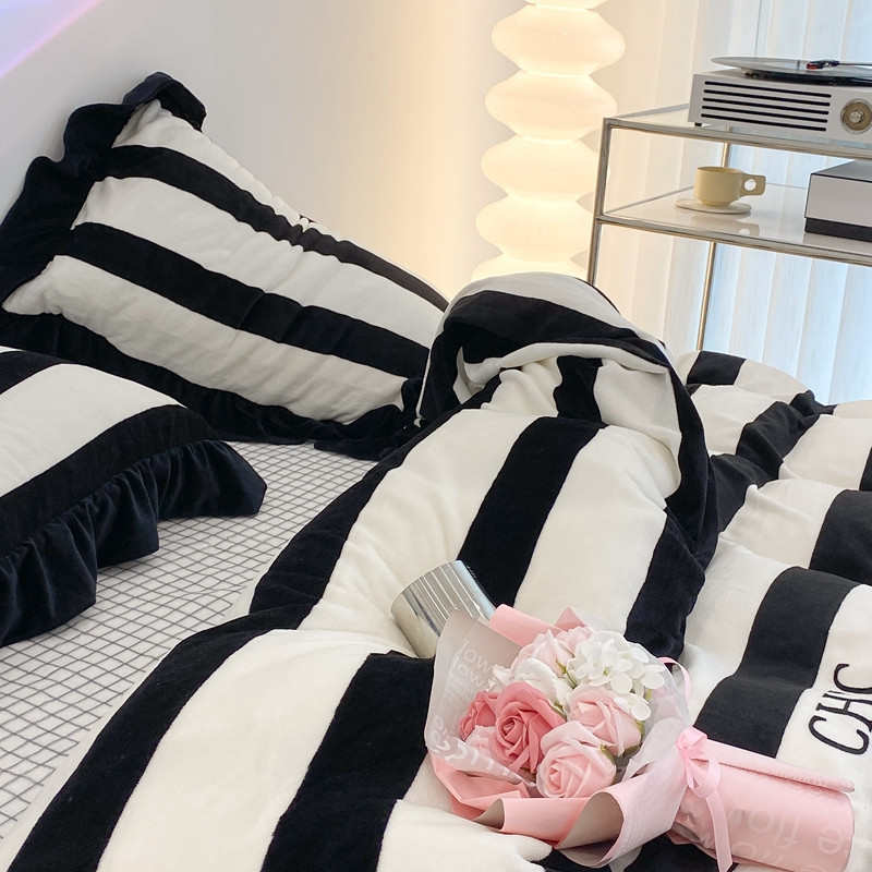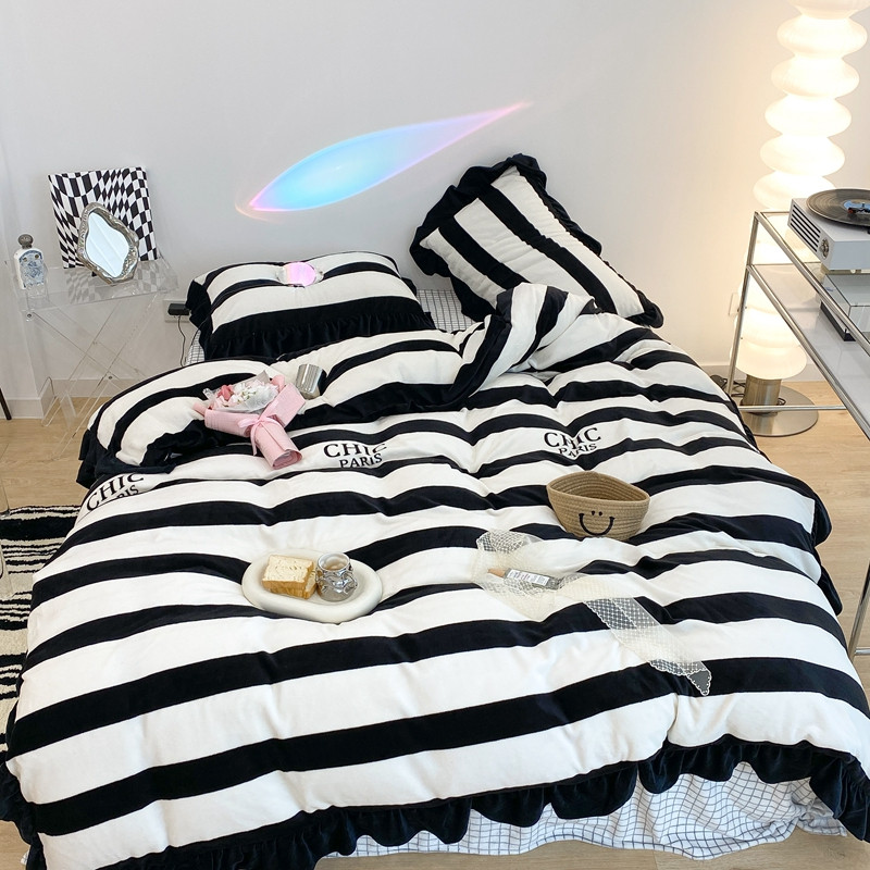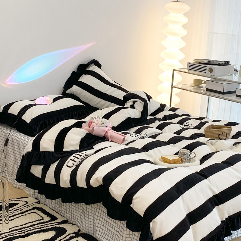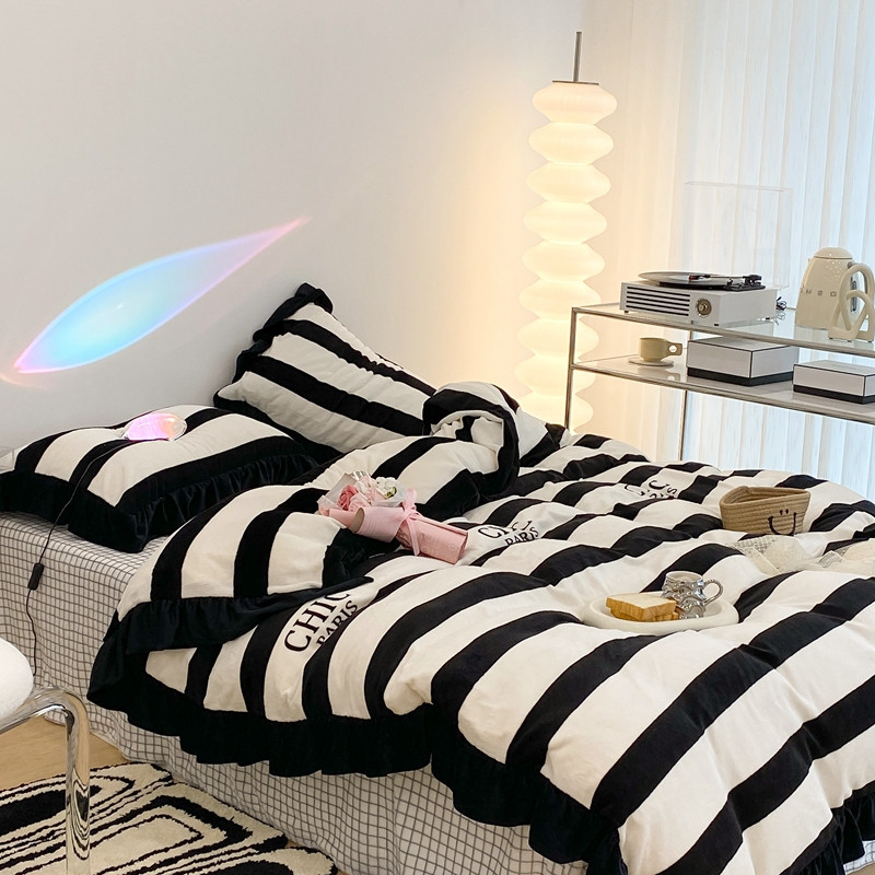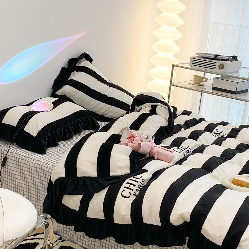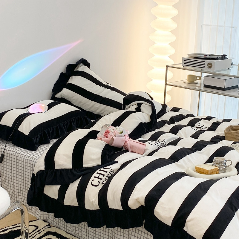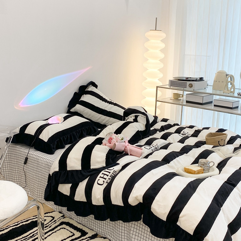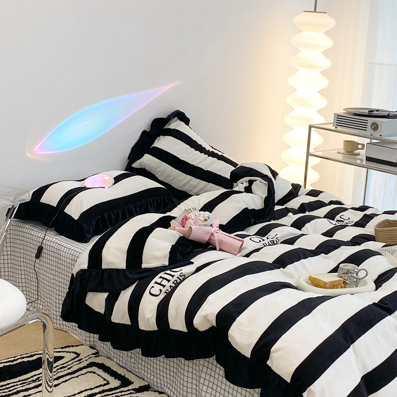 昔可 2021新款黑色花边牛奶绒四件套 香香条纹