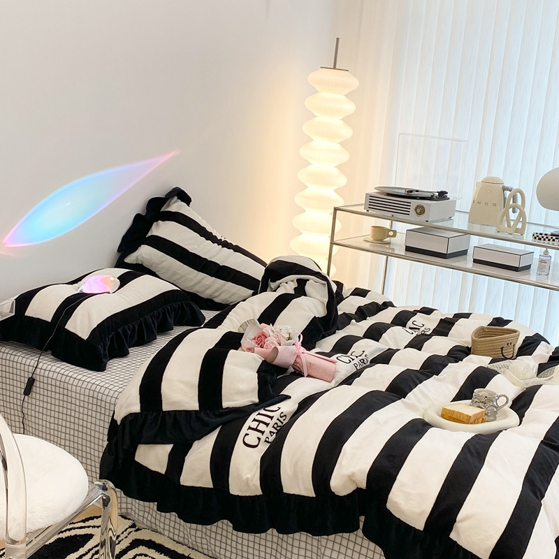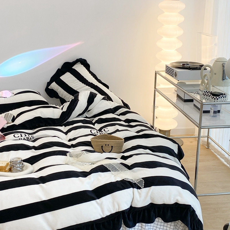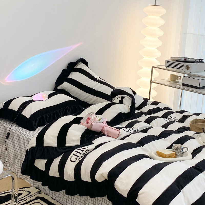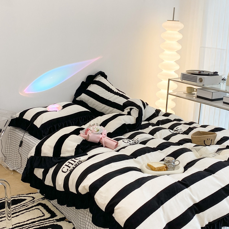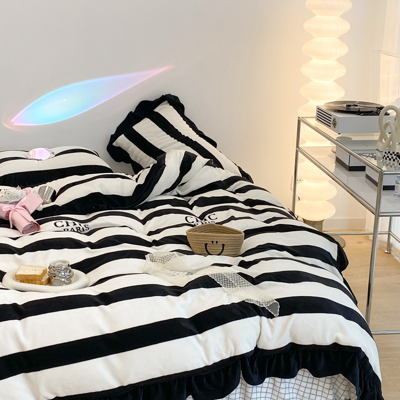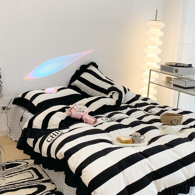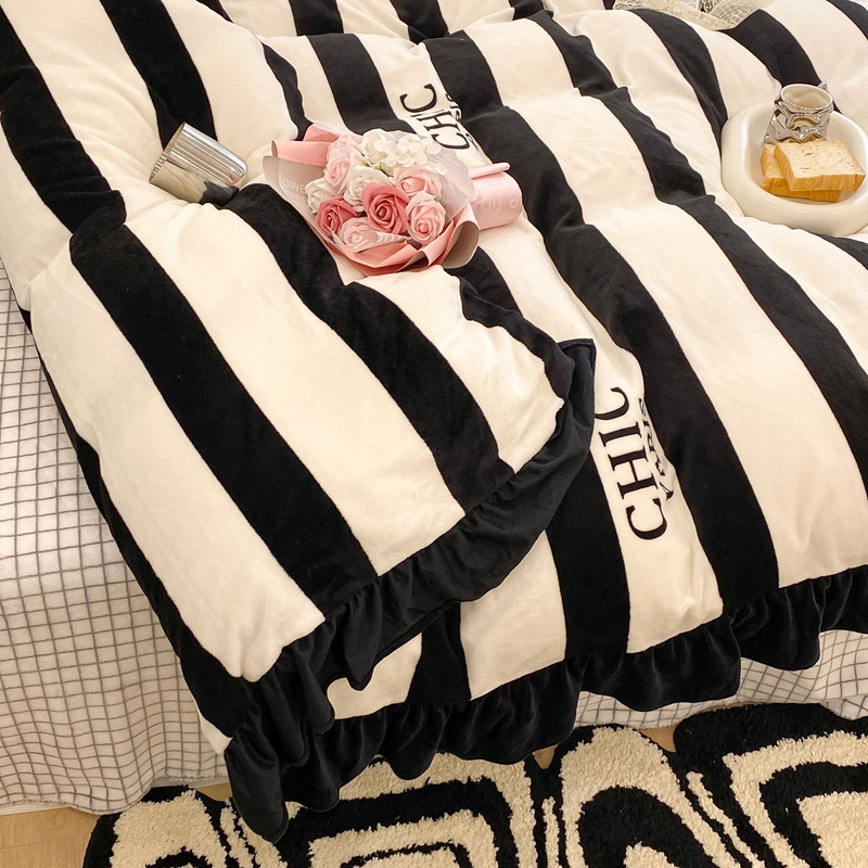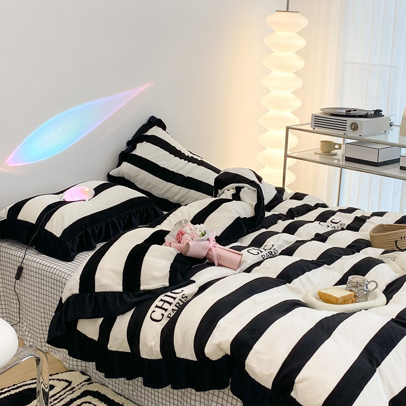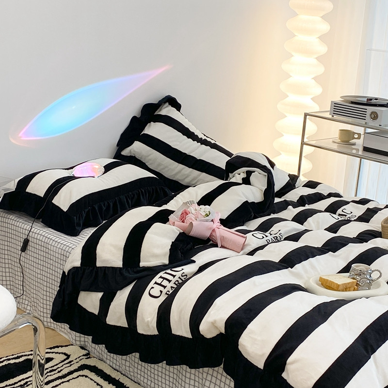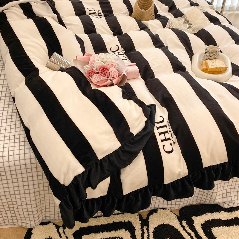 昔可 2021新款黑色花边牛奶绒四件套 香香条纹