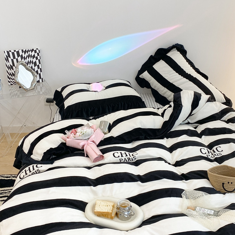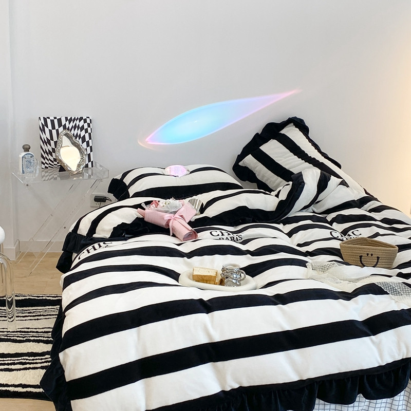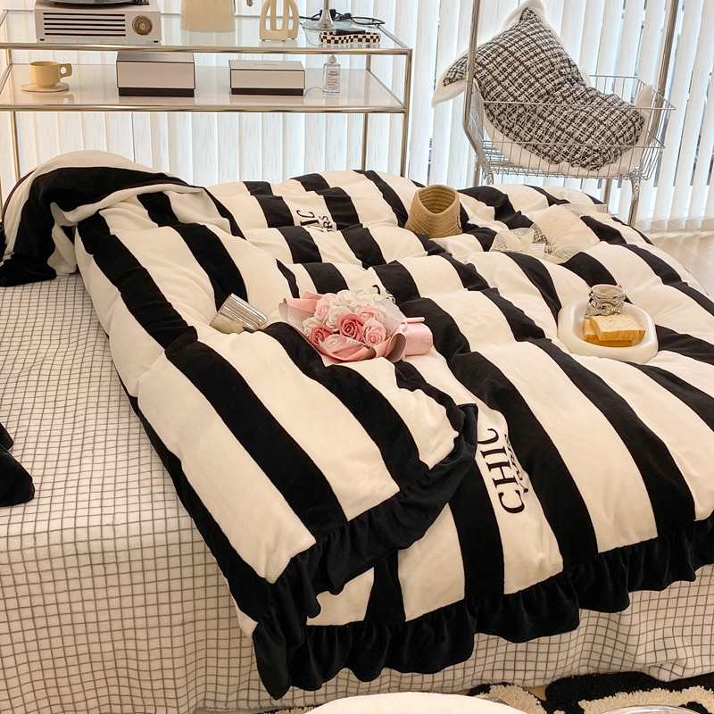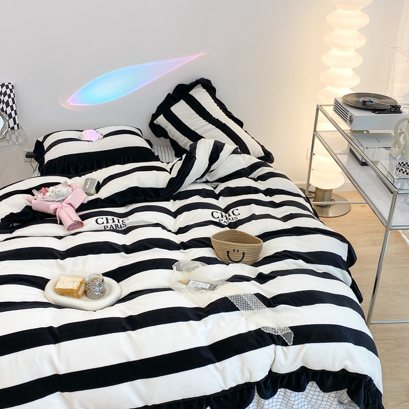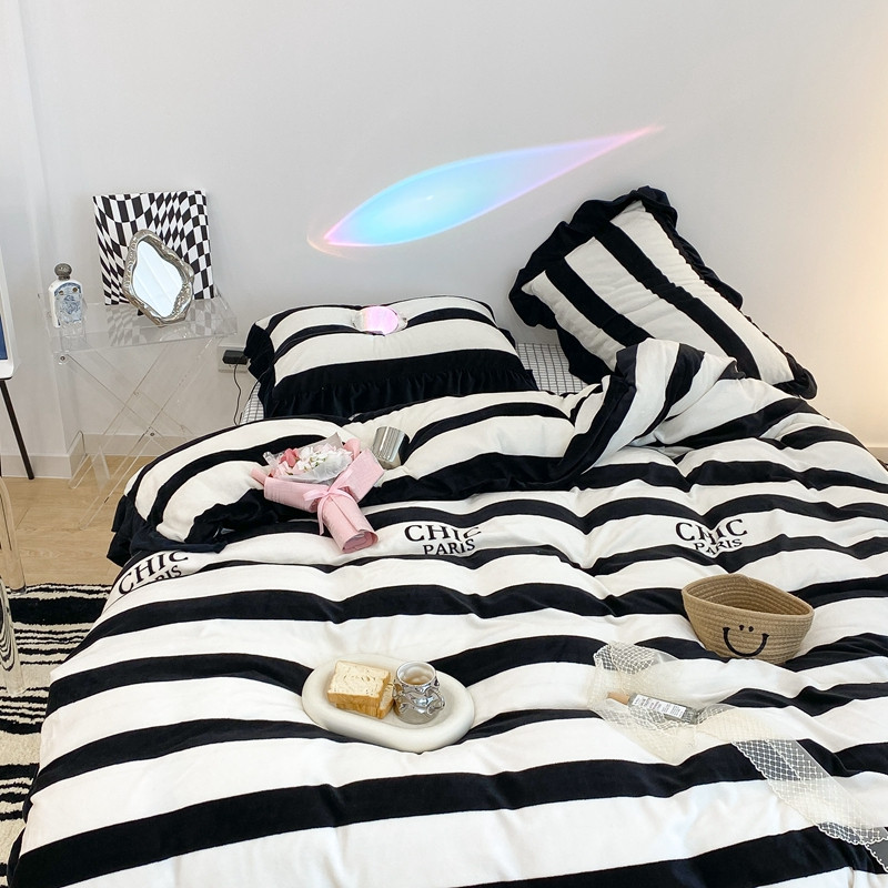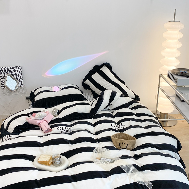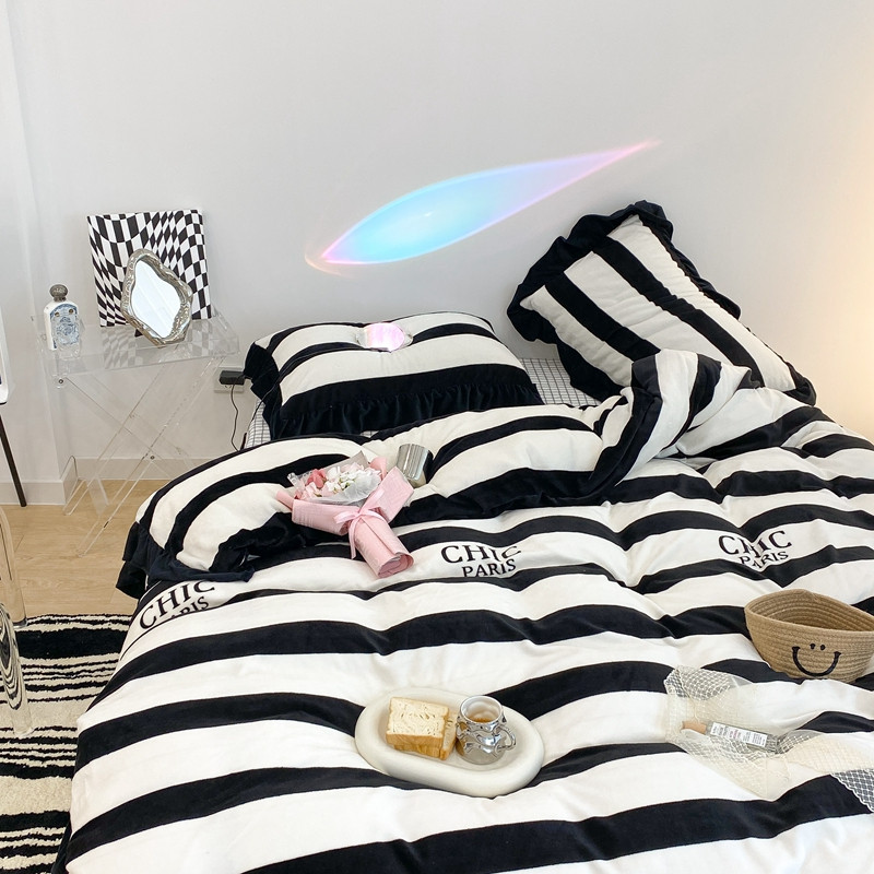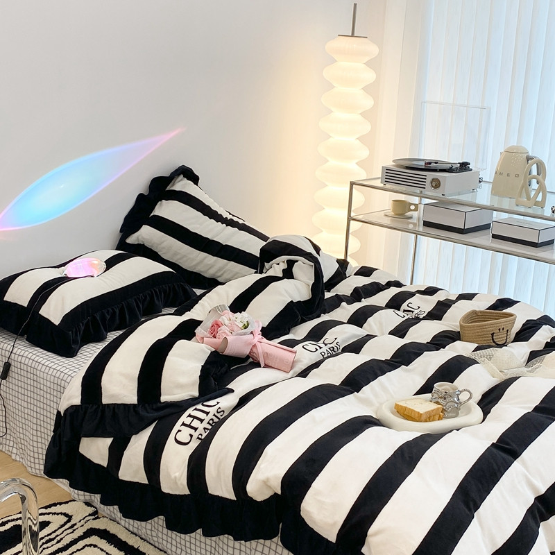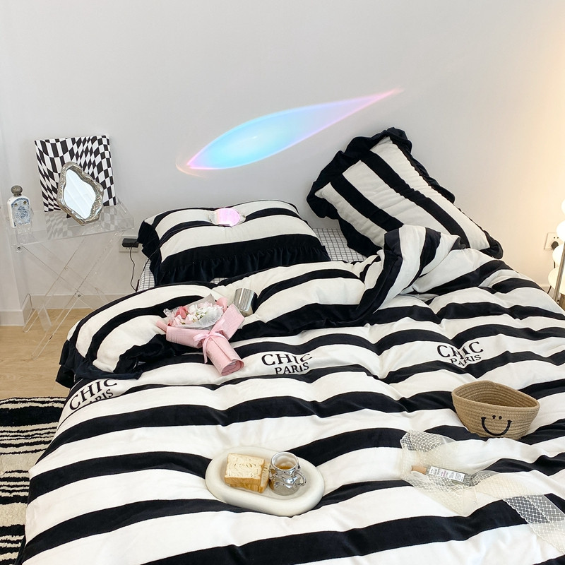 昔可 2021新款黑色花边牛奶绒四件套 香香条纹