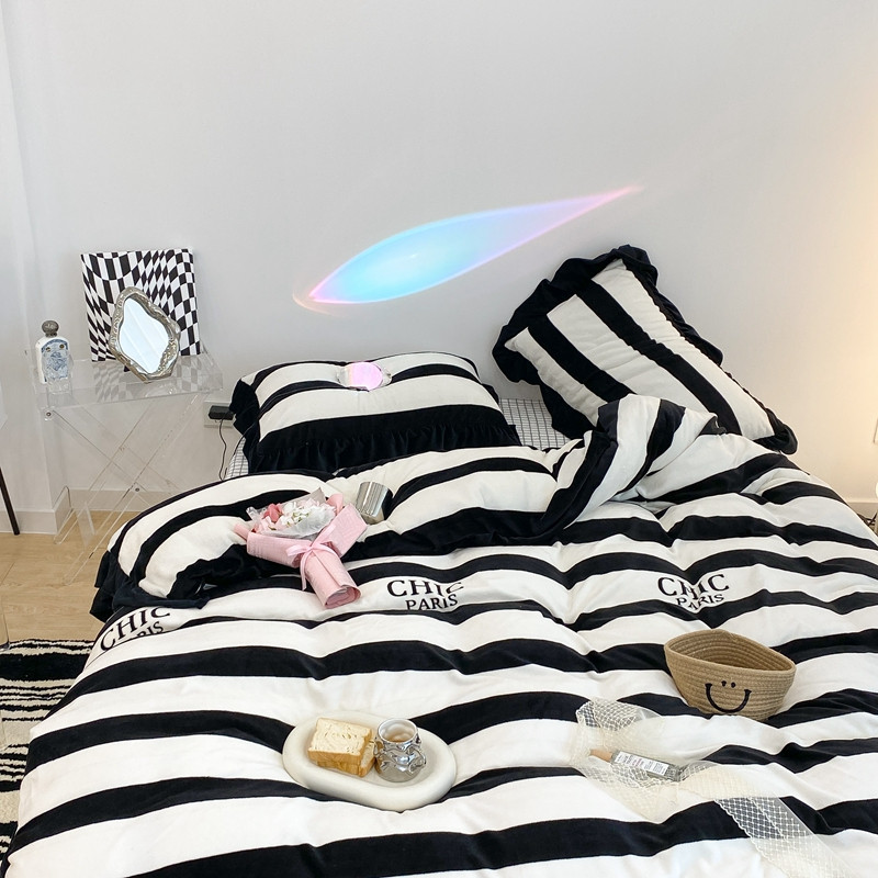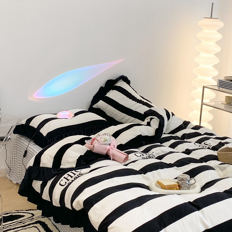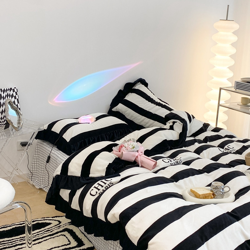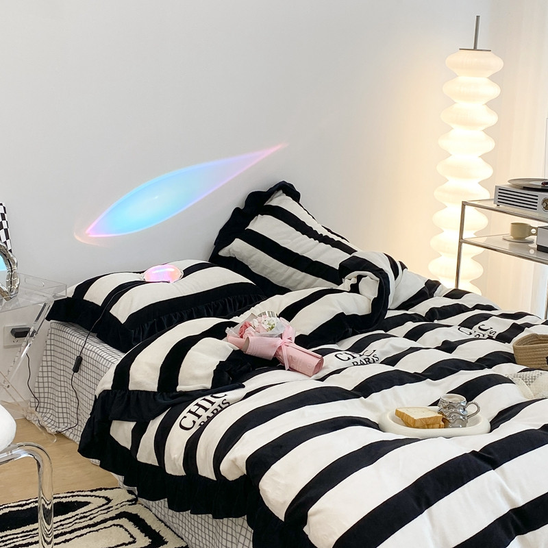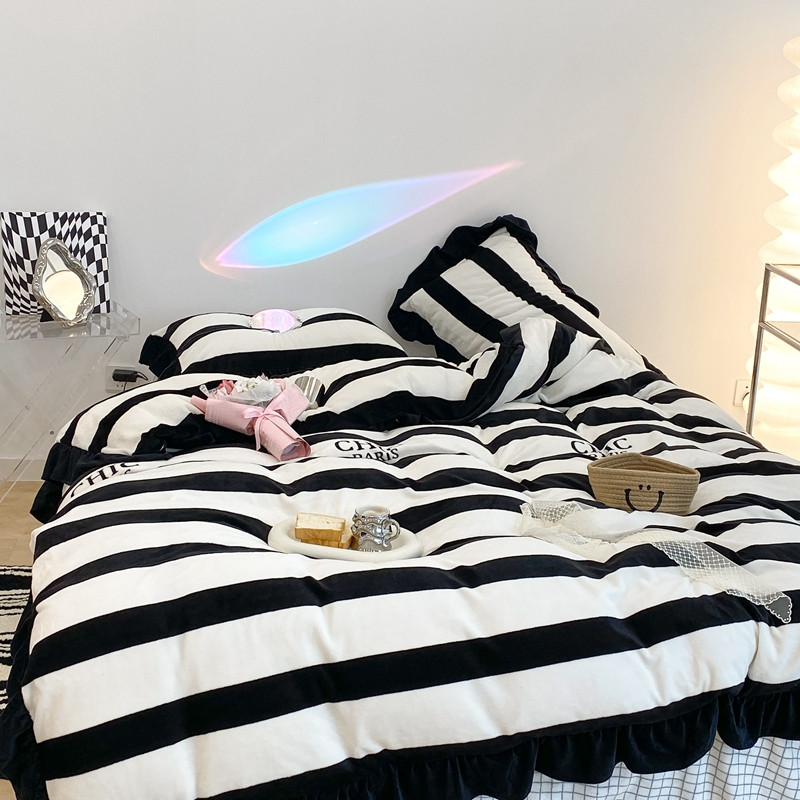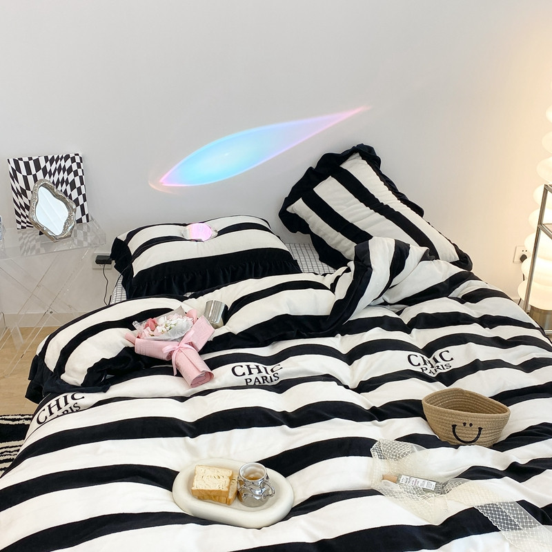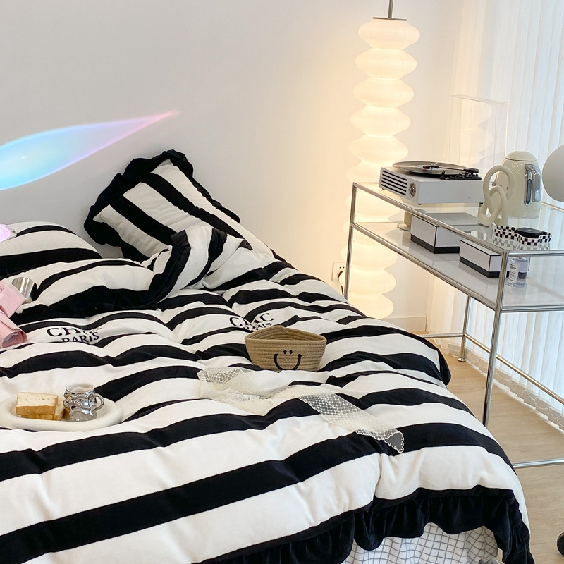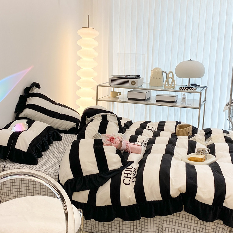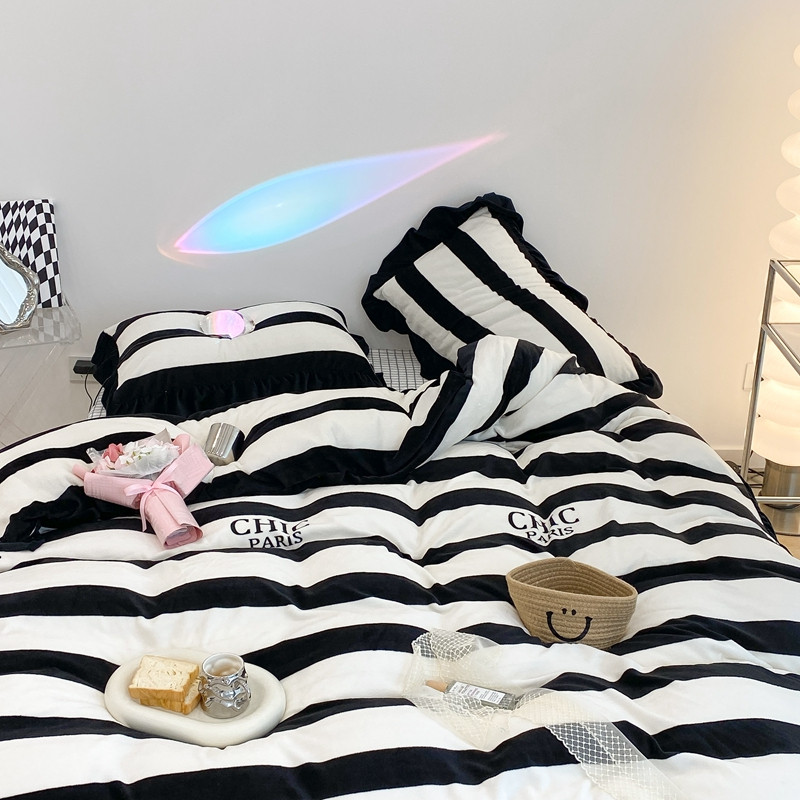 昔可 2021新款黑色花边牛奶绒四件套 香香条纹