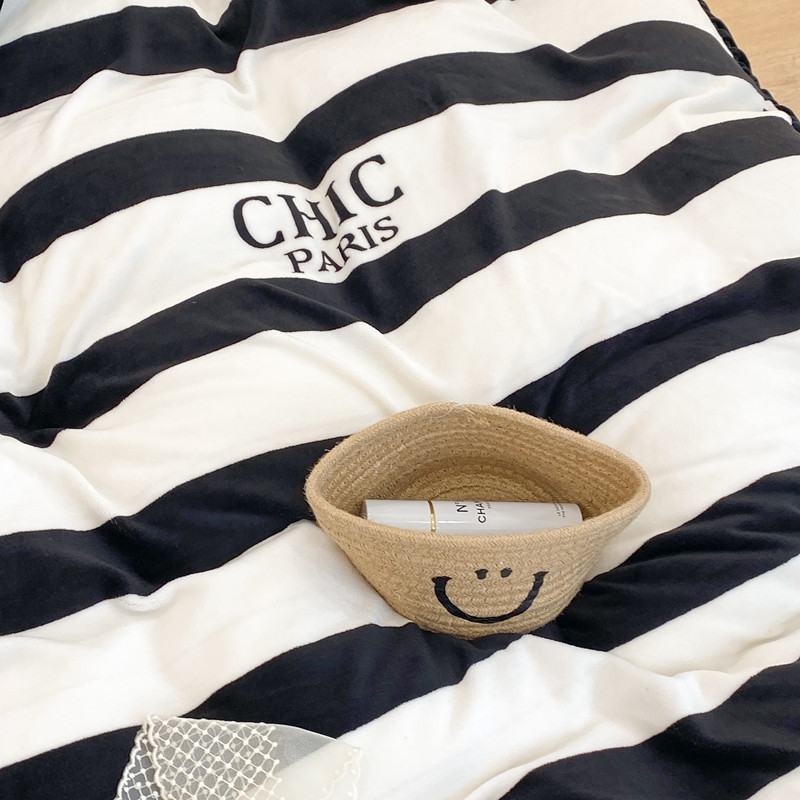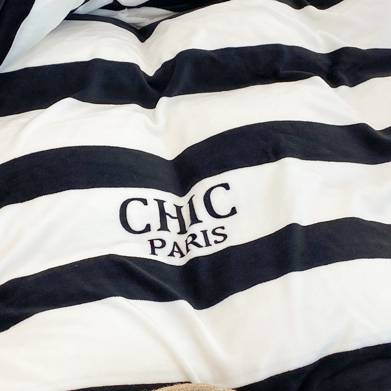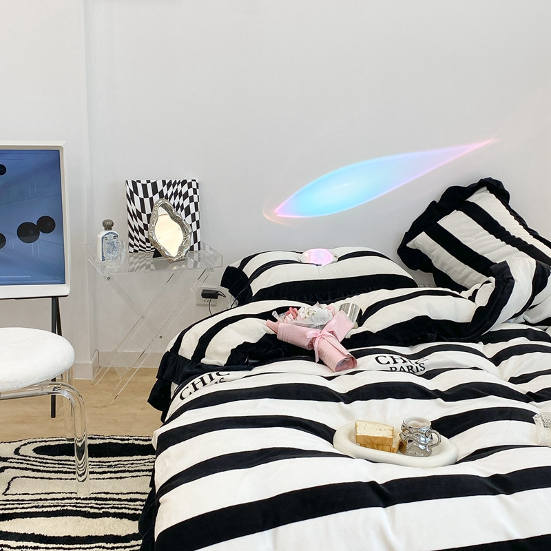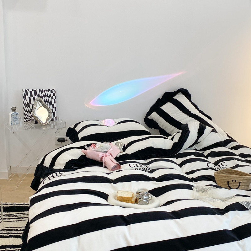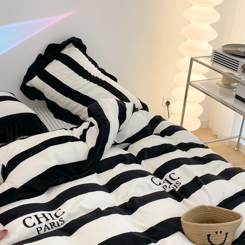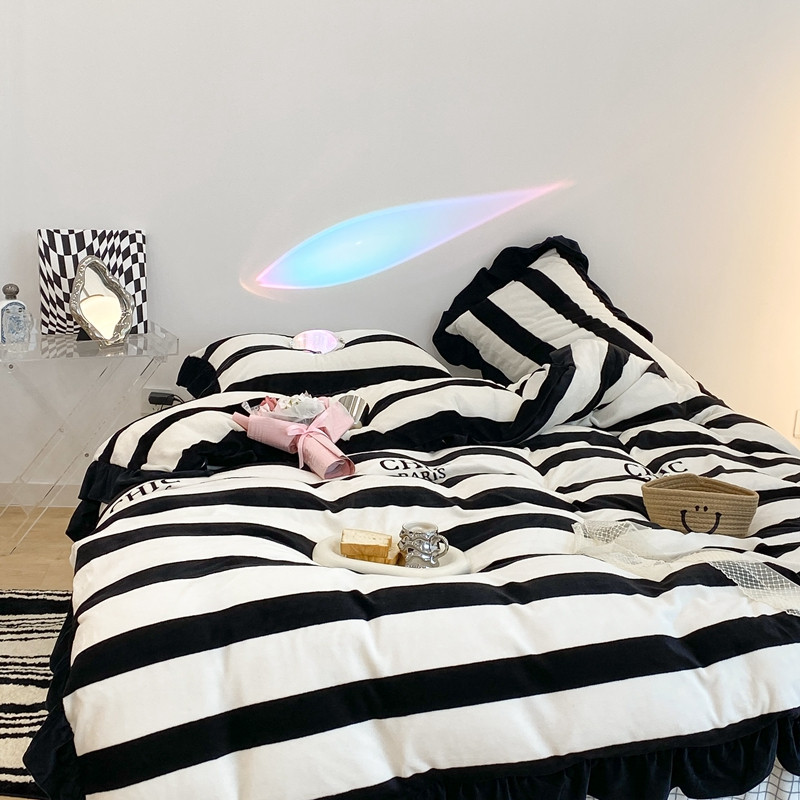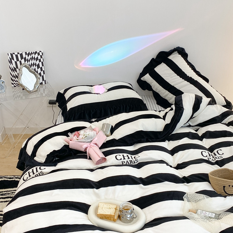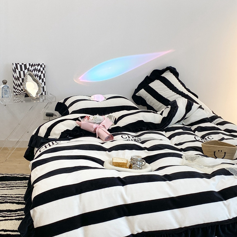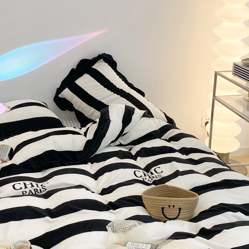 昔可 2021新款黑色花边牛奶绒四件套 香香条纹